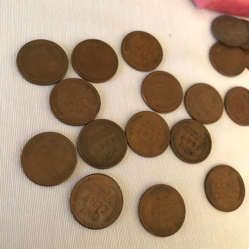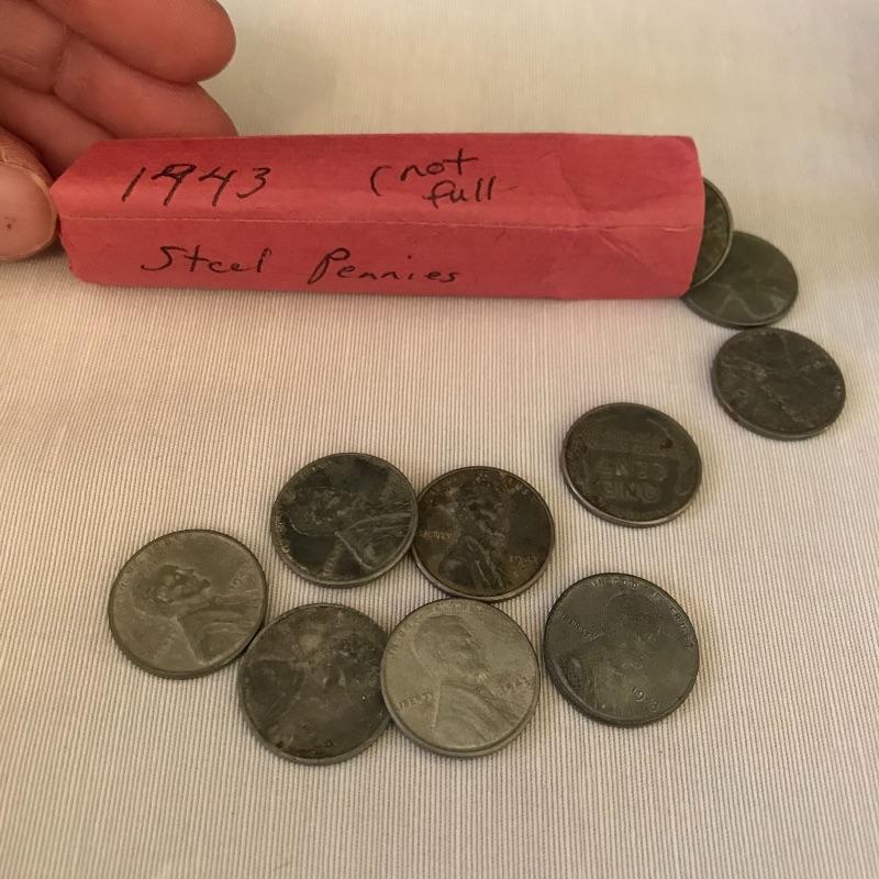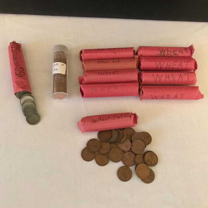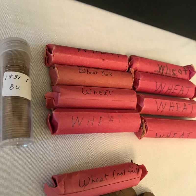 Almost ten full rolls labeled “Wheat”, one of which is taped shut and states 1951 P. Another incomplete roll marked “1943 Steel Pennies (Not Full)”. Contents of rolls are not verified, but have been opened to confirm top few pennies are as stated.
