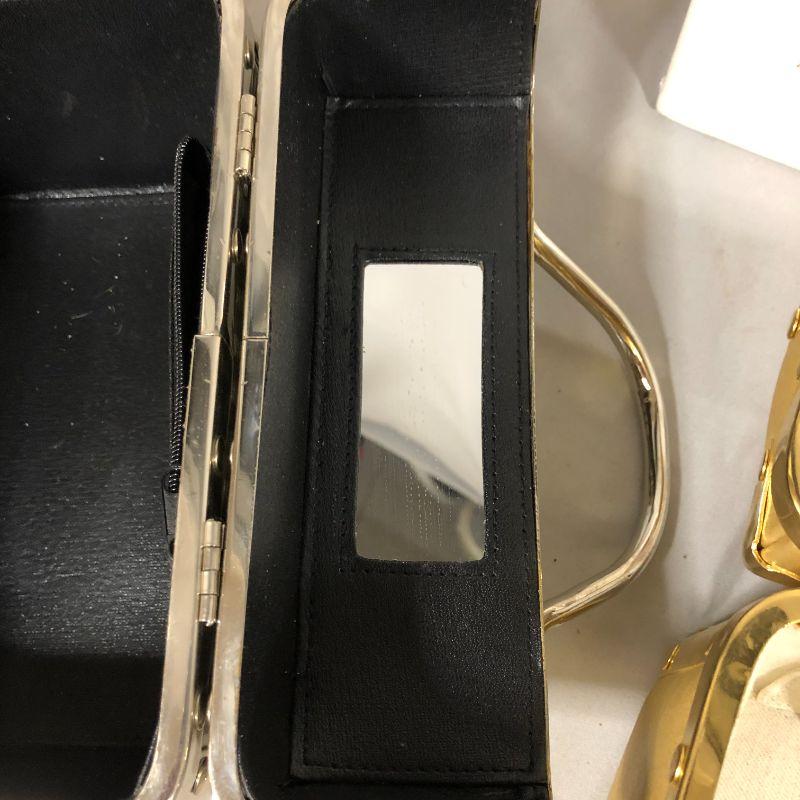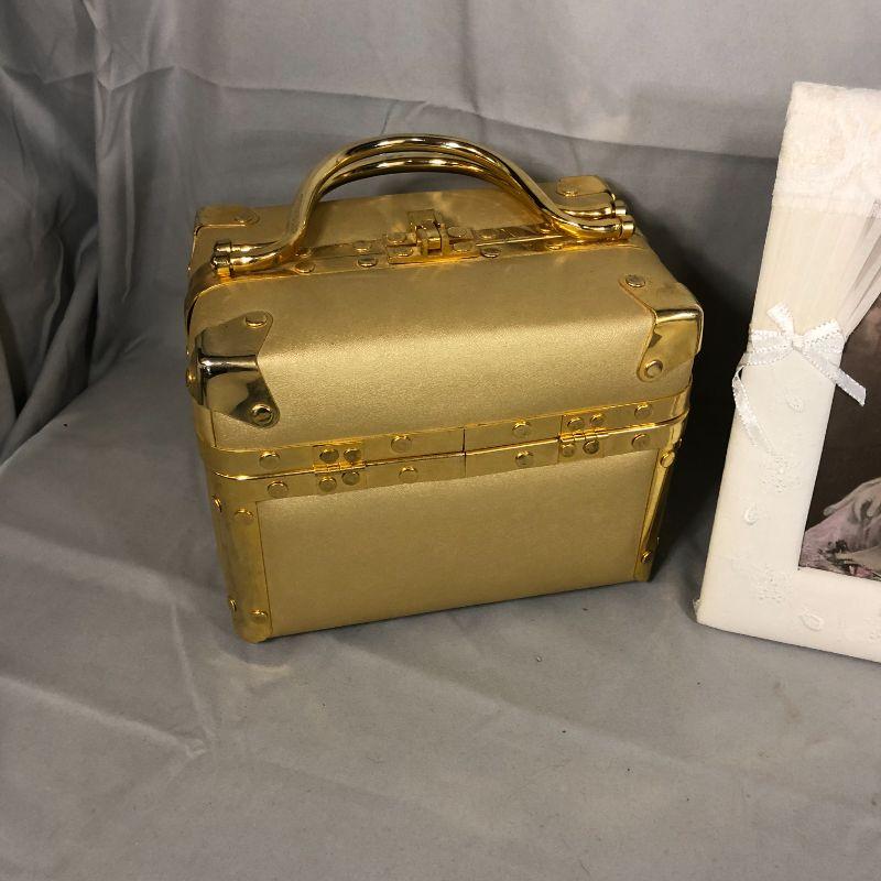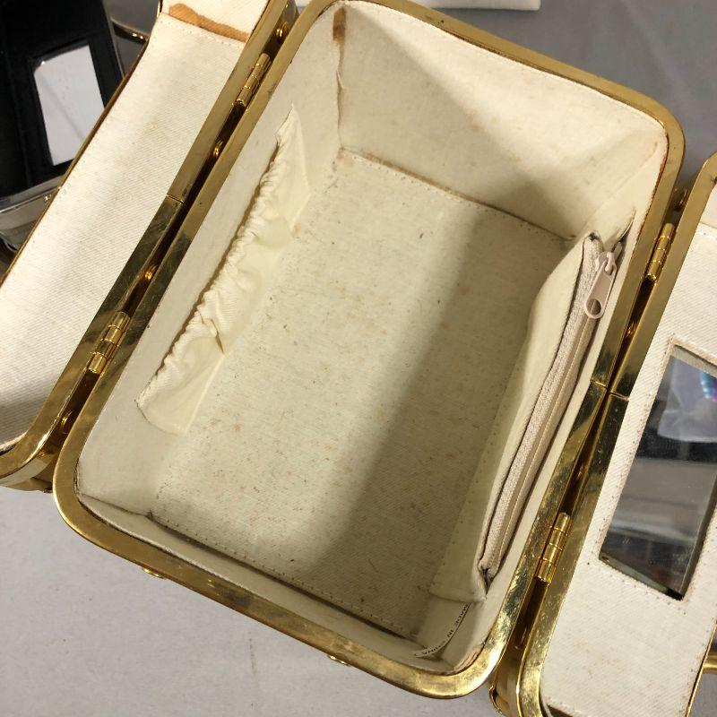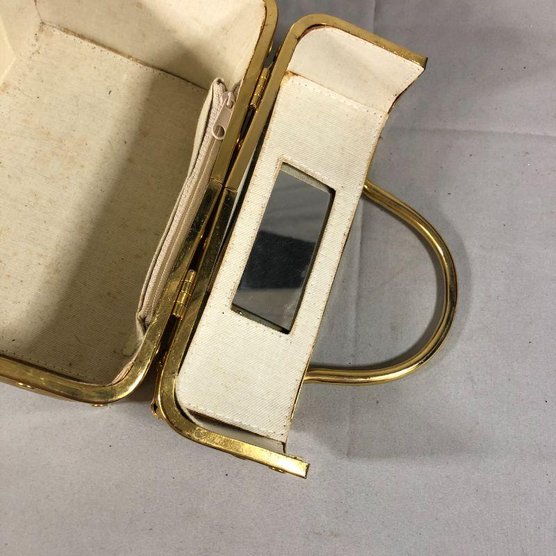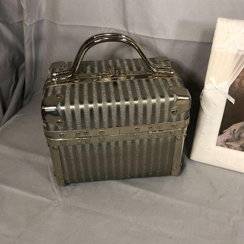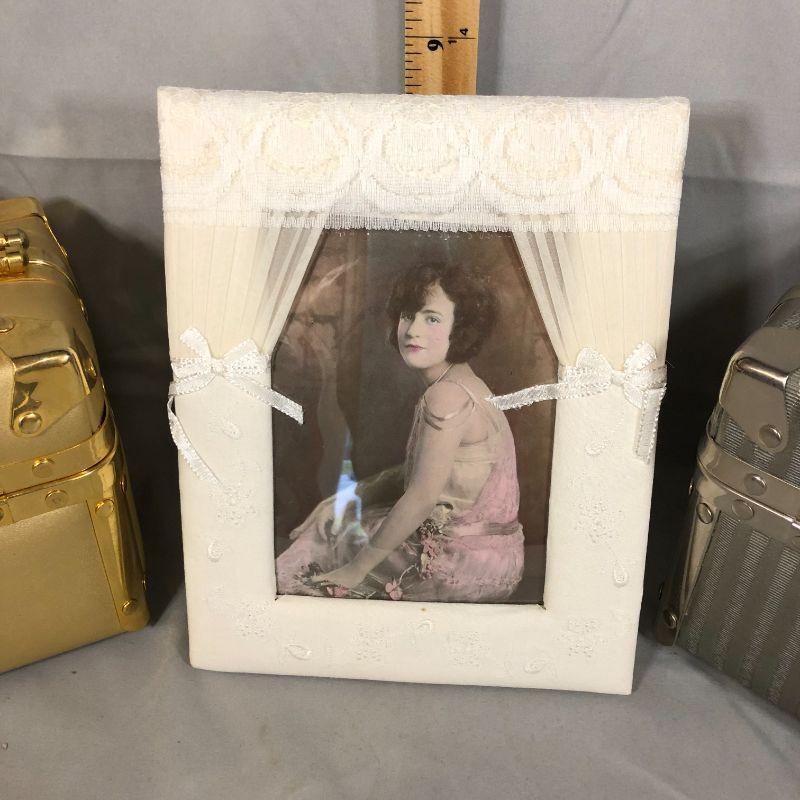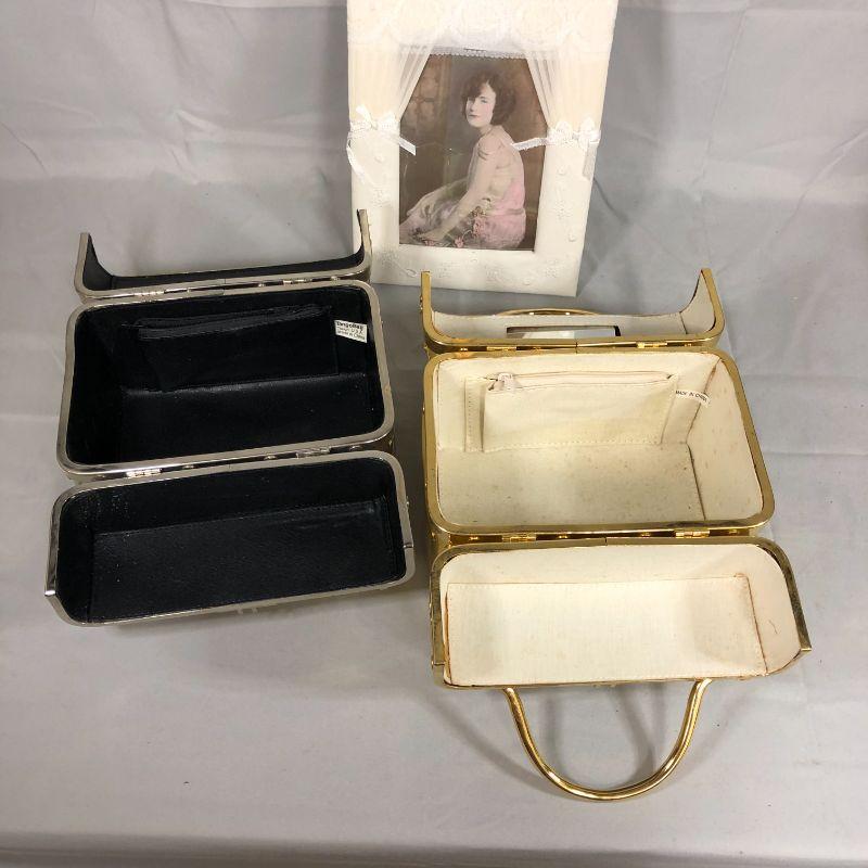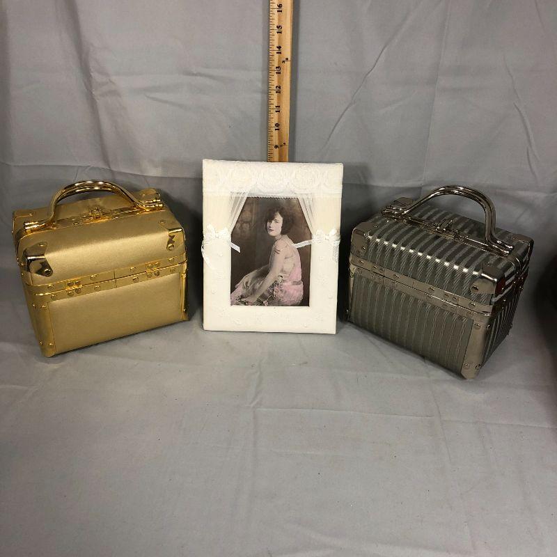 The silver colored make-up bag has a tag inside that says "Tango Bag Touch USA Made in China" and the other only has a "Made in China" tag, but looks identical to the silver case. They are in gently used condition and still in great condition. They each measure about 6.5" tall and 8" wide. The frame has a muslim like cloth and lace as embellishments and is in excellent condition.