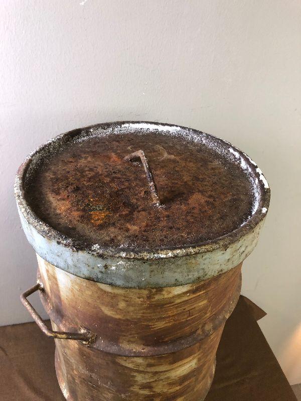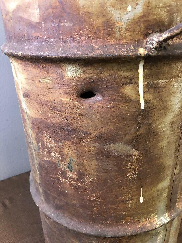 old Good condition has bullet hole in side - Rusty Industrial Steel punk with lit Garbage can