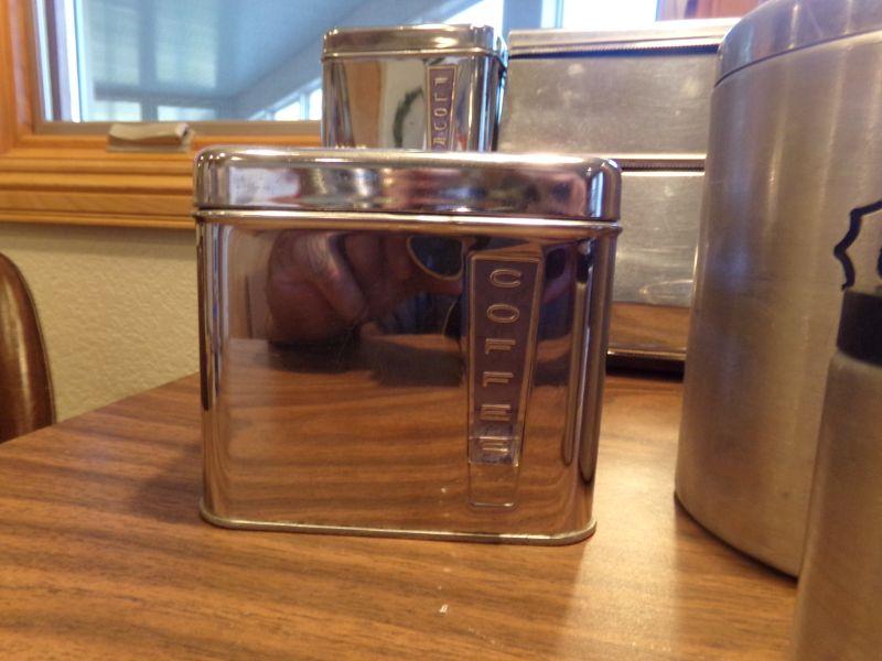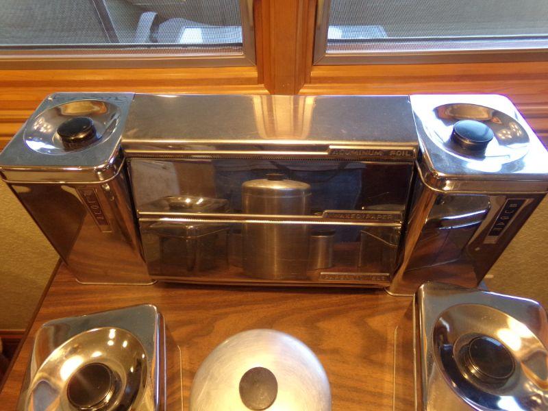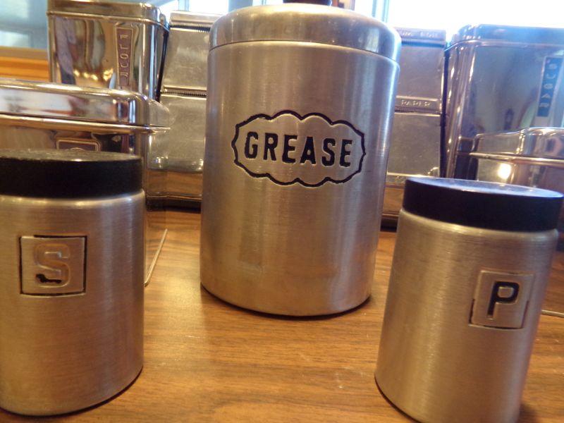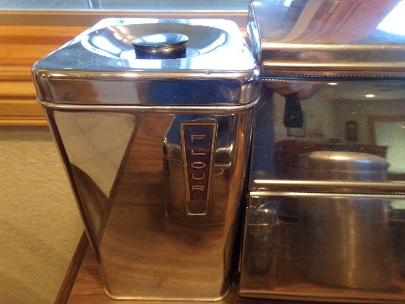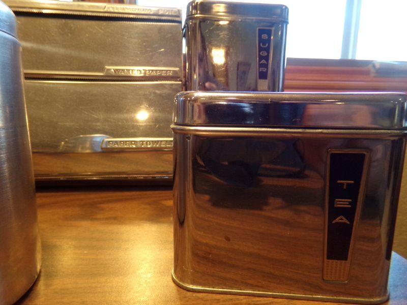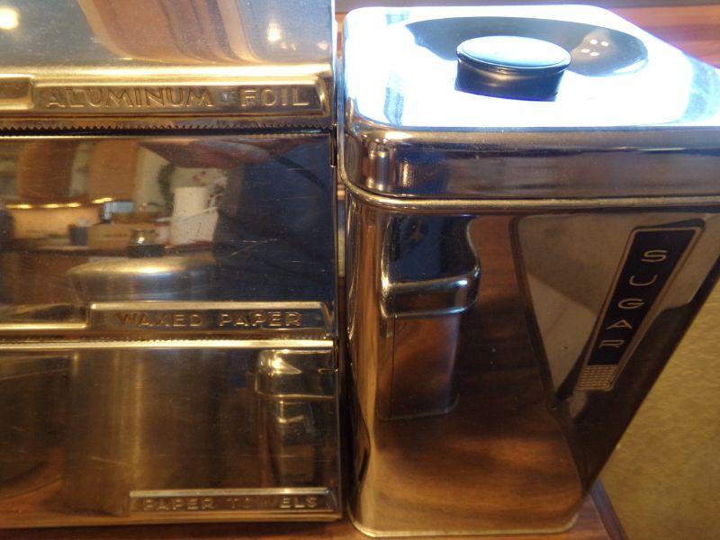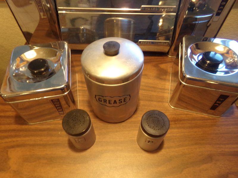 STAINLESS STEEL CANISTERS, FOOD WRAP DISPENSER, GREASE CONTAINER AND SALT & PEPPER SHAKERS