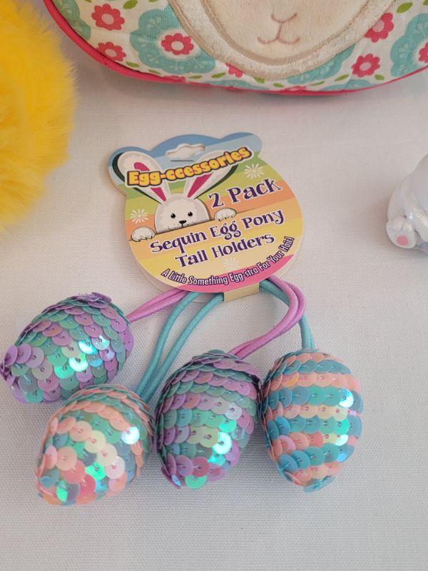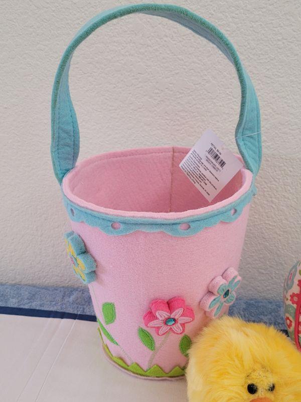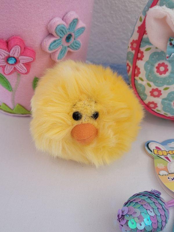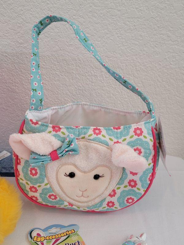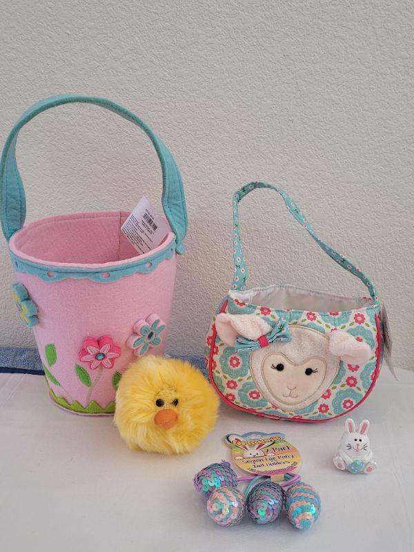 Lot 40: New Felt Easter Basket, Lamb Purse, Sequin Egg Pony Tail Holders,Lip Gloss& Little Chick Plushie