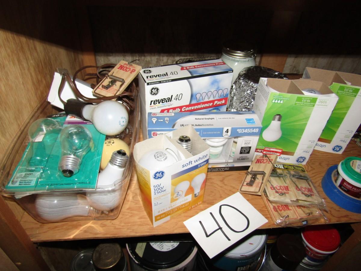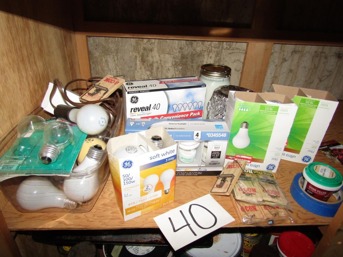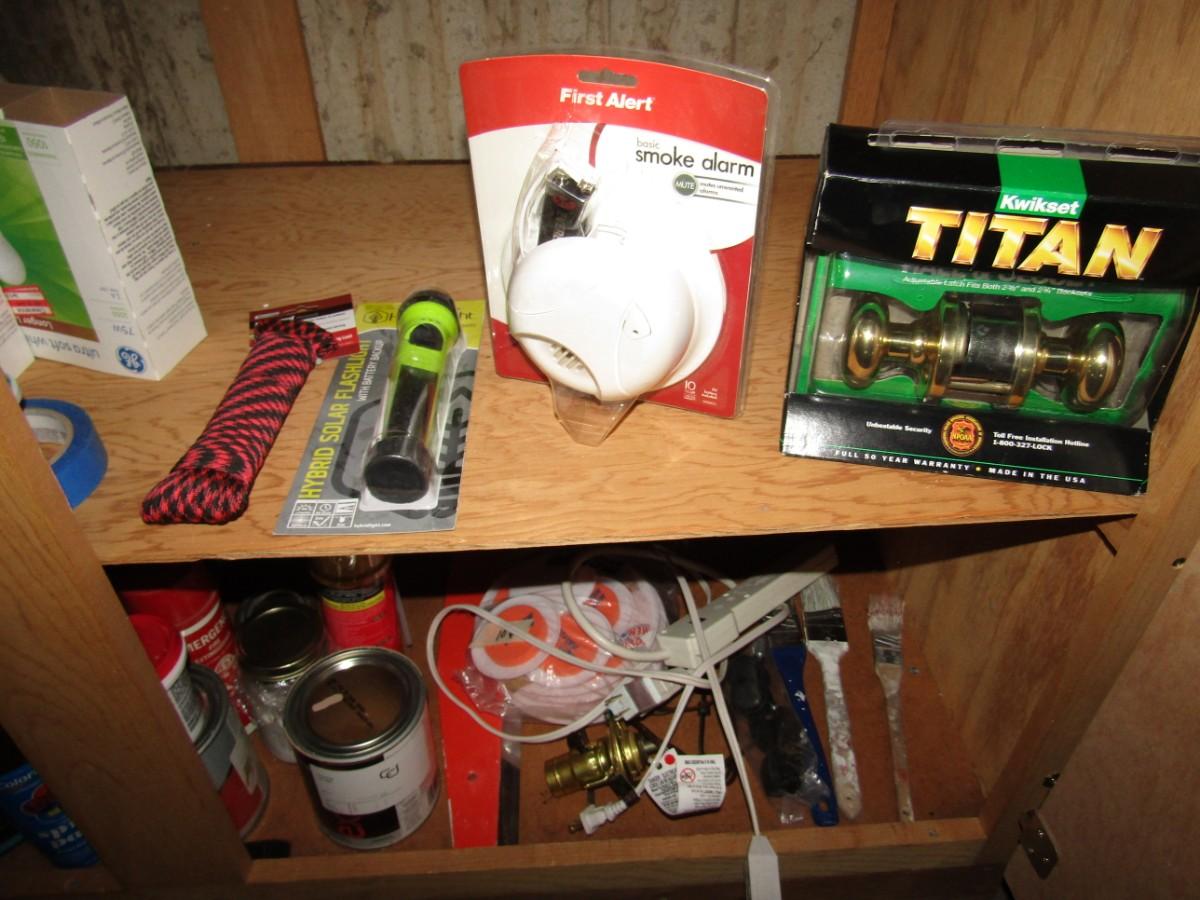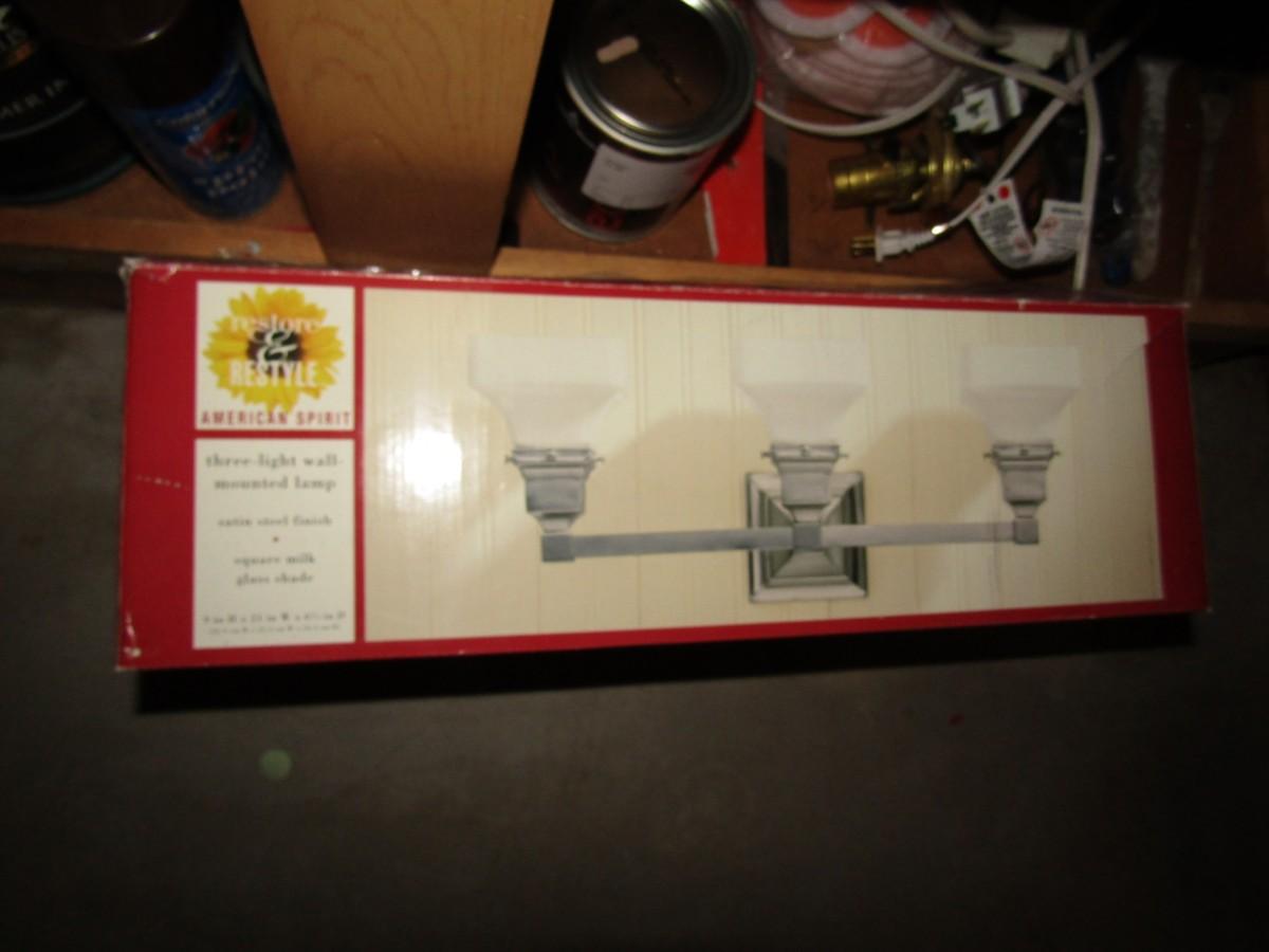 3 LIGHT WALL MOUNT LAMP IN BOX, LIGHT BULBS, NIB HALL OR CLOSET DOOR KNOB, VARIETY OF PAINT AND OTHER HOUSEHOLD ITEMS.