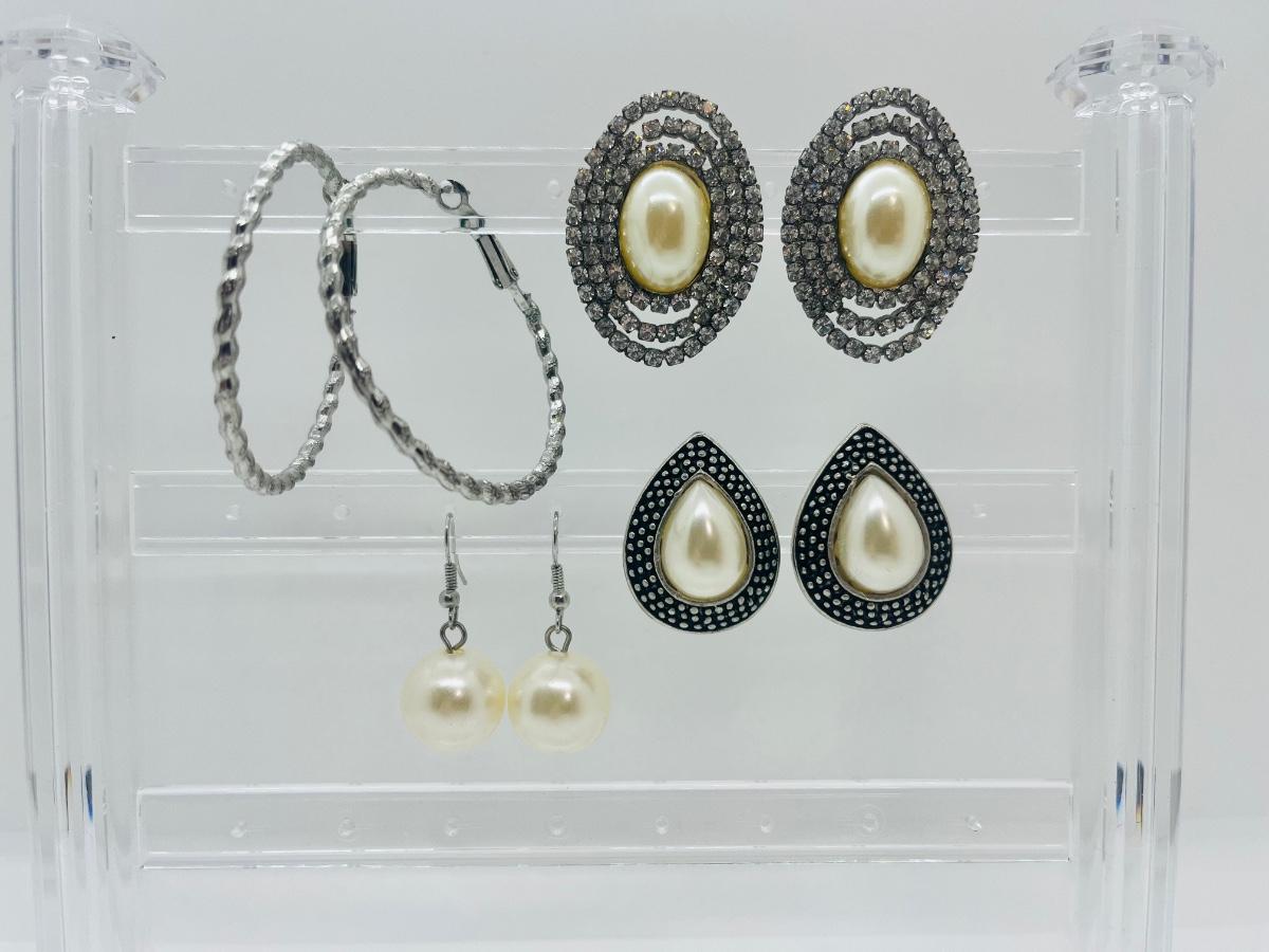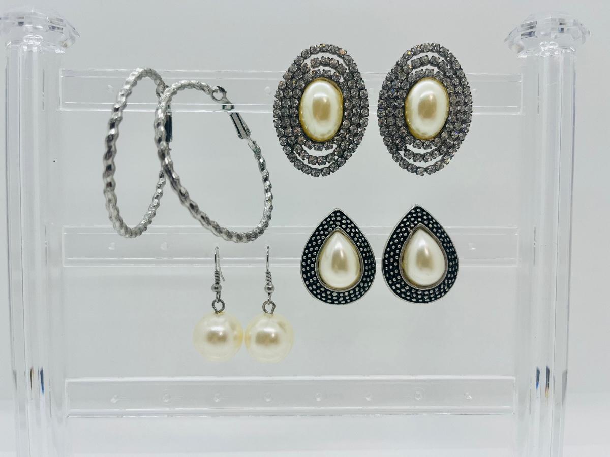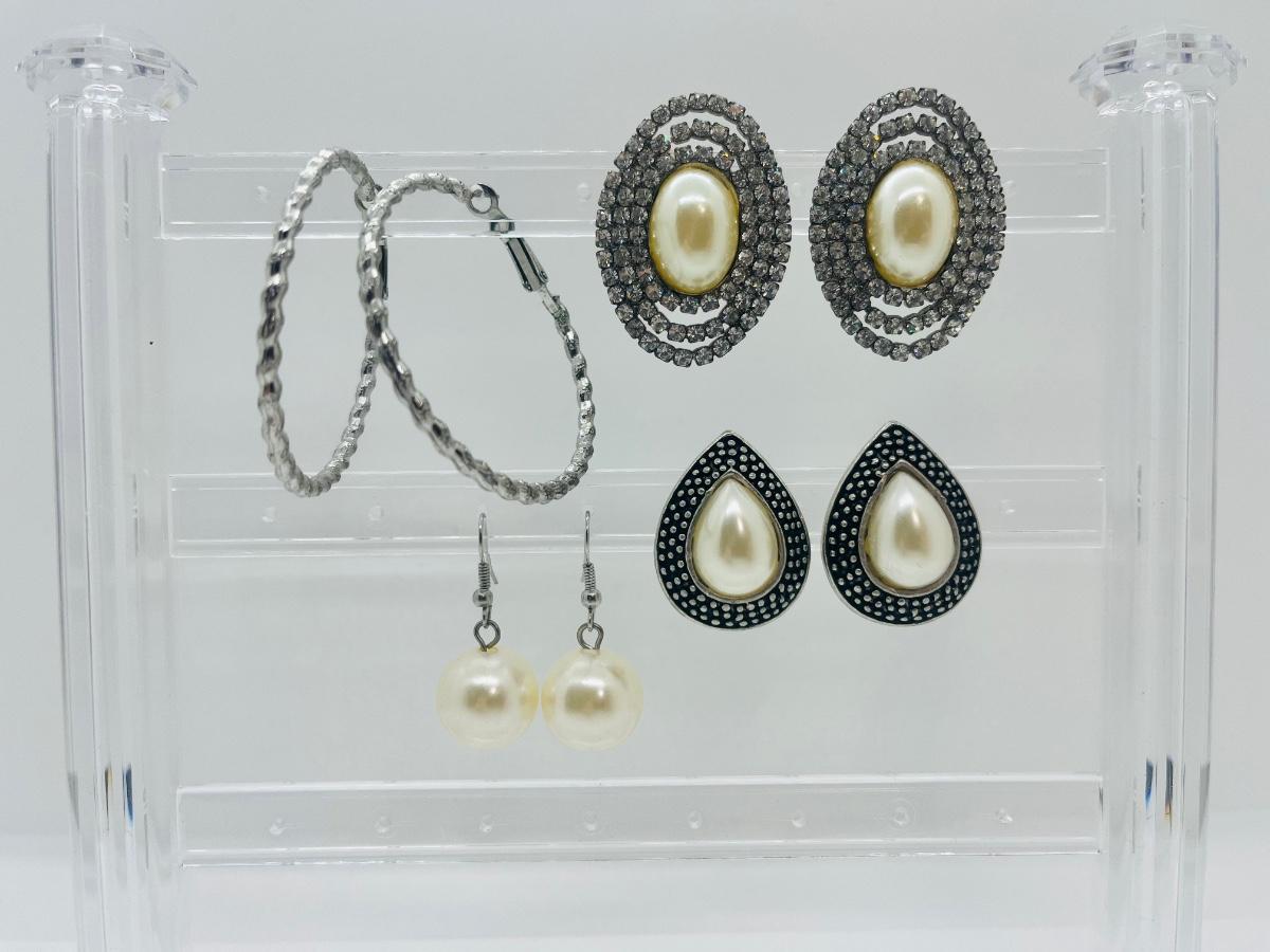 3 pair pierced and one pair clip-on earrings. The pictures show condition, measurements if taken, and what is included in the lot. Due to the large amount that we photograph and the time frame, we are not always able to take measurements. All items unless noted, are pre-owned and have been used, and are untested. Thank you