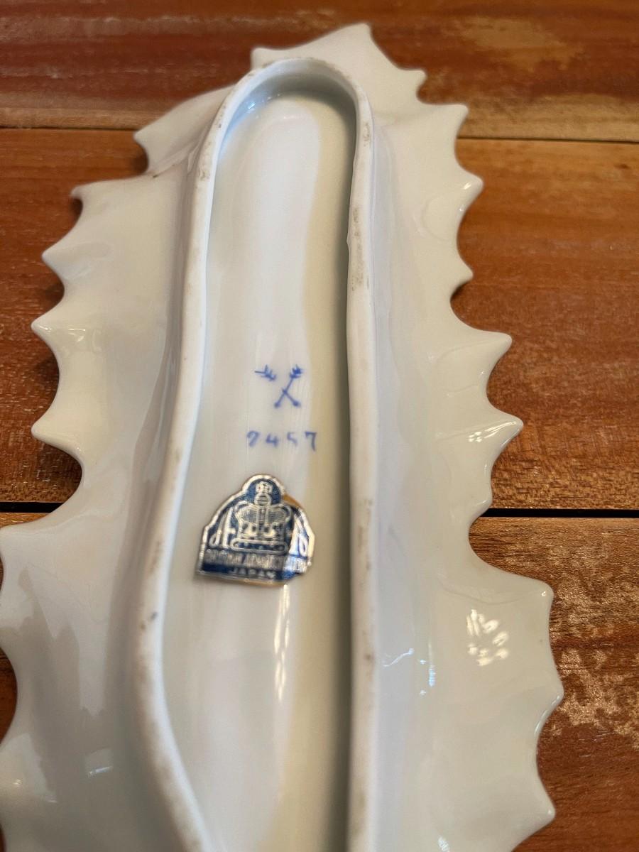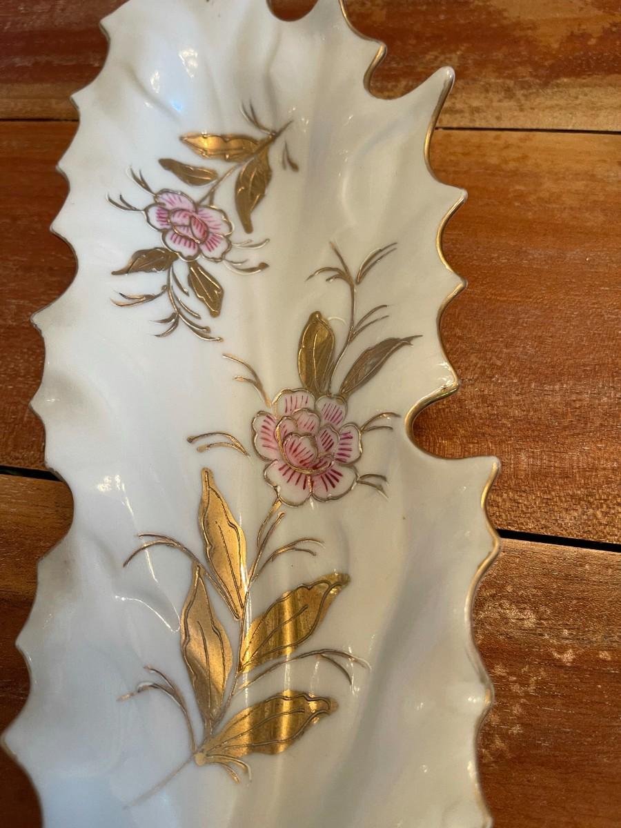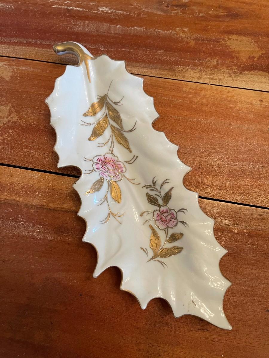 -Leaf Shape Trinket Dish (Measures: 1" H x 10 3/4" W x 4 1/4" D); Crossed Arrows #7457; white with gold trim/accents and pink flowers