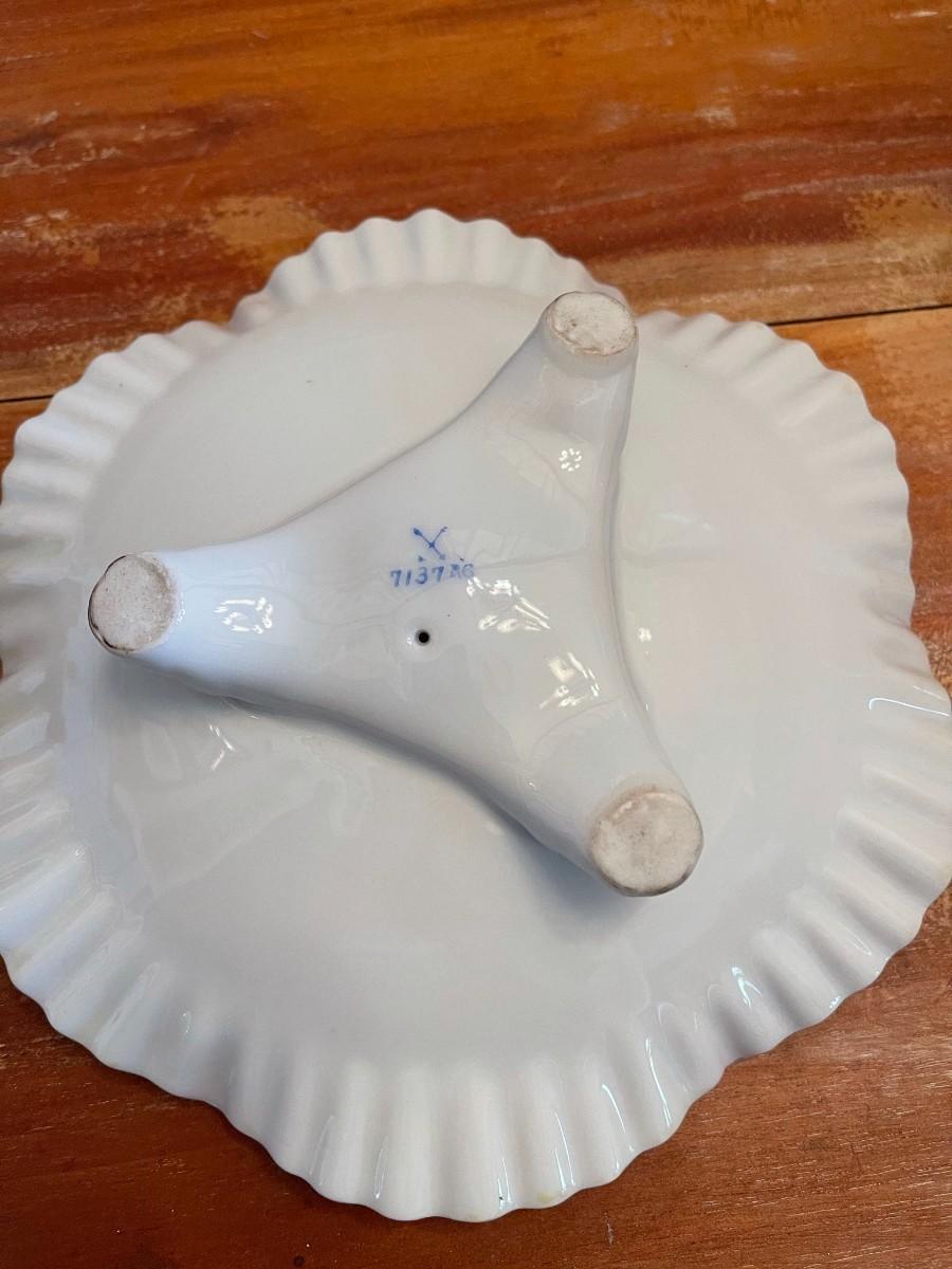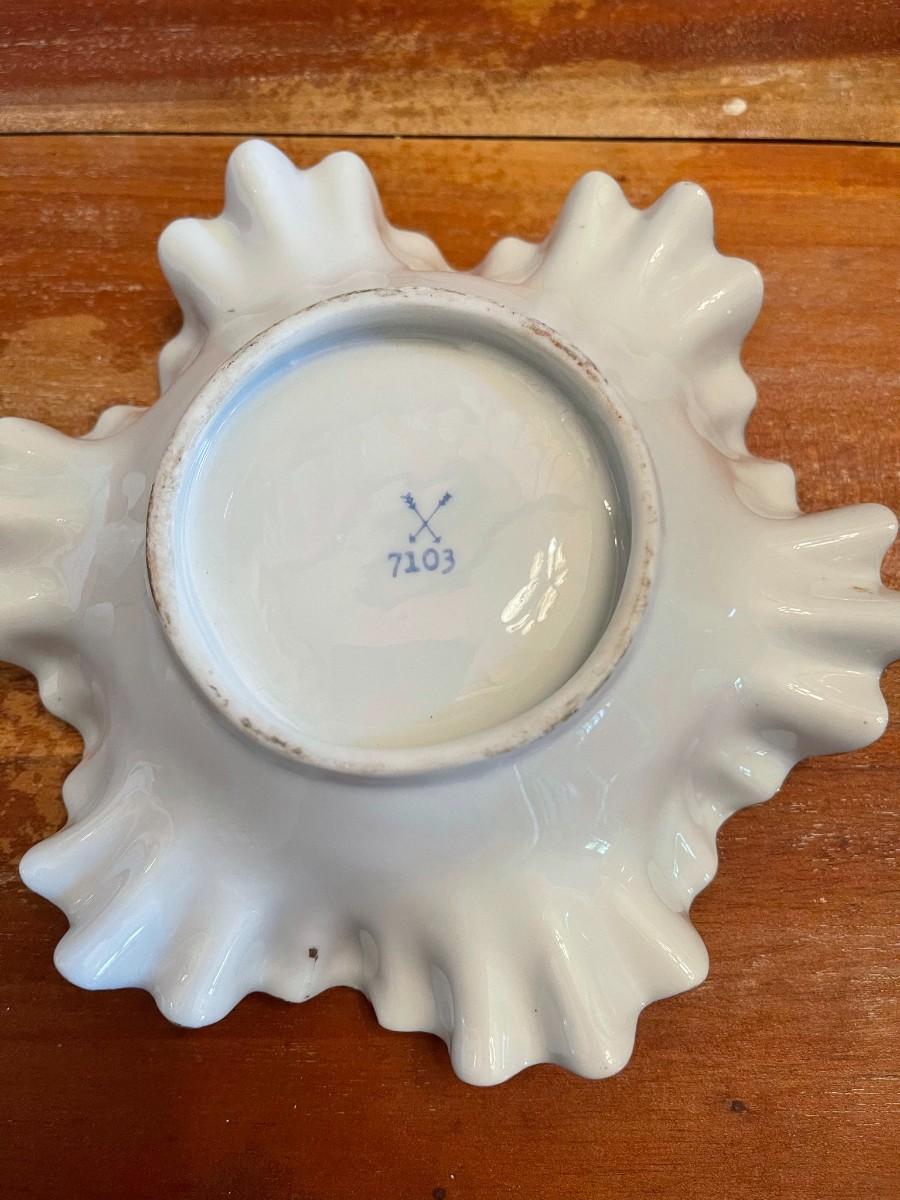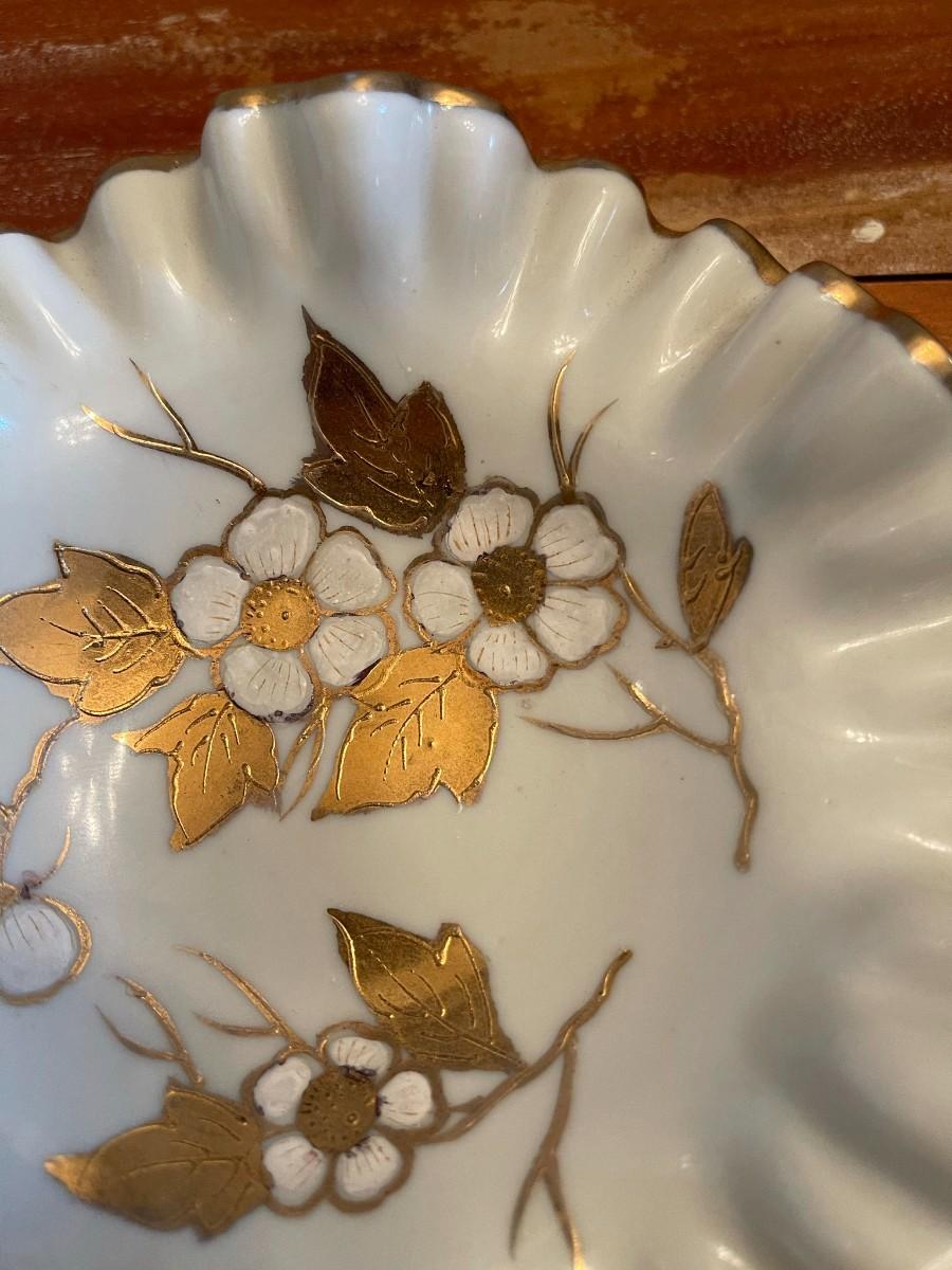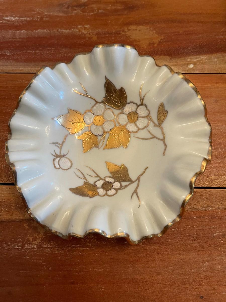 -Small Round Trinket Dish (Measures: 2" H x 6 1/2" Diameter); Crossed Arrows #7103, white with gold trim/accents and white flowers; wavy rim