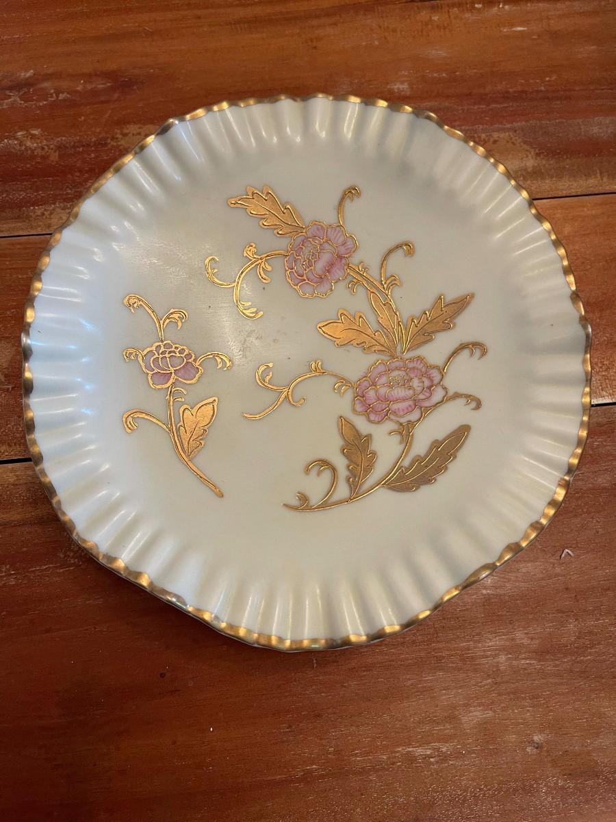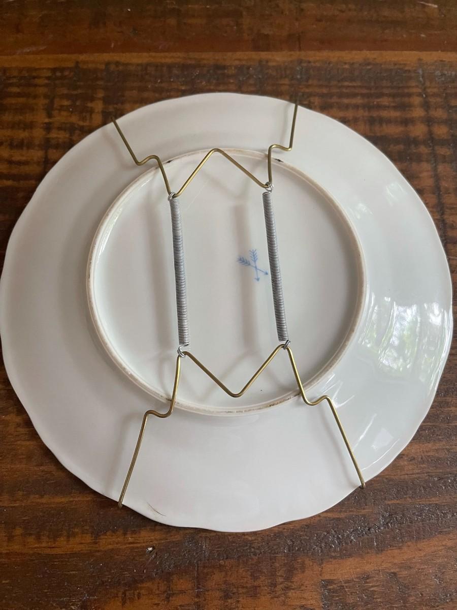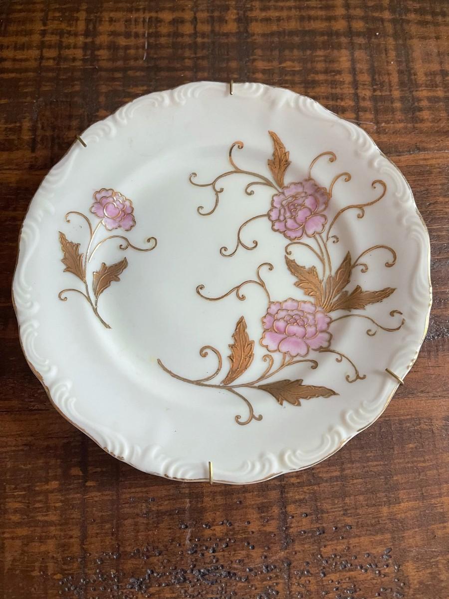 -Small Plate (Measures: 1" H x 7 1/2" Diameter); Crossed Arrows, white with gold trim/accents and pink flowers; Has attached plate wall hanger