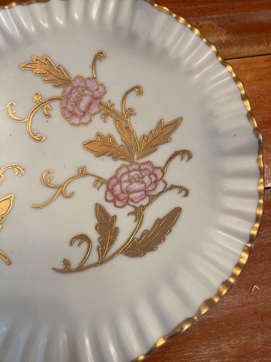 -Footed Large Dish (Measures: 2" H x 9" Diameter); Crossed Arrows #7137AG, white with gold trim/accents and pink flowers; wavy rim