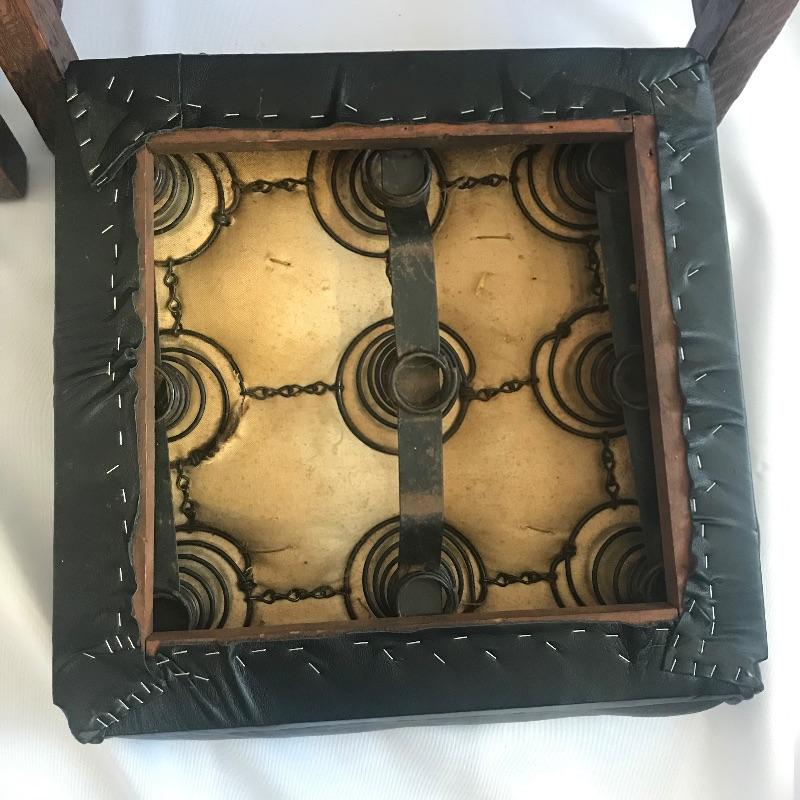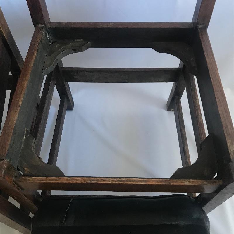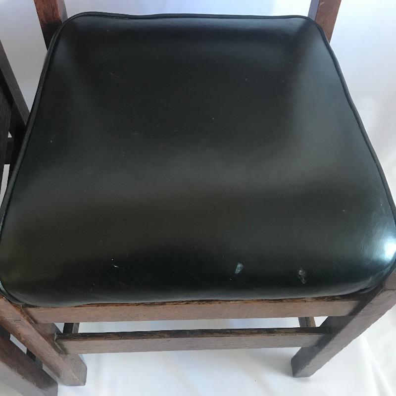 Pair of Arts & Crafts Gustav Stickley chairs with original leather seats with springs. They have been heavily refinished and do not have the marks but confirmed as Stickley by an expert in the field. This great pair of chairs are the work of a true craftsman, with its simple but elegant look and soft supple leather seat. Chairs measure 17.5” x 18.25” x 34.75 with a seat height of 19.5”. This lot goes with lots 33 and 42. No markings found.