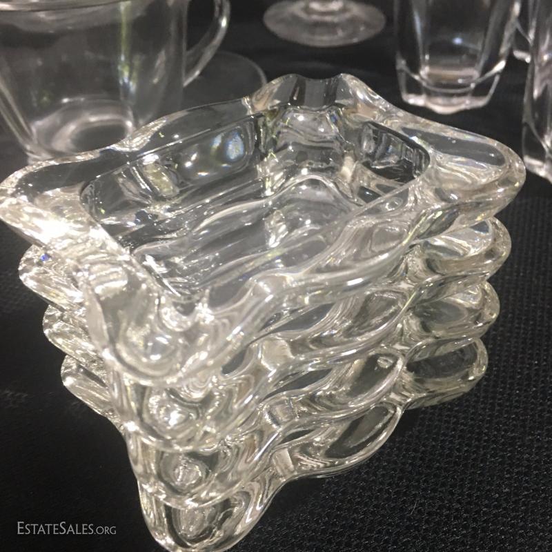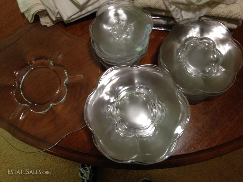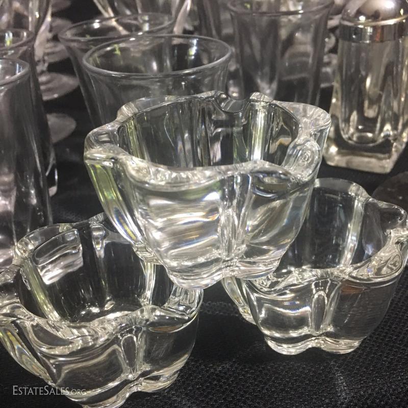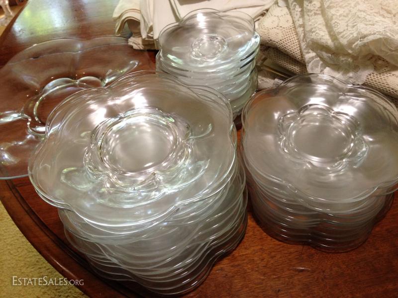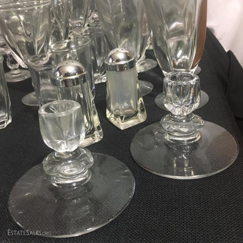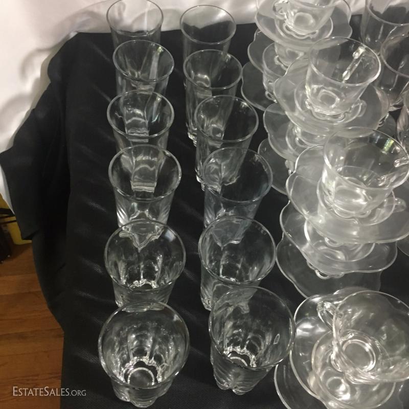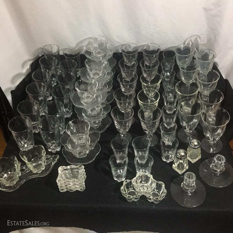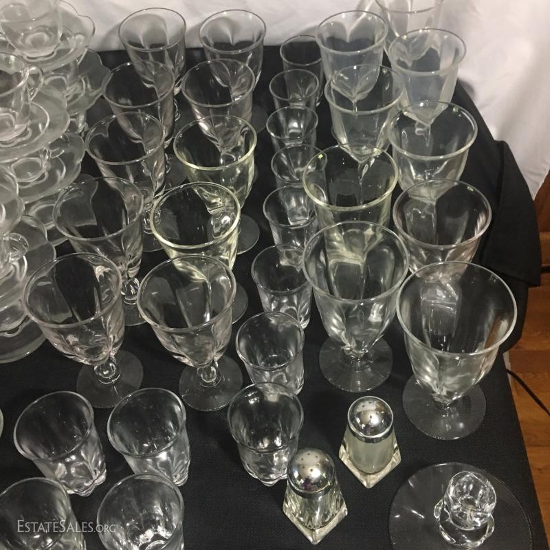 138 pieces of Duncan Miller drinking glasses and plates. A few other pieces include salt and pepper, small dishes, candle holders and serving pieces. All same design. 14 x 9" plates, 12 x 8" plates, 14 x 6" plates, 15" platter.