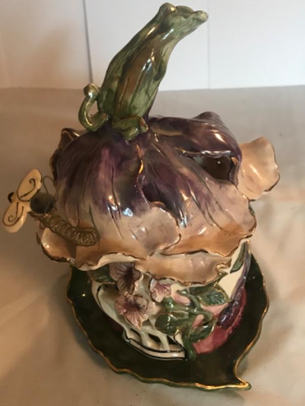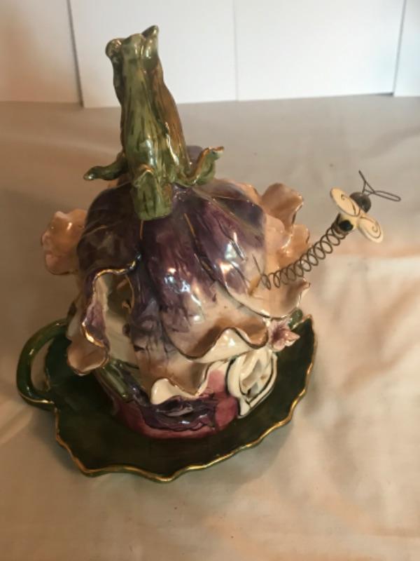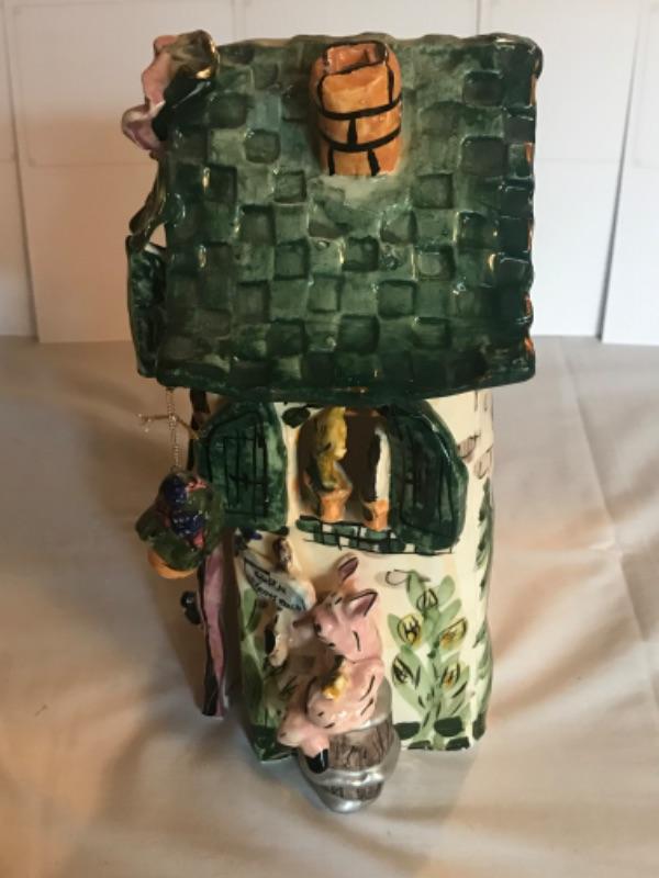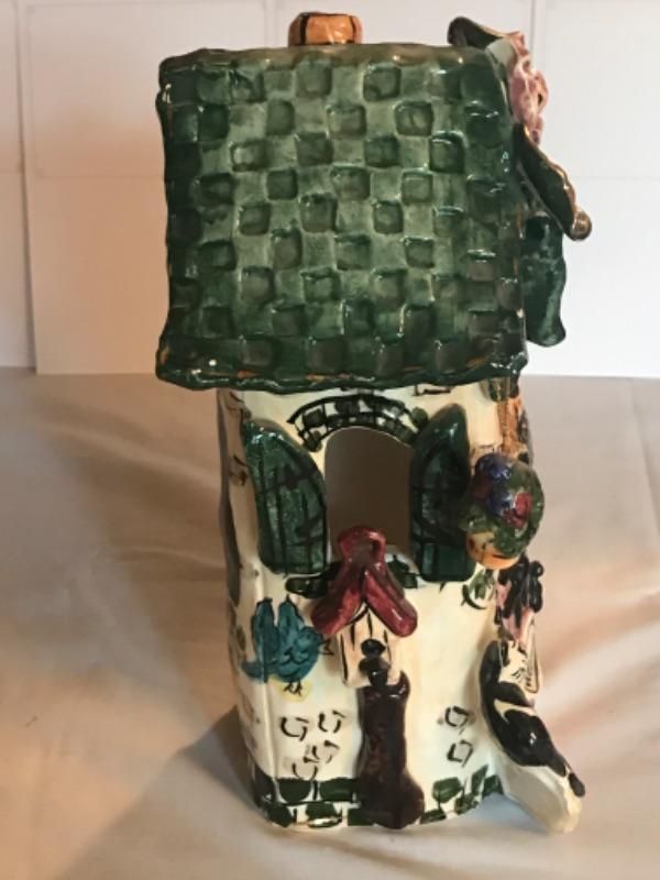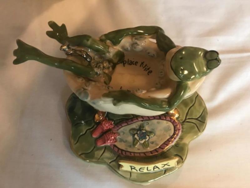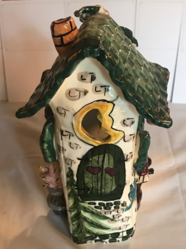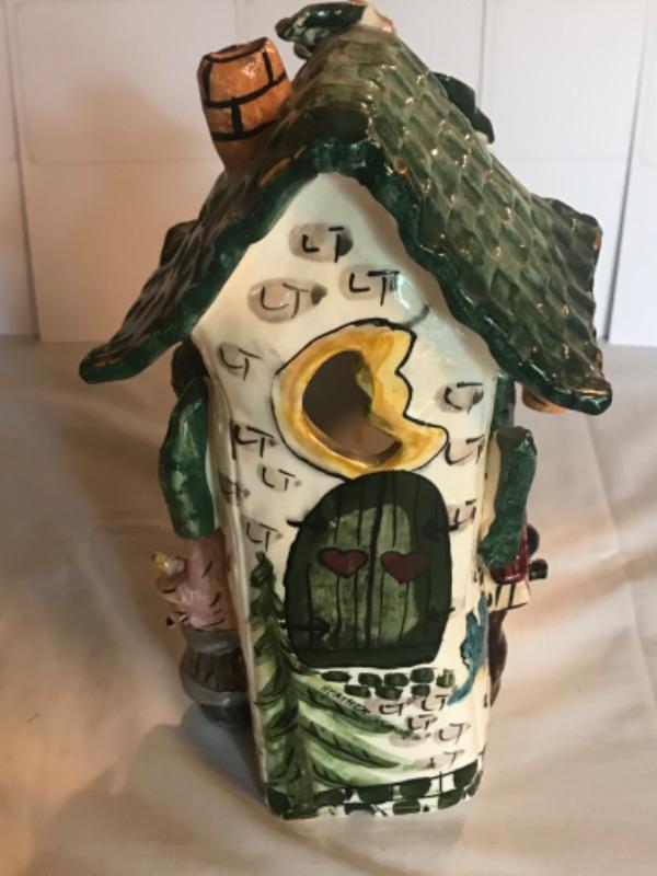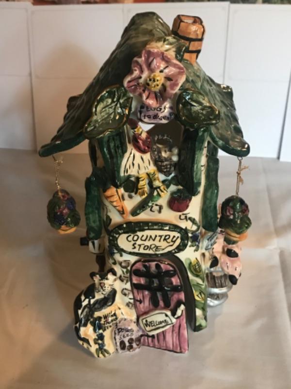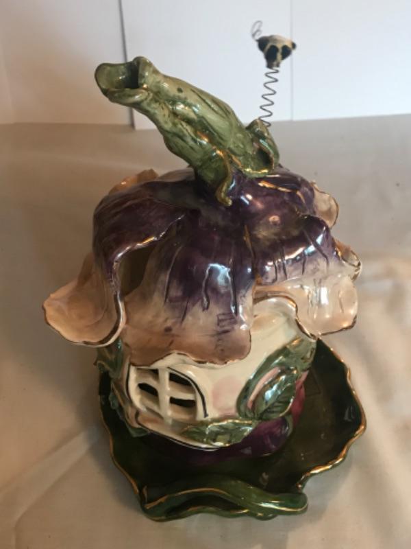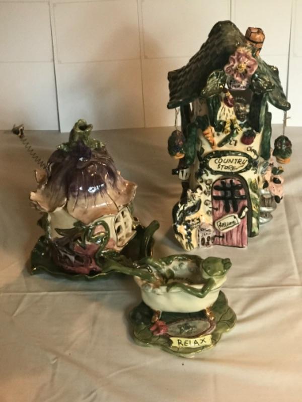 Country Store 11-1/2” tall, does not have its base. Purple Fairy Blossom House 9” tall. Relaxing Frog 3-1/2” tall. Signed Heather Goldminc