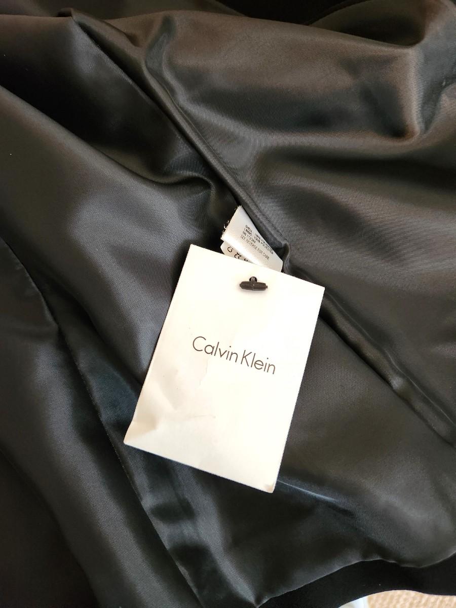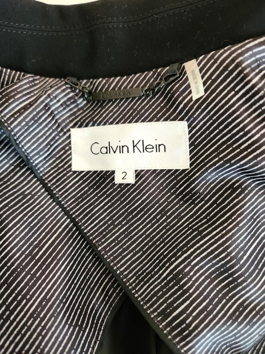 This Calvin Klein dark gray ladies suit still have the button tag in the skirt - never worn. Small - Size 2 - excellent condition. Side zipper on the skirt. Blazer has logo'd buttons.