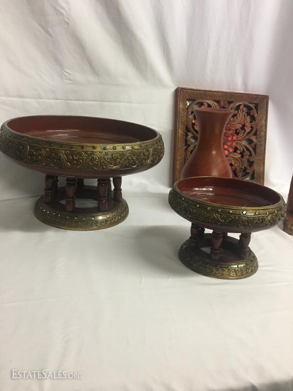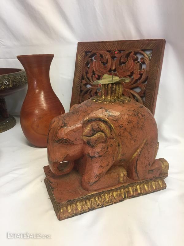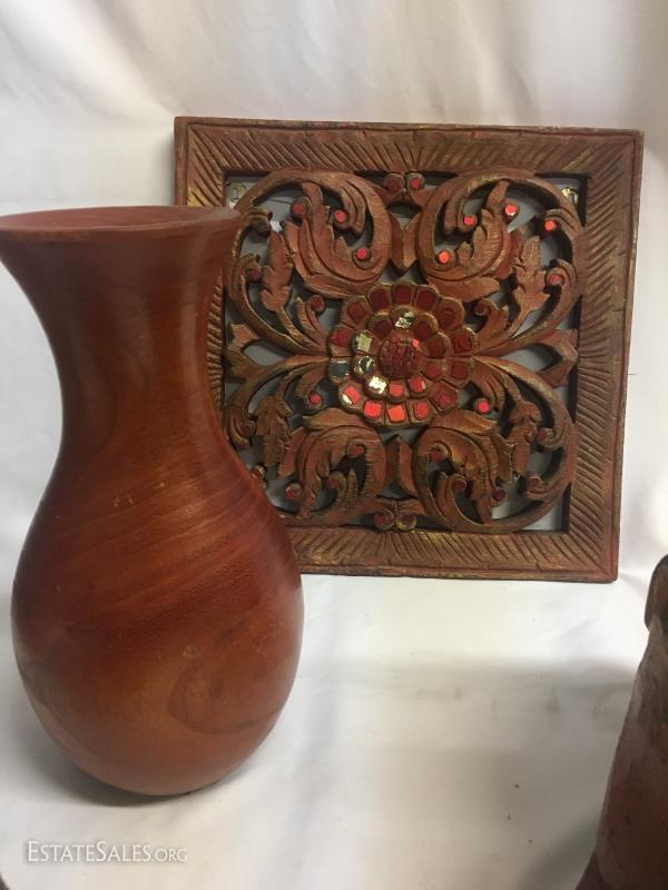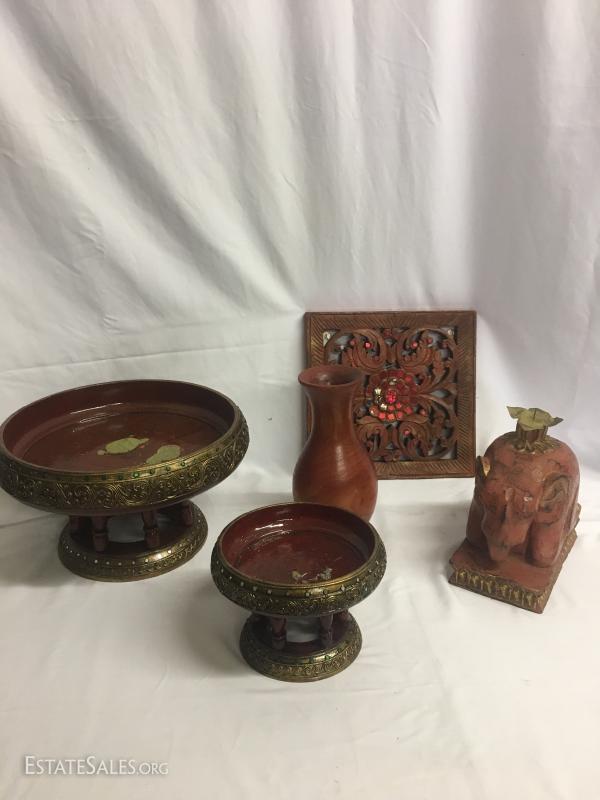 Two pedistal wood bowls with gold and glass decorations. Tallest one measures 8" tall. Wood Vase with a red colored dye. Use for dried or silk floral. Stands 10" tall. Wood elephant candle holder. Measures 9" x 9". Wood wall carving with red glass decor. A few pieces have popped off. Item measures 12" x 12". This lot is available for shipping or local pick up in Waynesville, NC.