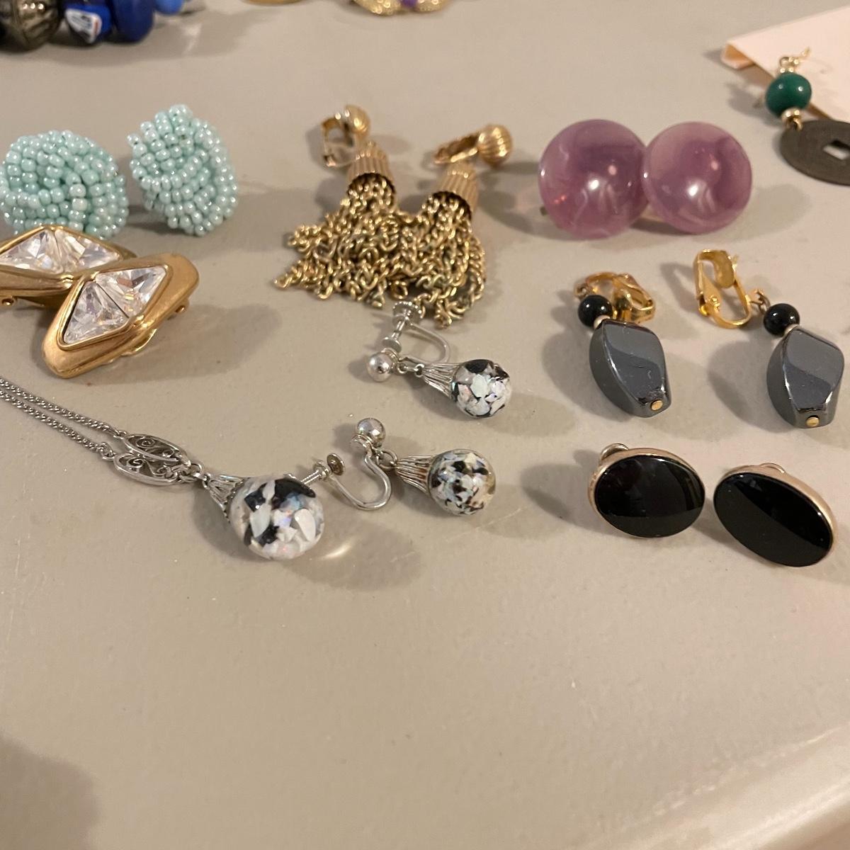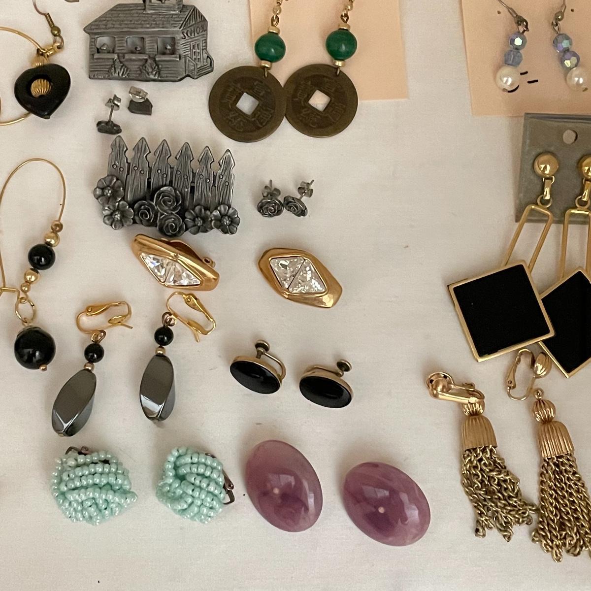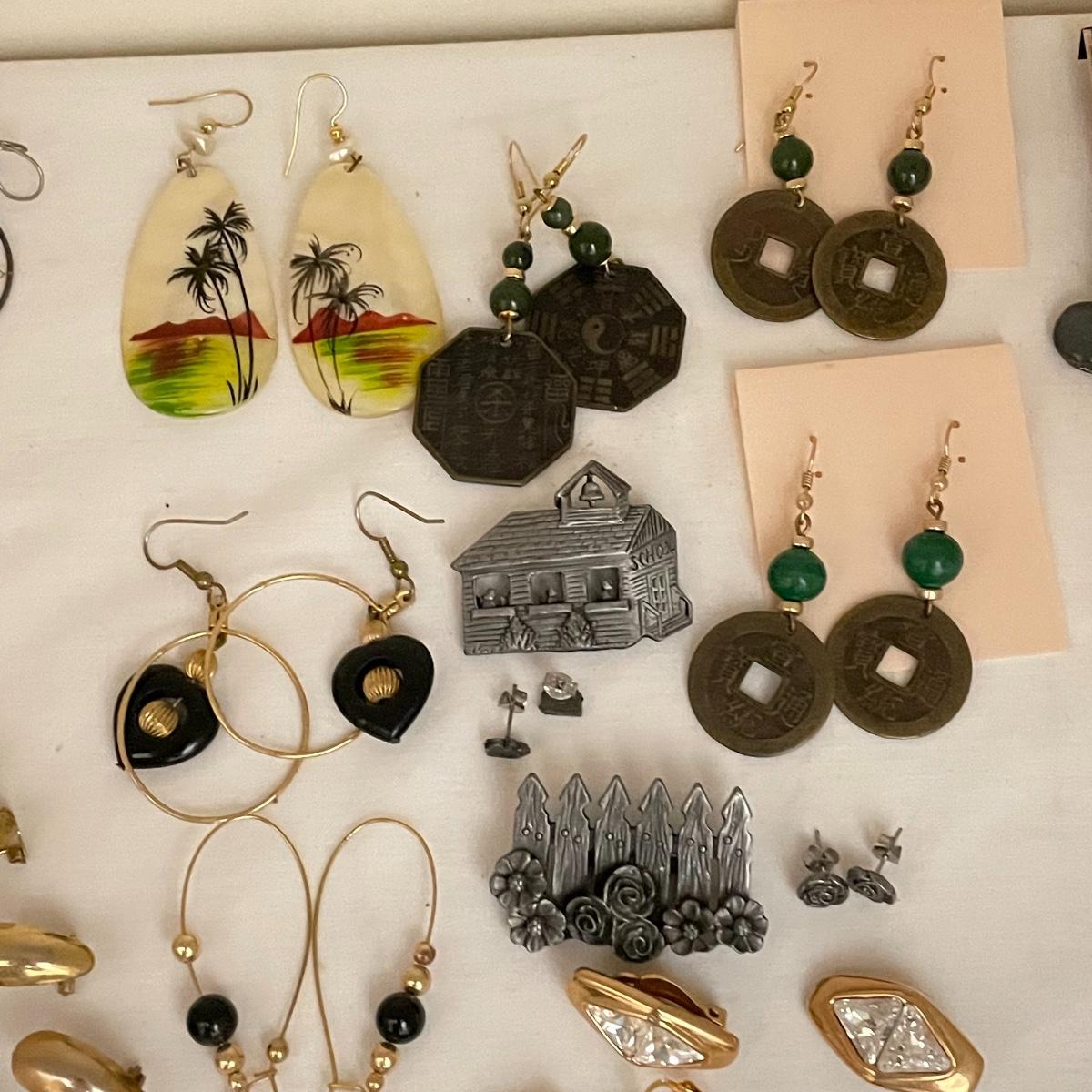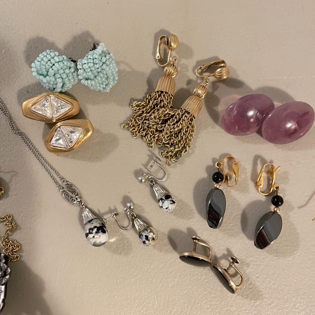 There’s a ton of style here in this collection of earrings and sets. Lot features three necklace-earring sets and two unique pin-earring sets. The set that appears to have blown glass is a clip earring set, the others are posted. Lot features six more pairs of clip earrings and the other forty+ are for pierced ears. Lots of dangles, unique pieces and bold colors alongside sleek, elegant and simple sets and even two brooches with matching earrings.. Some pieces are marked and shown in photos, most are not marked. See images. Shipping available.