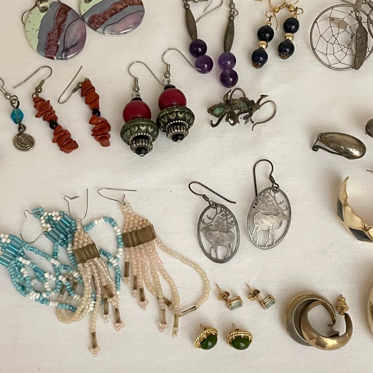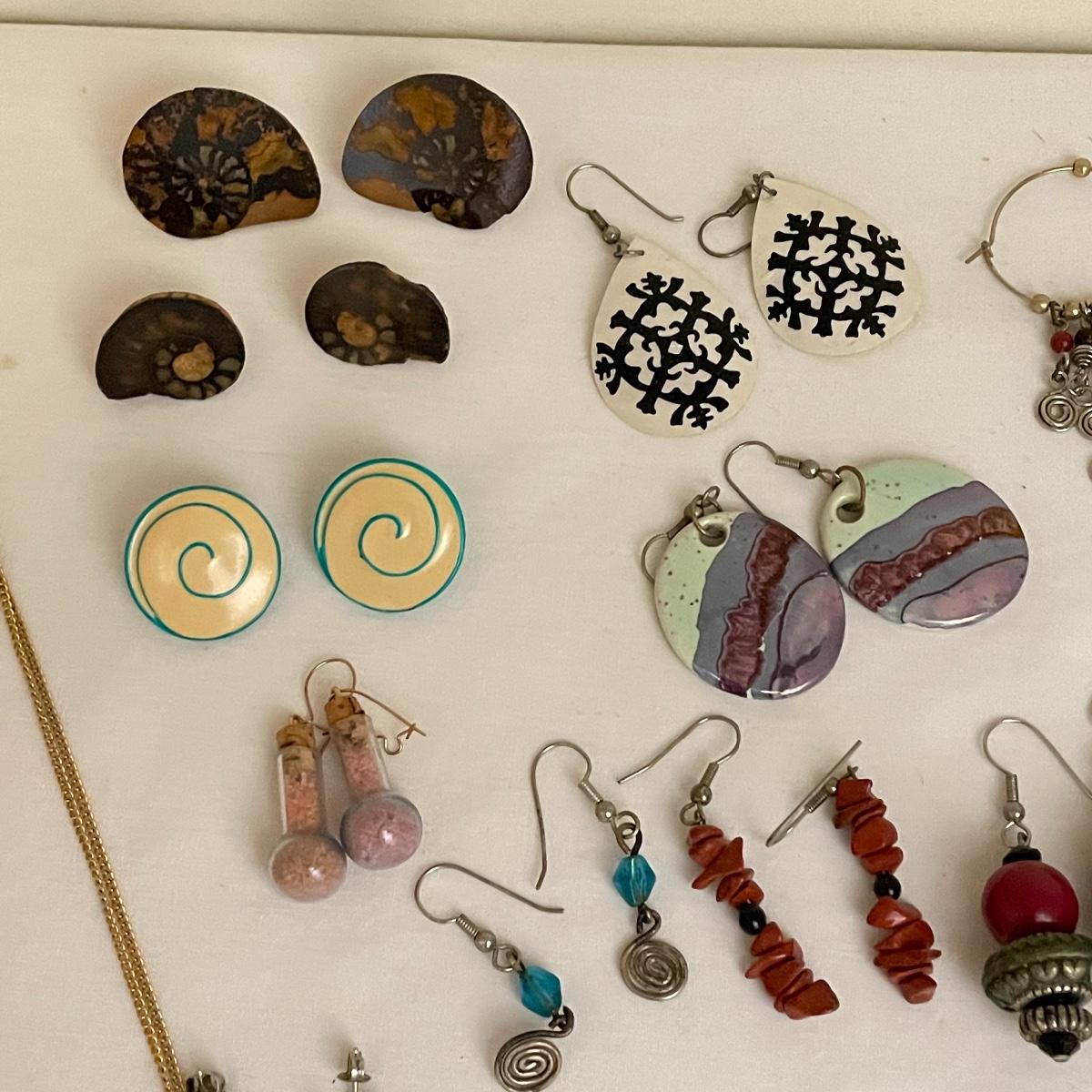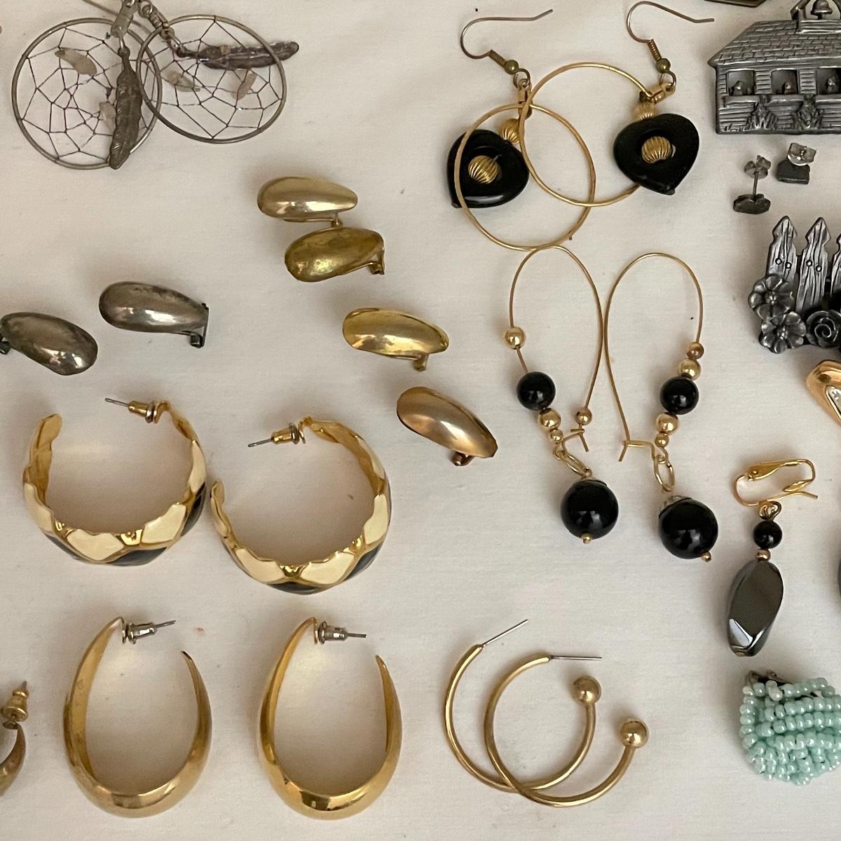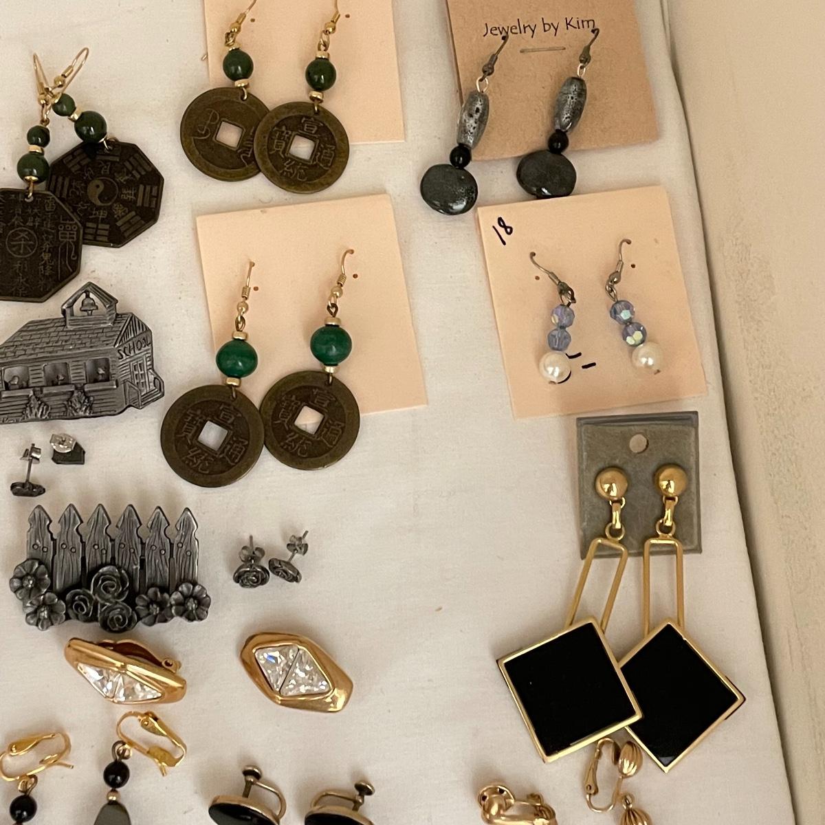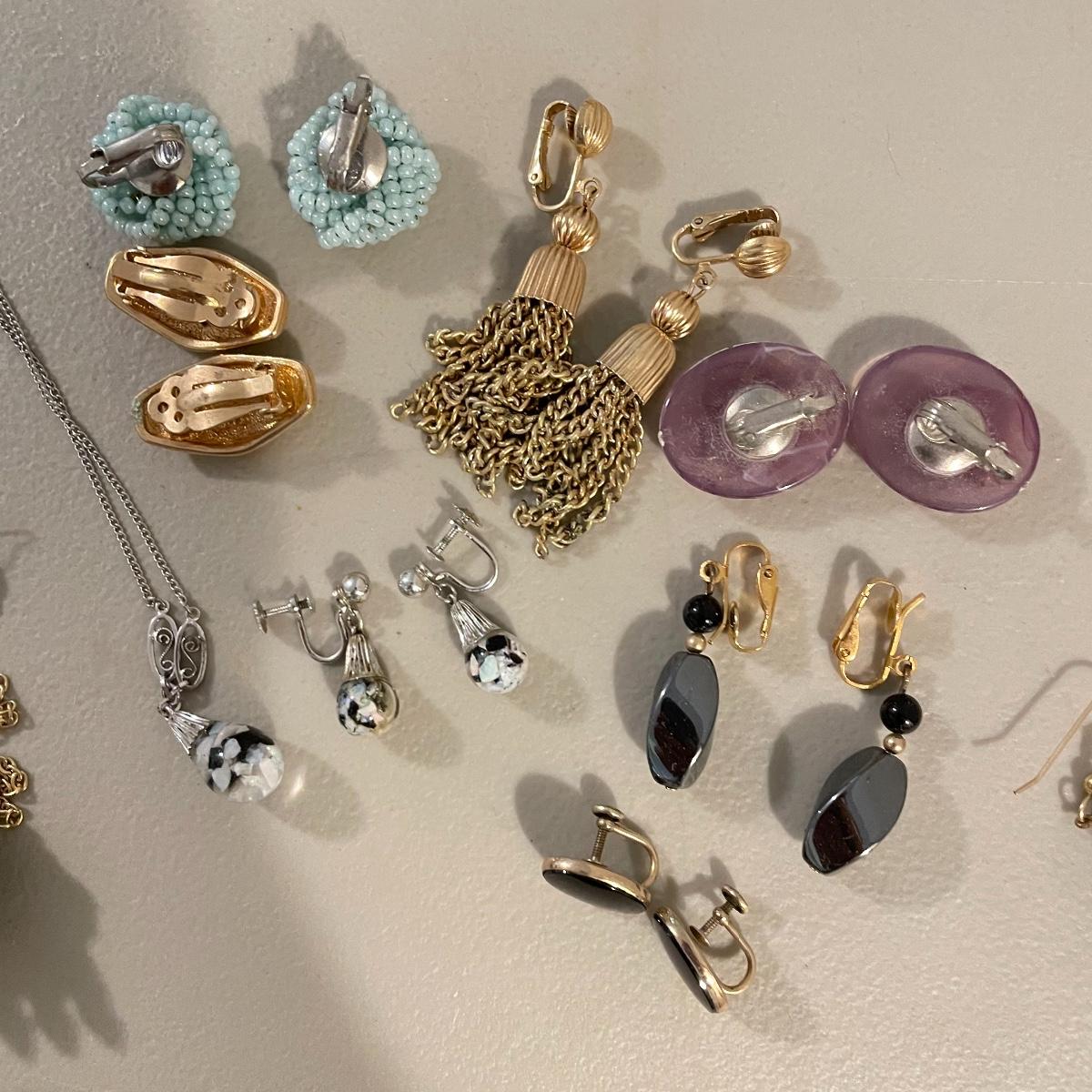 There’s a ton of style here in this collection of earrings and sets. Lot features three necklace-earring sets and two unique pin-earring sets. The set that appears to have blown glass is a clip earring set, the others are posted. Lot features six more pairs of clip earrings and the other forty+ are for pierced ears. Lots of dangles, unique pieces and bold colors alongside sleek, elegant and simple sets and even two brooches with matching earrings.. Some pieces are marked and shown in photos, most are not marked. See images. Shipping available.