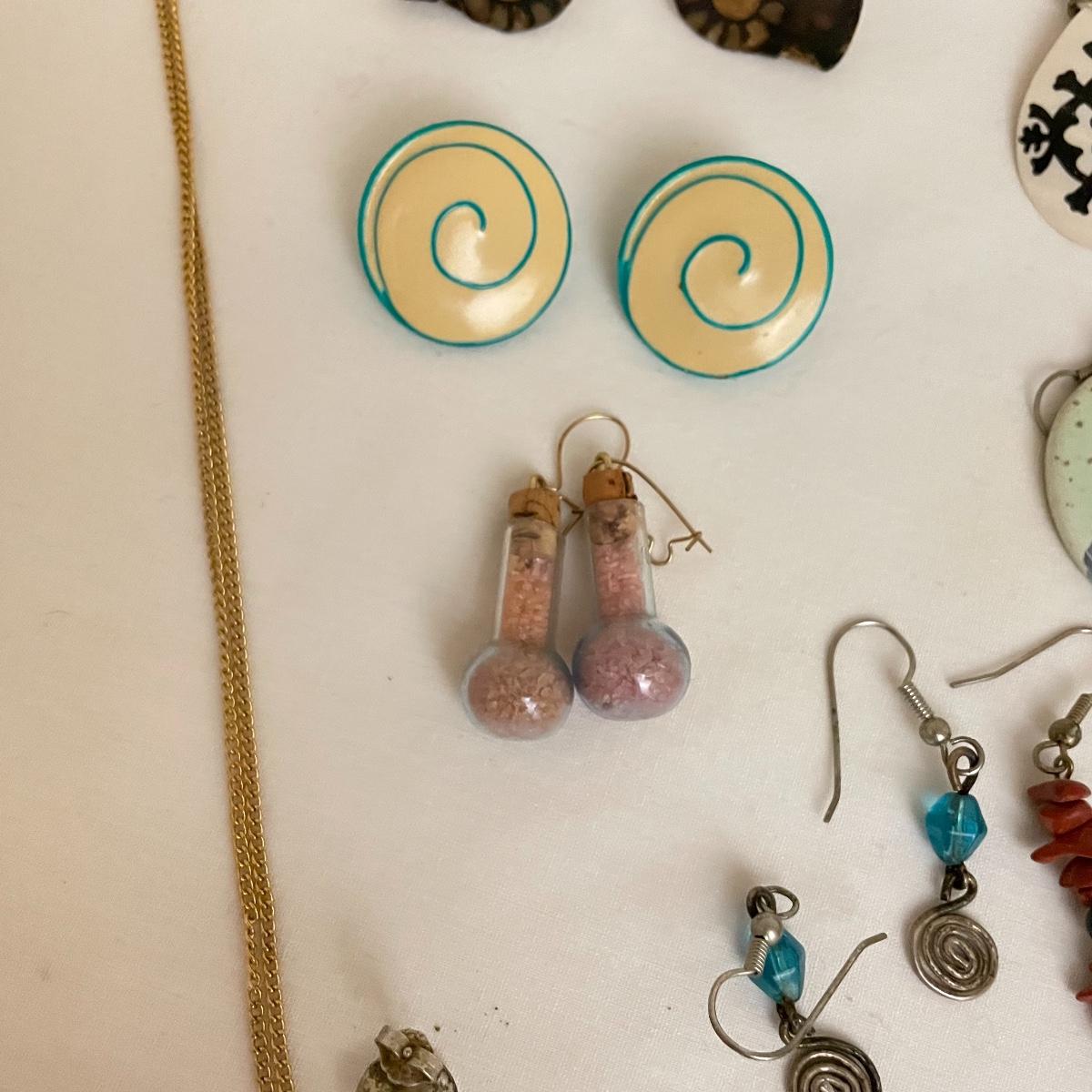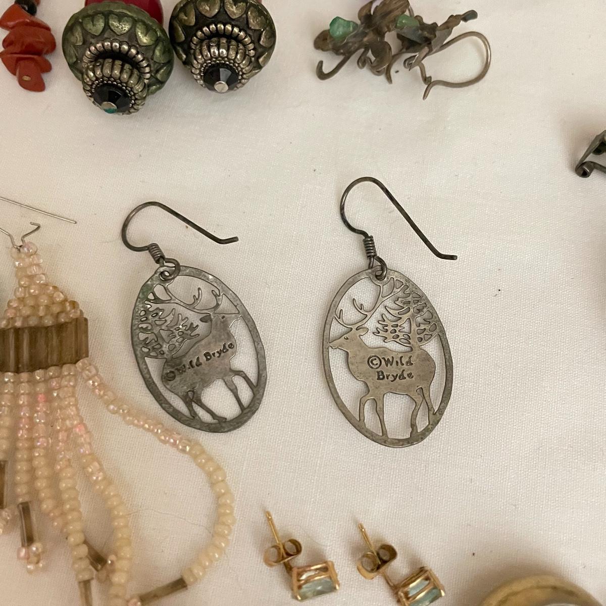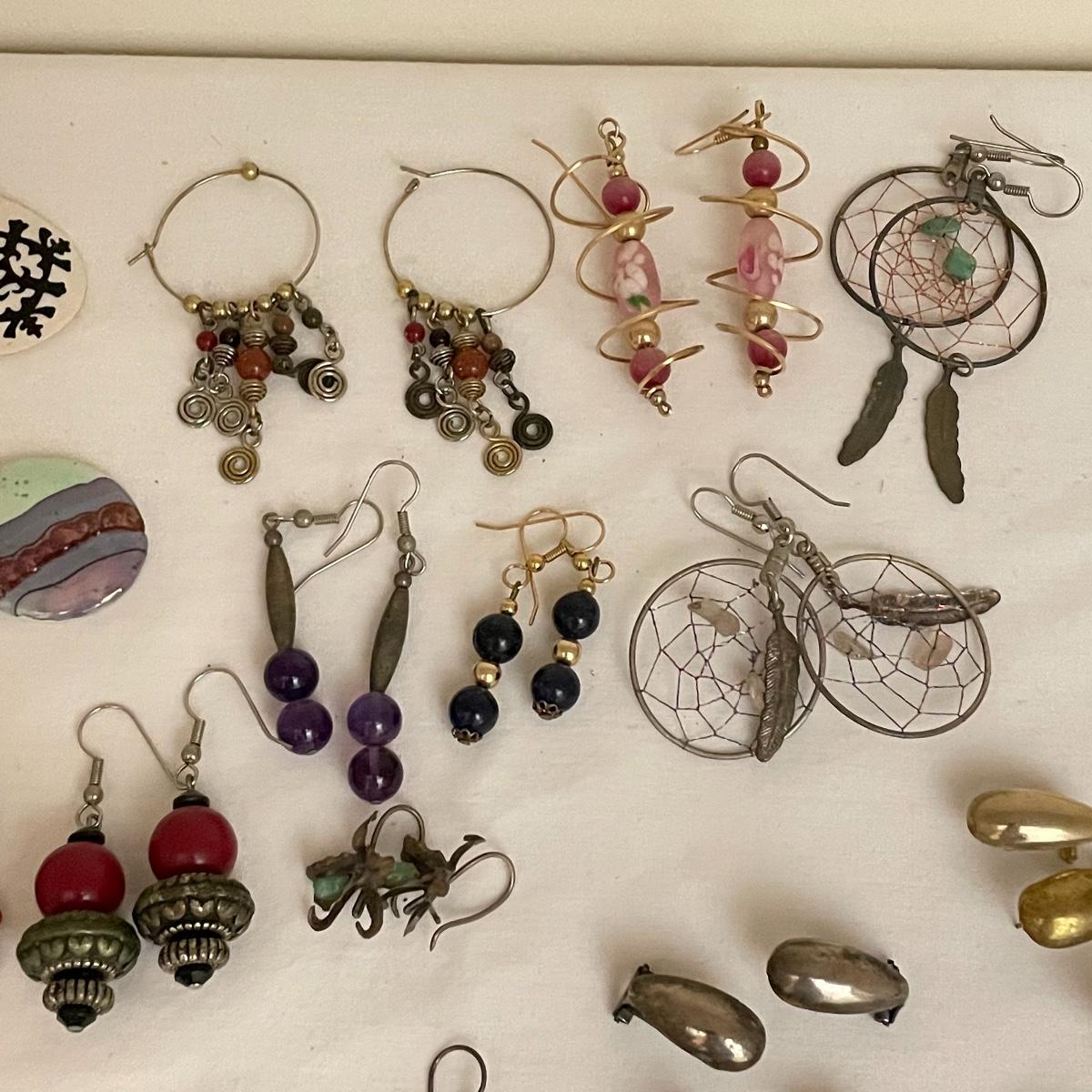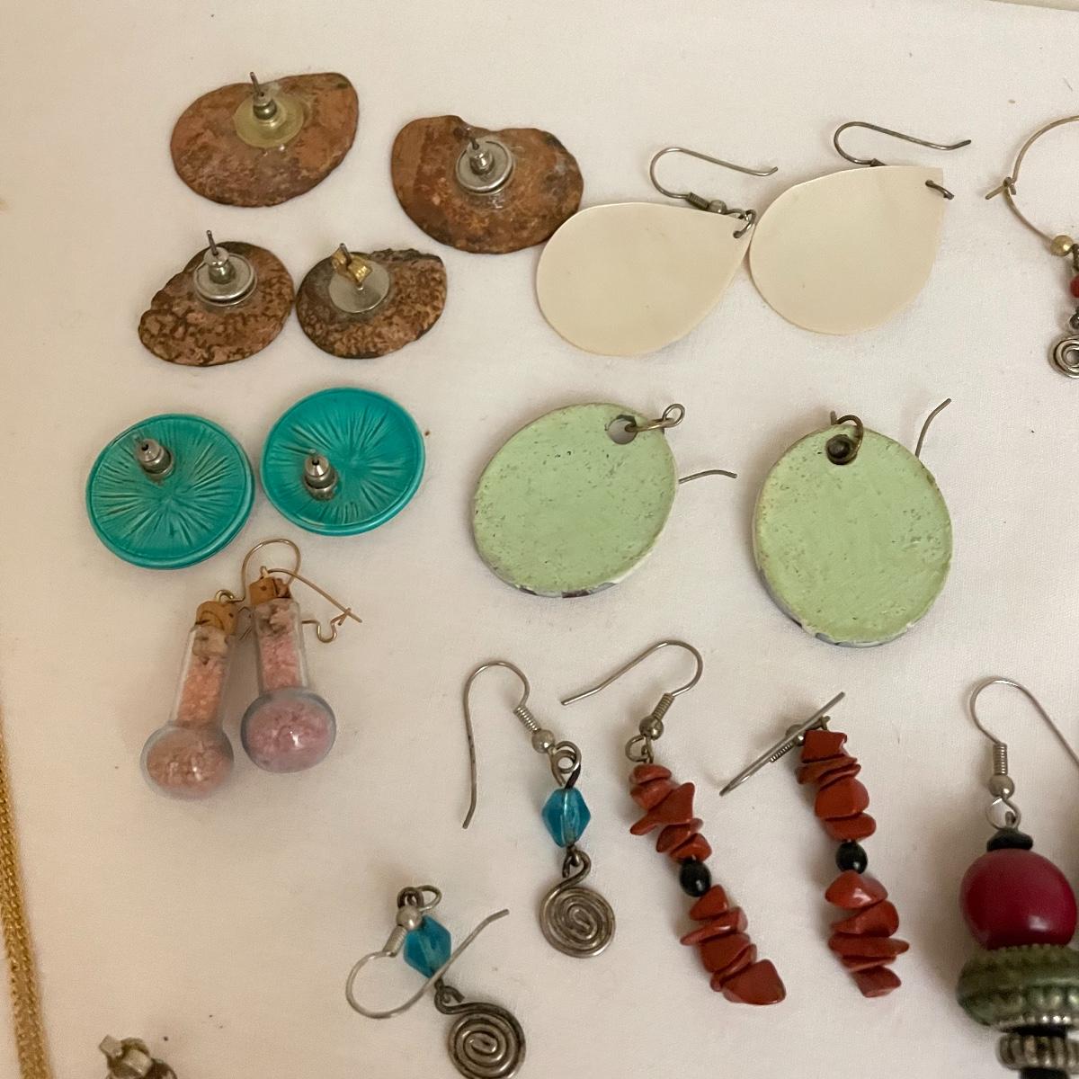 There’s a ton of style here in this collection of earrings and sets. Lot features three necklace-earring sets and two unique pin-earring sets. The set that appears to have blown glass is a clip earring set, the others are posted. Lot features six more pairs of clip earrings and the other forty+ are for pierced ears. Lots of dangles, unique pieces and bold colors alongside sleek, elegant and simple sets and even two brooches with matching earrings.. Some pieces are marked and shown in photos, most are not marked. See images. Shipping available.