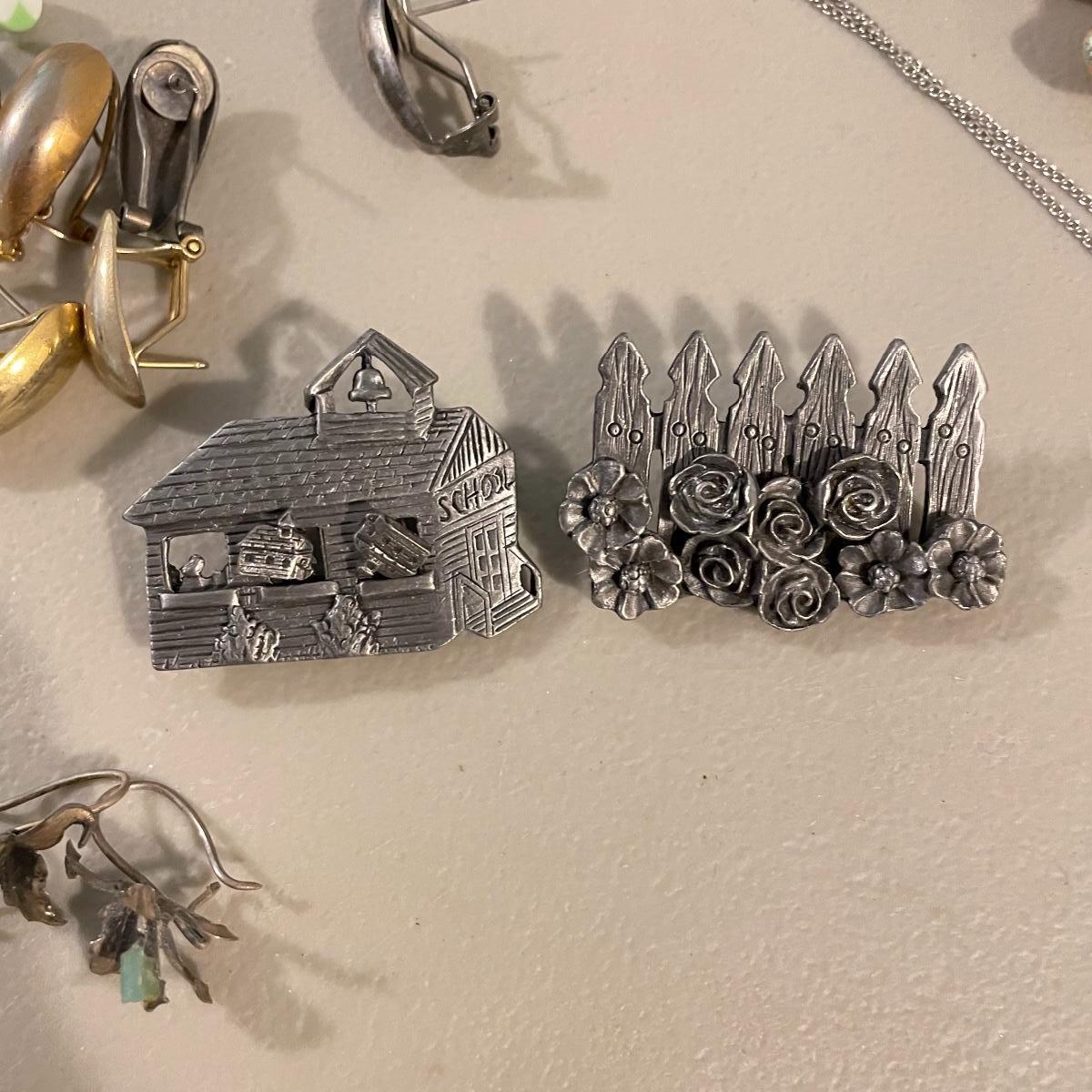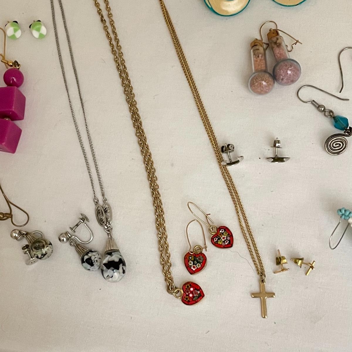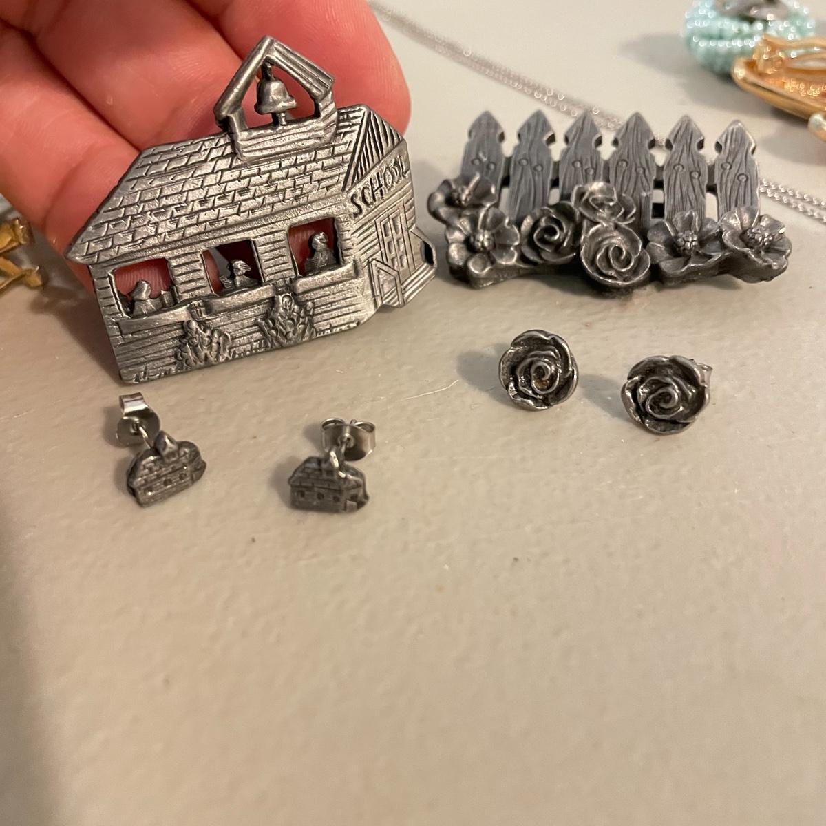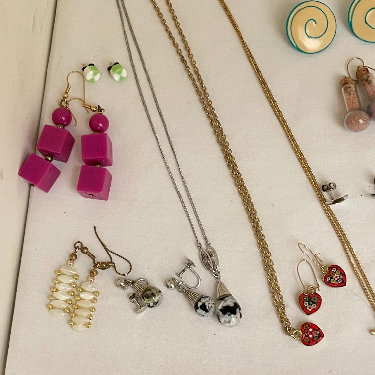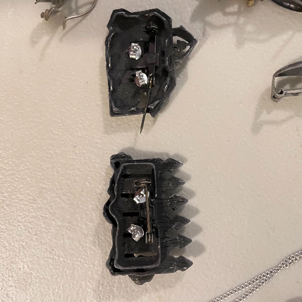 There’s a ton of style here in this collection of earrings and sets. Lot features three necklace-earring sets and two unique pin-earring sets. The set that appears to have blown glass is a clip earring set, the others are posted. Lot features six more pairs of clip earrings and the other forty+ are for pierced ears. Lots of dangles, unique pieces and bold colors alongside sleek, elegant and simple sets and even two brooches with matching earrings.. Some pieces are marked and shown in photos, most are not marked. See images. Shipping available.