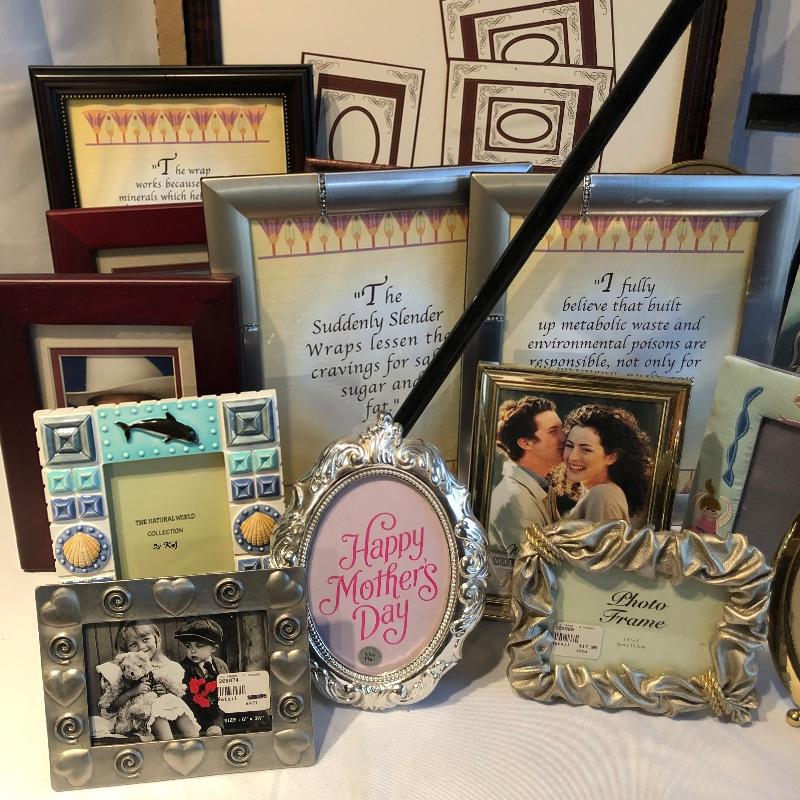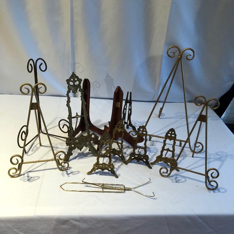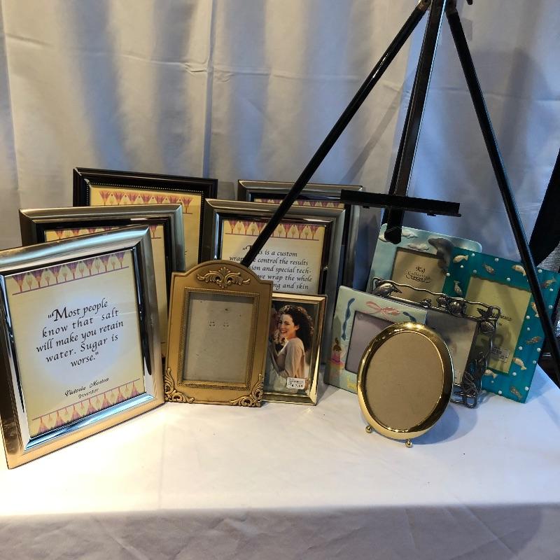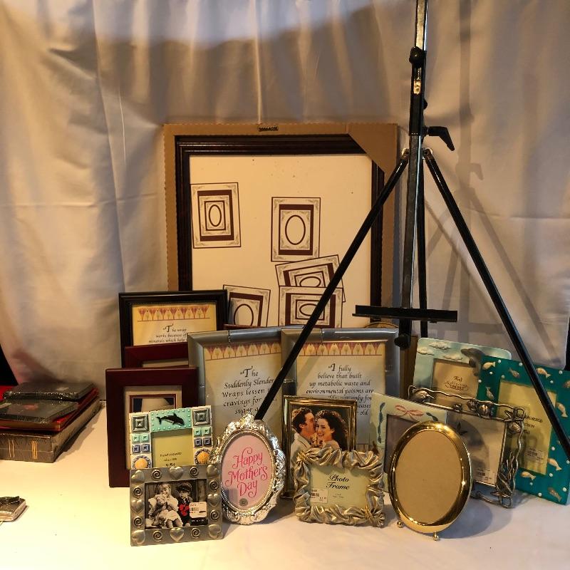 This nice sized easel gives you plenty of scope for positioning your current work of art! Also included here are over 20 frames in sizes ranging from 5” x 7” to 19” x 26”. The largest wooden frame pictured in the last 2 images is brand new and still in its box. Also included is a large assortment of plate and picture stands and a photo album and scrap book, see images for all that is included.