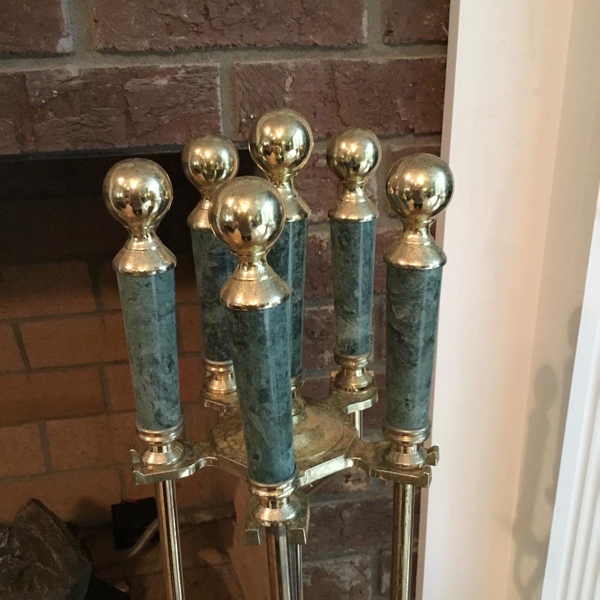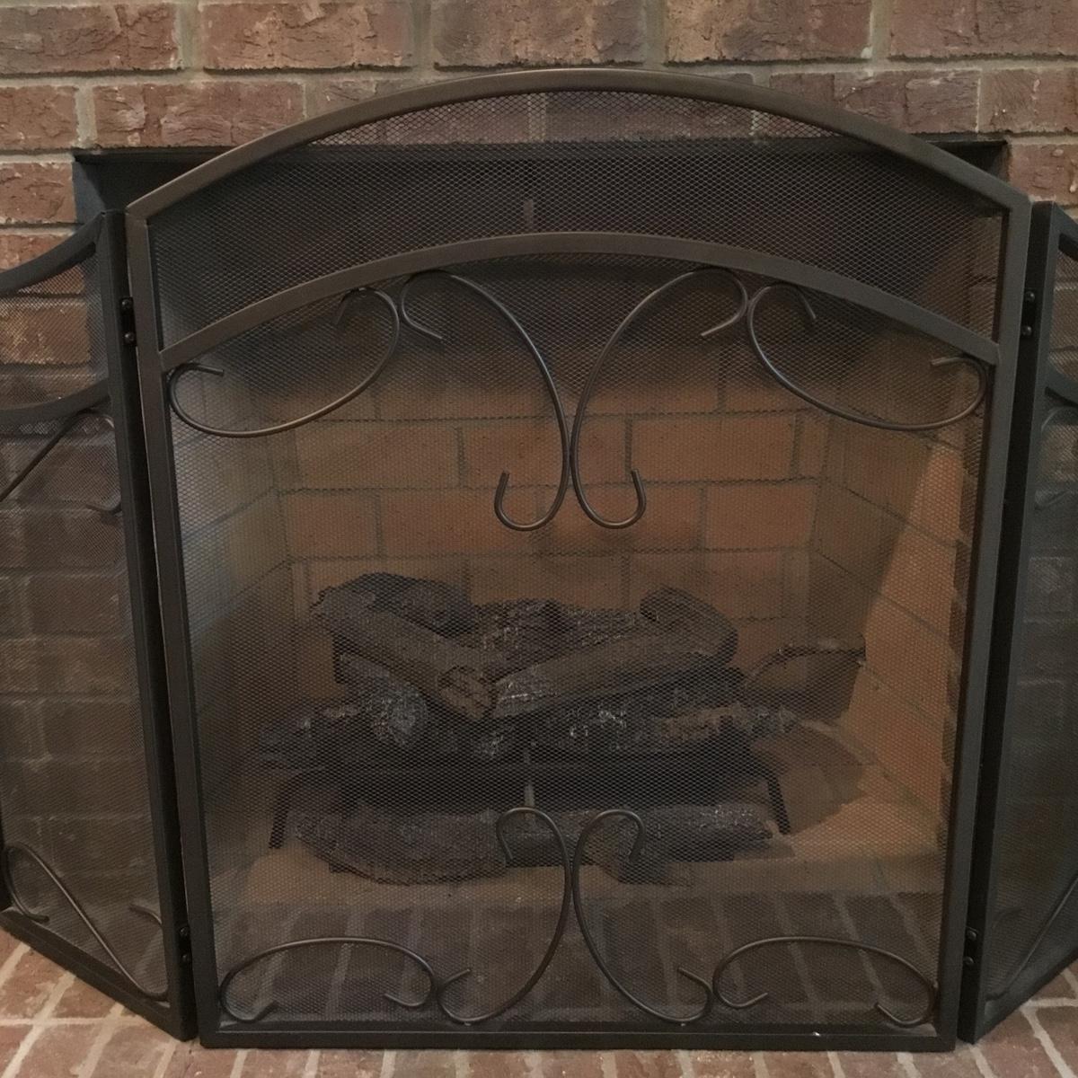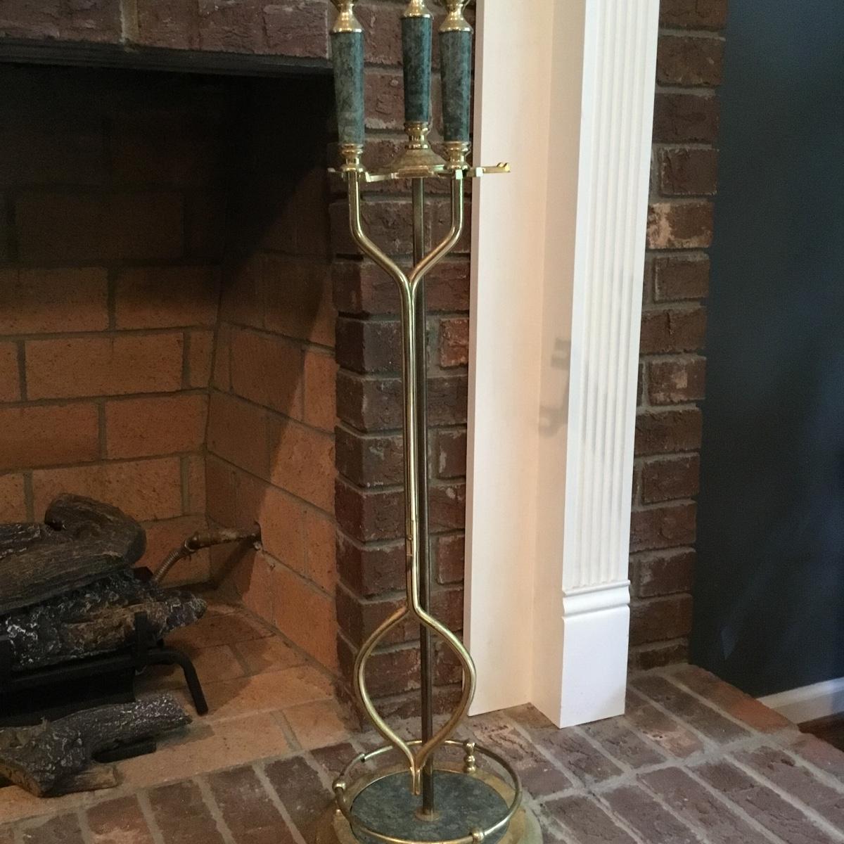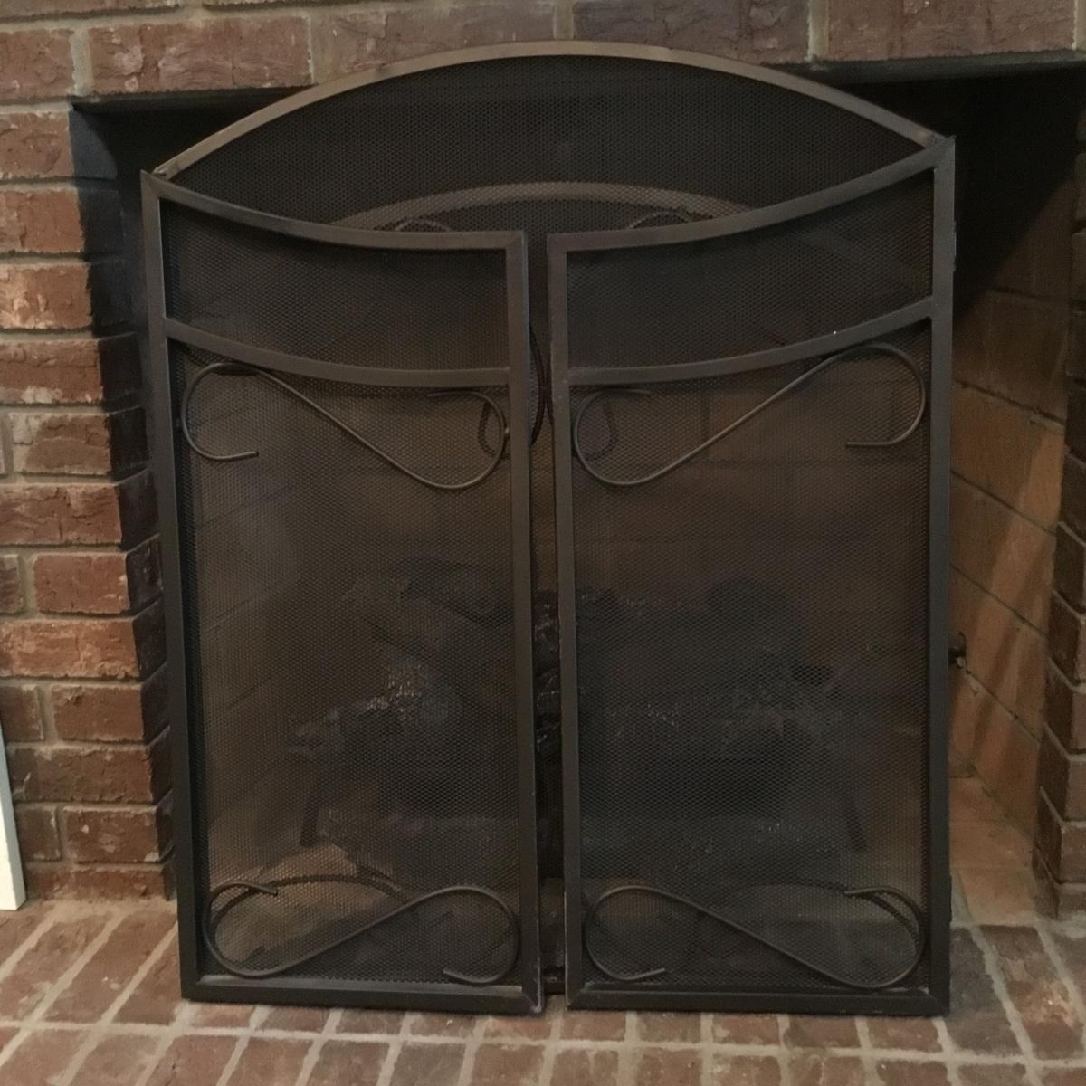 Lot includes a fireplace screen that can fold out to be 52” long and stands 32” tall. Fireplace screen is a trifold and can adjust to your fireplace! Lot also includes a nice set of fireplace tools that are a brass color with green marble like handles. Four different tools are all hanging on a small stand together. See photos for details. Fireplace tool stand measures 33” tall.