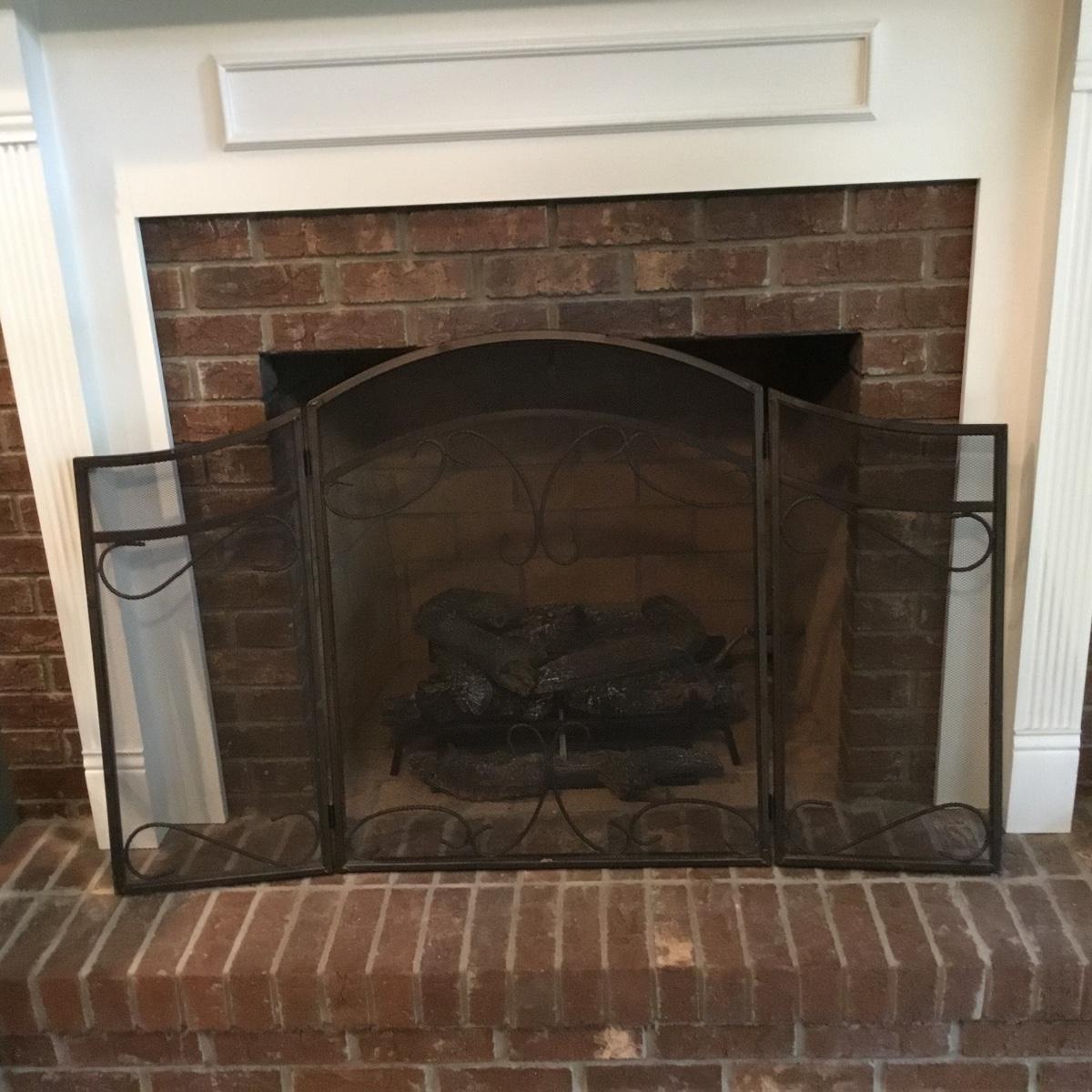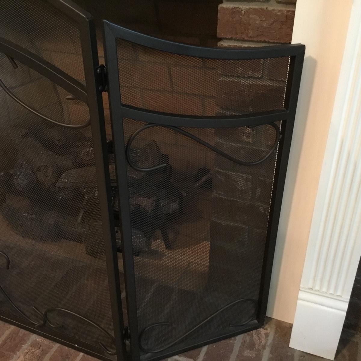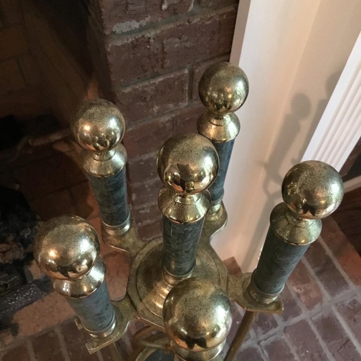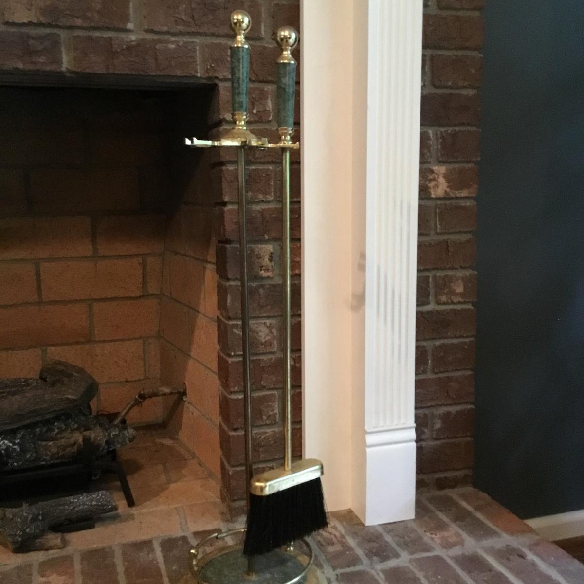 Lot includes a fireplace screen that can fold out to be 52” long and stands 32” tall. Fireplace screen is a trifold and can adjust to your fireplace! Lot also includes a nice set of fireplace tools that are a brass color with green marble like handles. Four different tools are all hanging on a small stand together. See photos for details. Fireplace tool stand measures 33” tall.