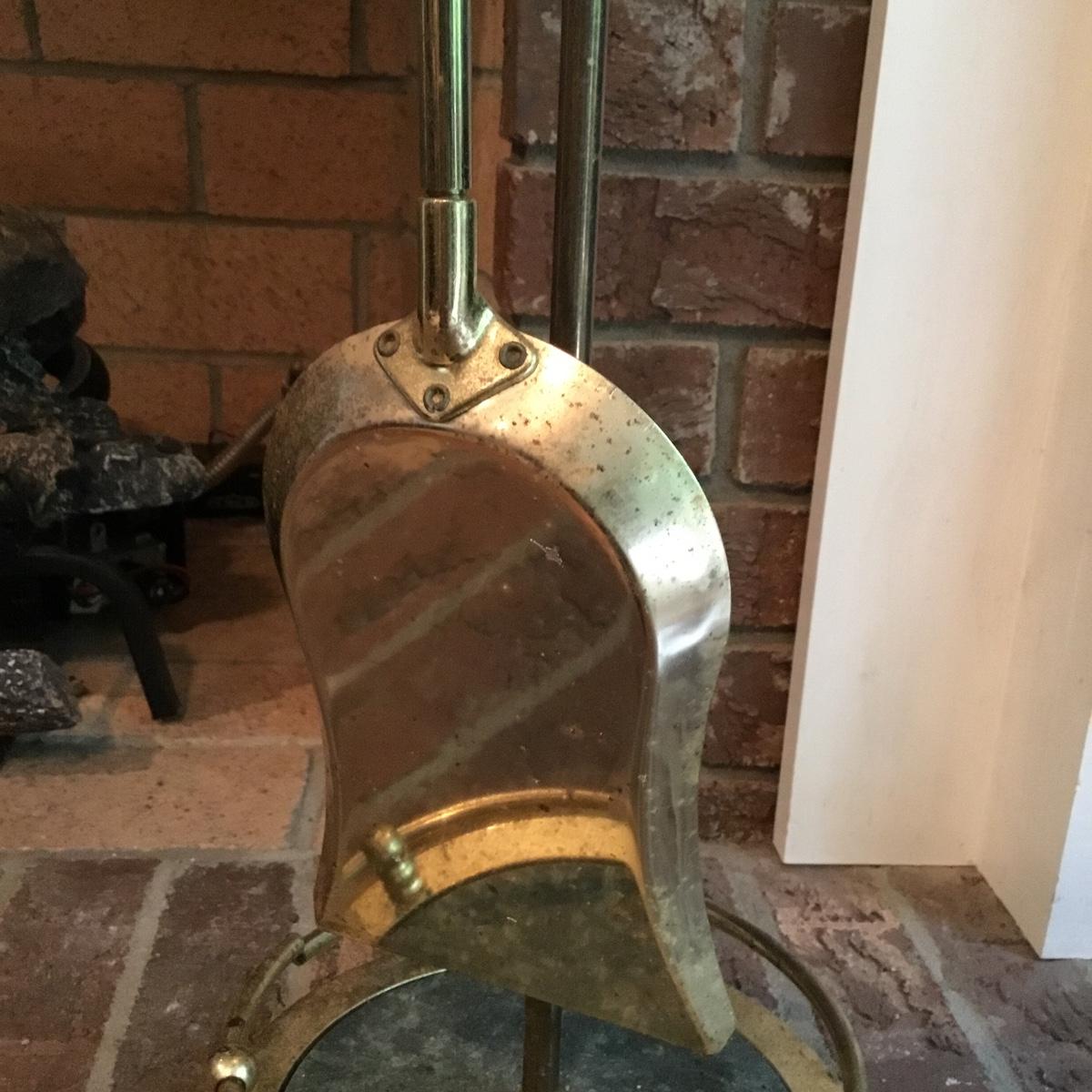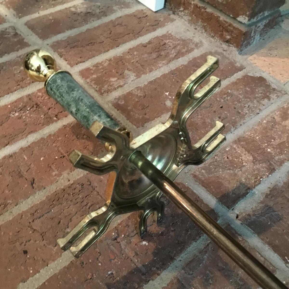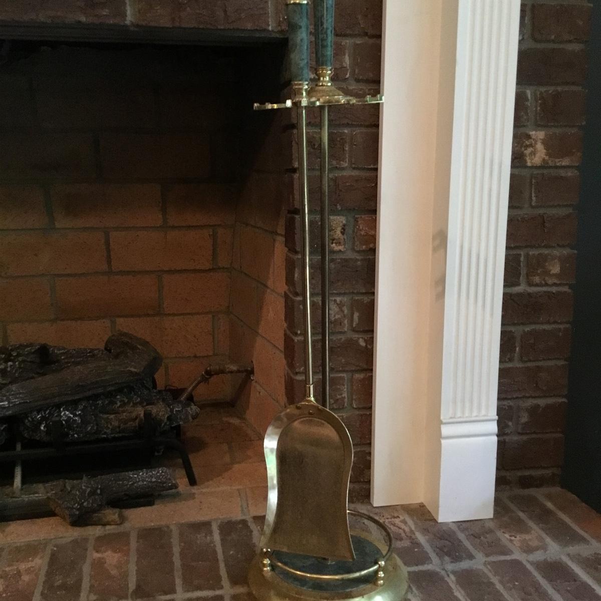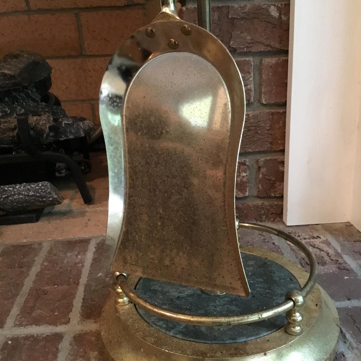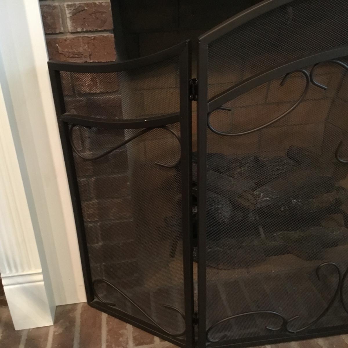 Lot includes a fireplace screen that can fold out to be 52” long and stands 32” tall. Fireplace screen is a trifold and can adjust to your fireplace! Lot also includes a nice set of fireplace tools that are a brass color with green marble like handles. Four different tools are all hanging on a small stand together. See photos for details. Fireplace tool stand measures 33” tall.