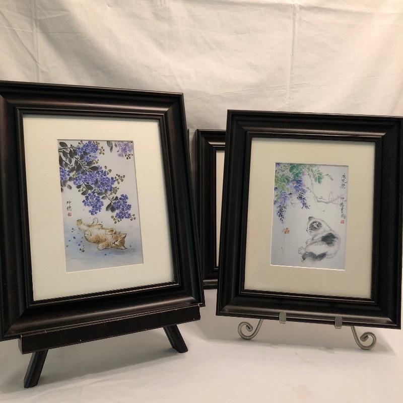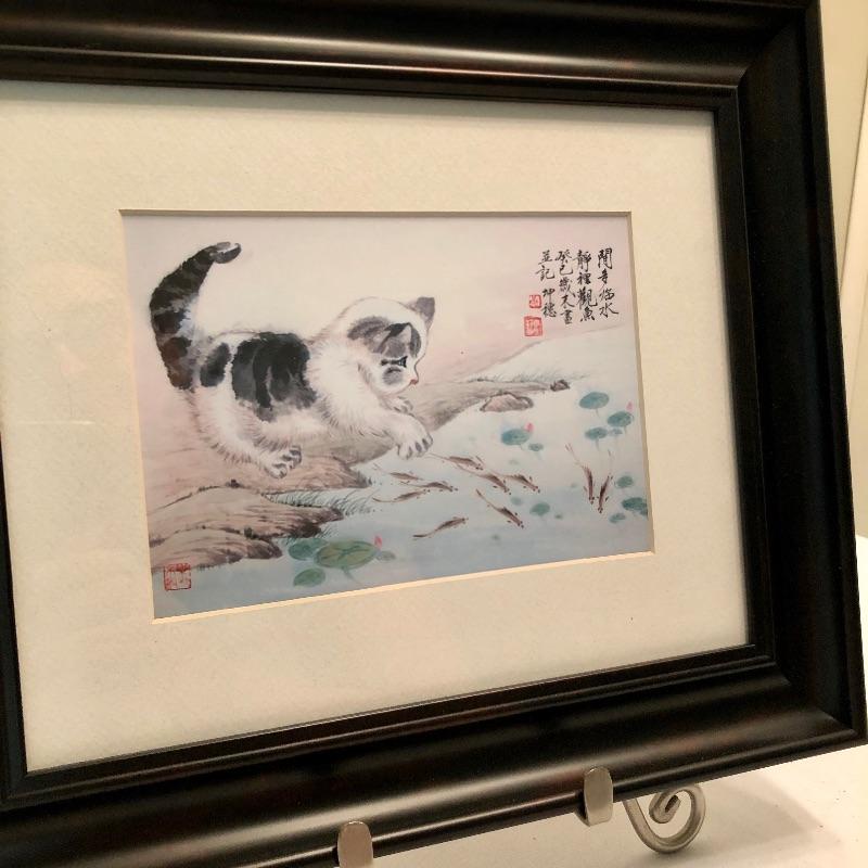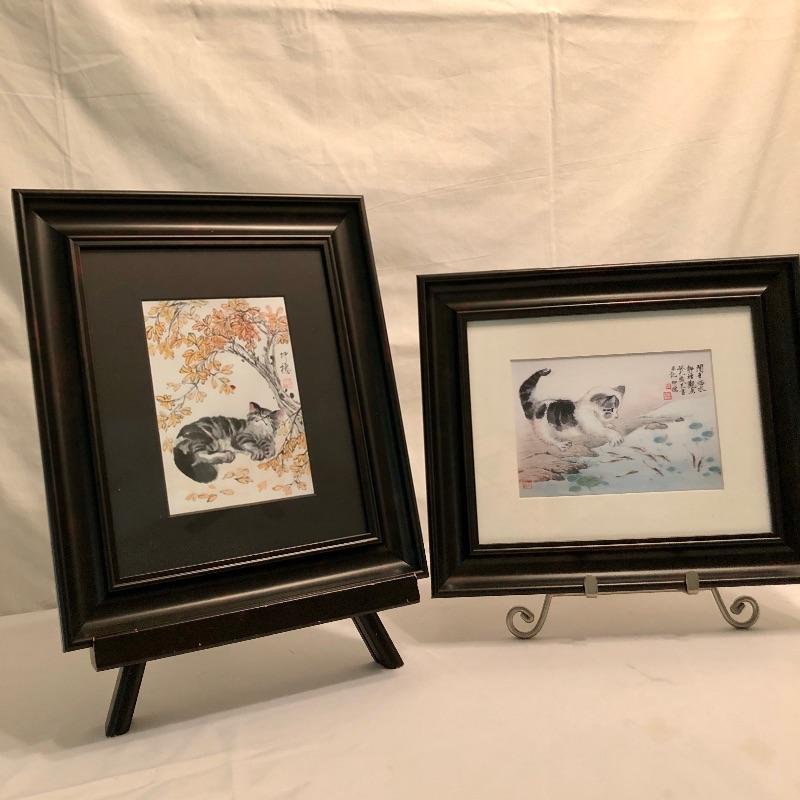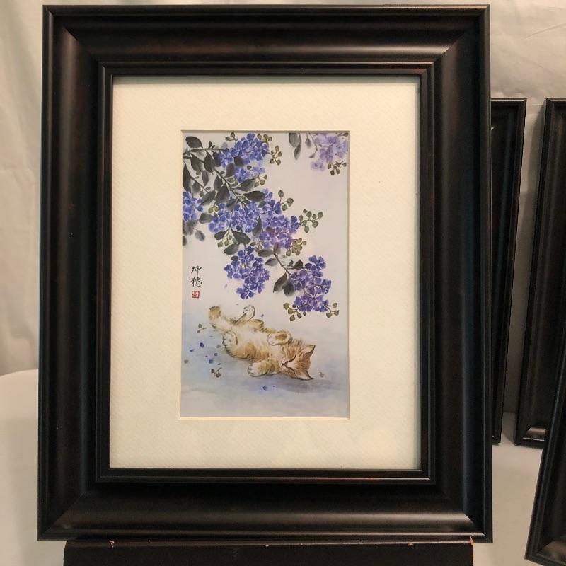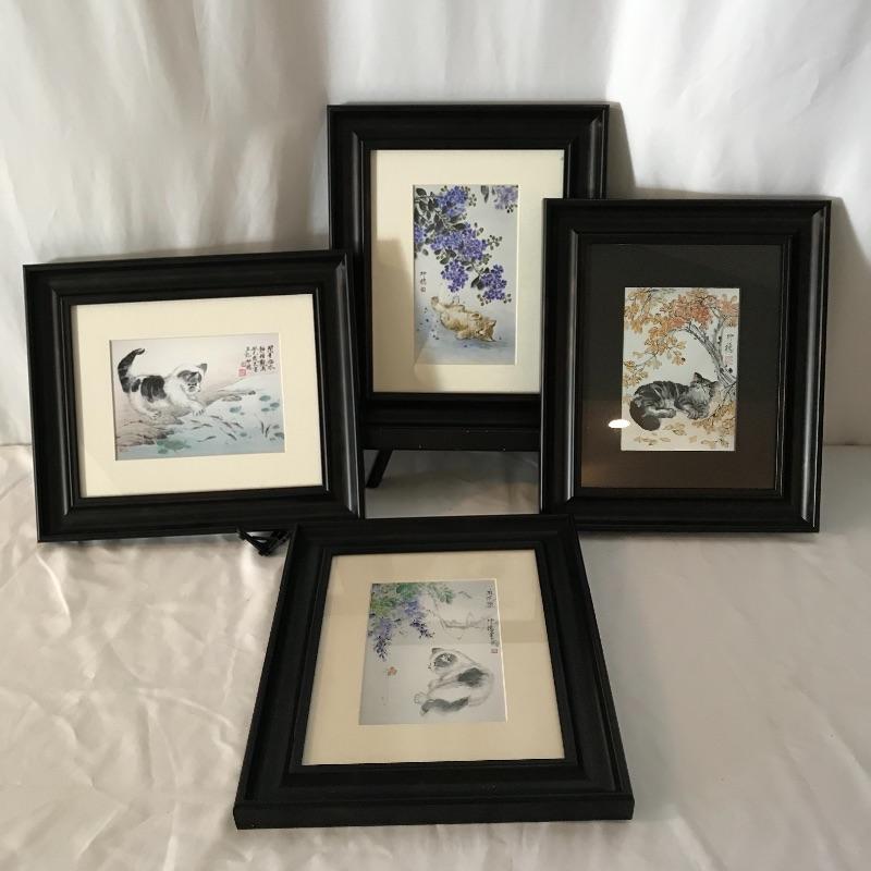 These four prints are all mounted in matching black frames ready to be hung up in their next home. They all look well together as they are all by asian artists and of a similar medium featuring cute cats.