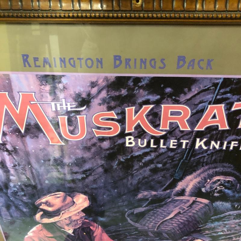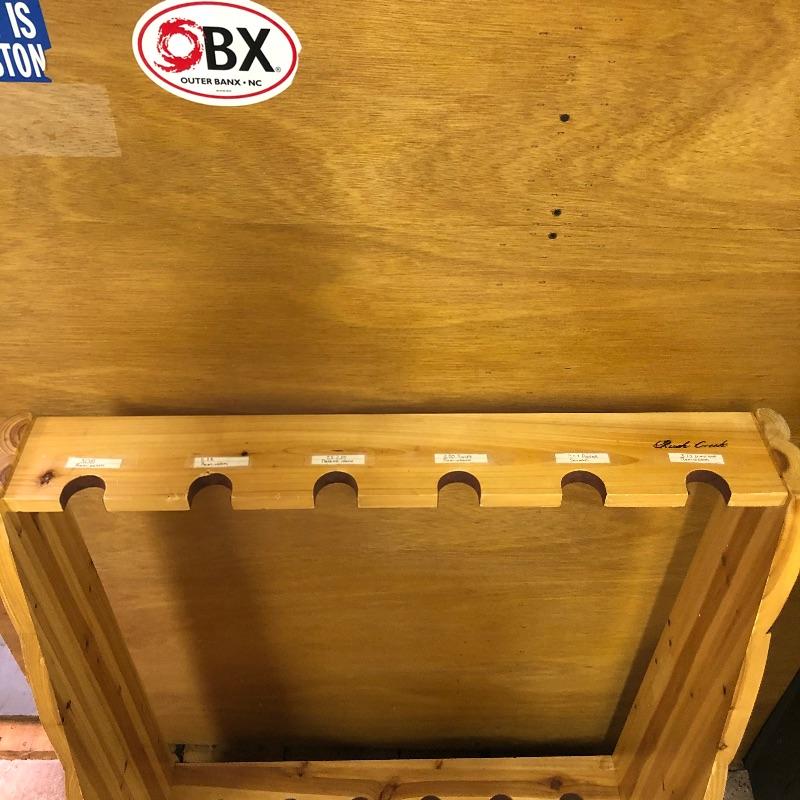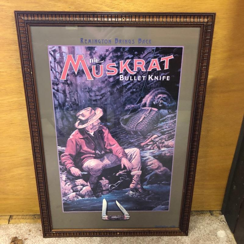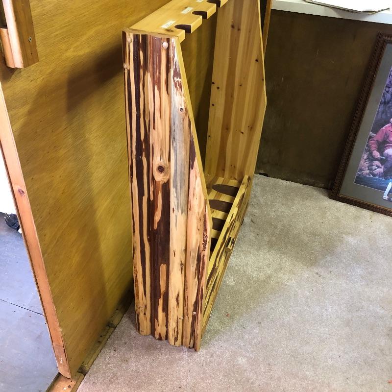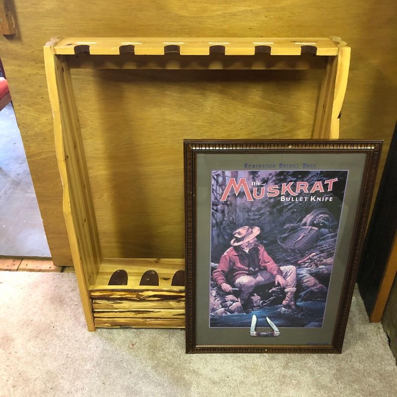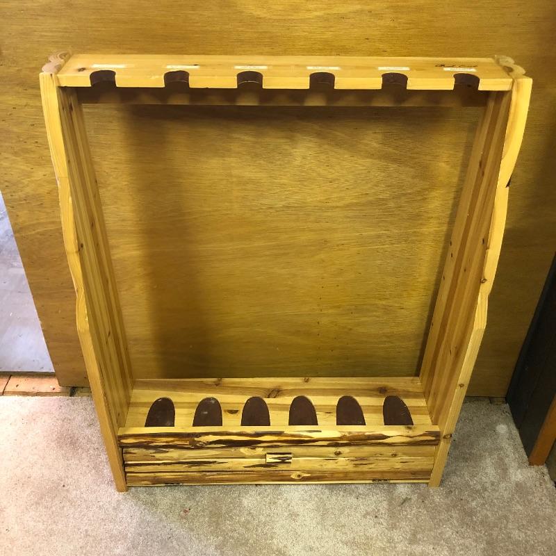 This pine gun rack is designed to hold up to 6 guns. It also has a handy drop down cabinet that runs the length of the bottom of the piece. We have paired this with a great framed poster. The frame is a medium toned wood; note that it has a small hole at the top which ironically looks like a bullet hole and may have been intentional, see image. Poster has image of knife at bottom.