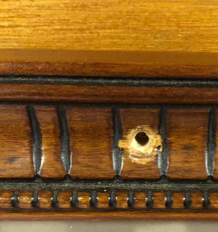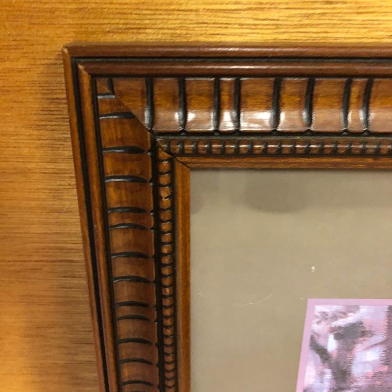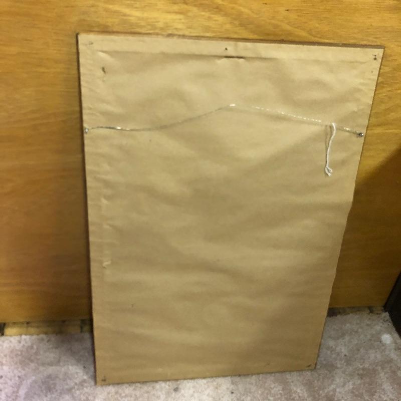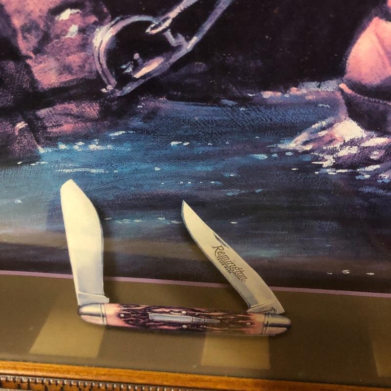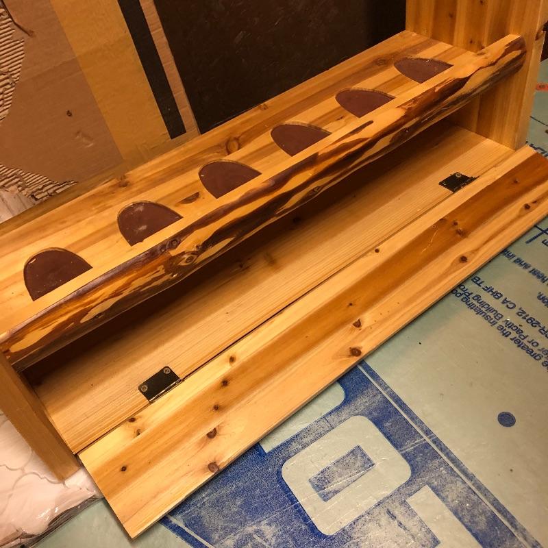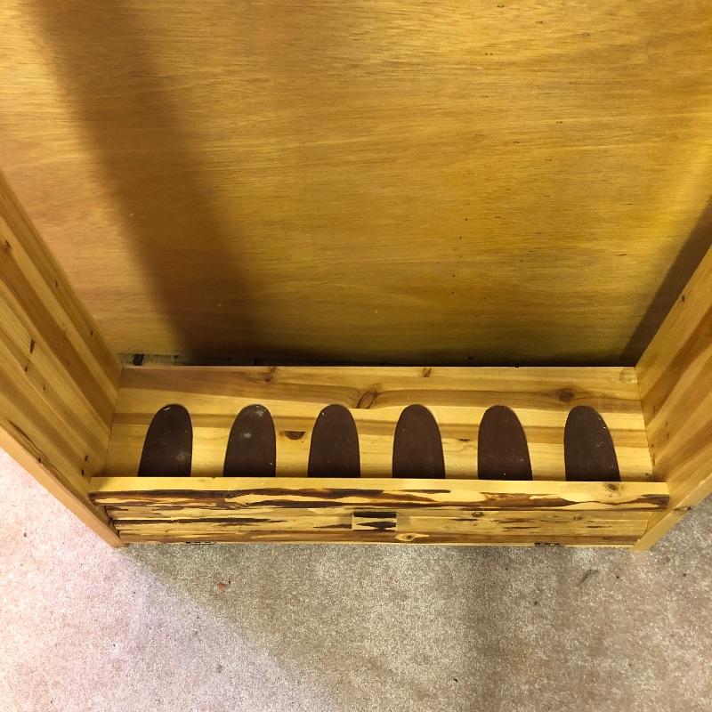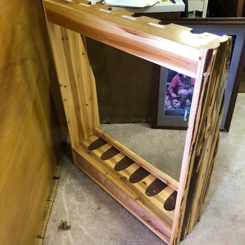 This pine gun rack is designed to hold up to 6 guns. It also has a handy drop down cabinet that runs the length of the bottom of the piece. We have paired this with a great framed poster. The frame is a medium toned wood; note that it has a small hole at the top which ironically looks like a bullet hole and may have been intentional, see image. Poster has image of knife at bottom.