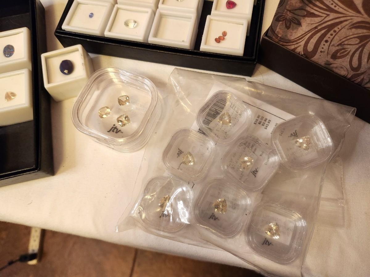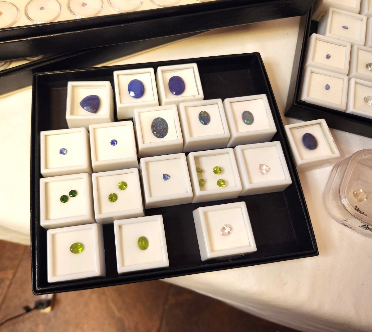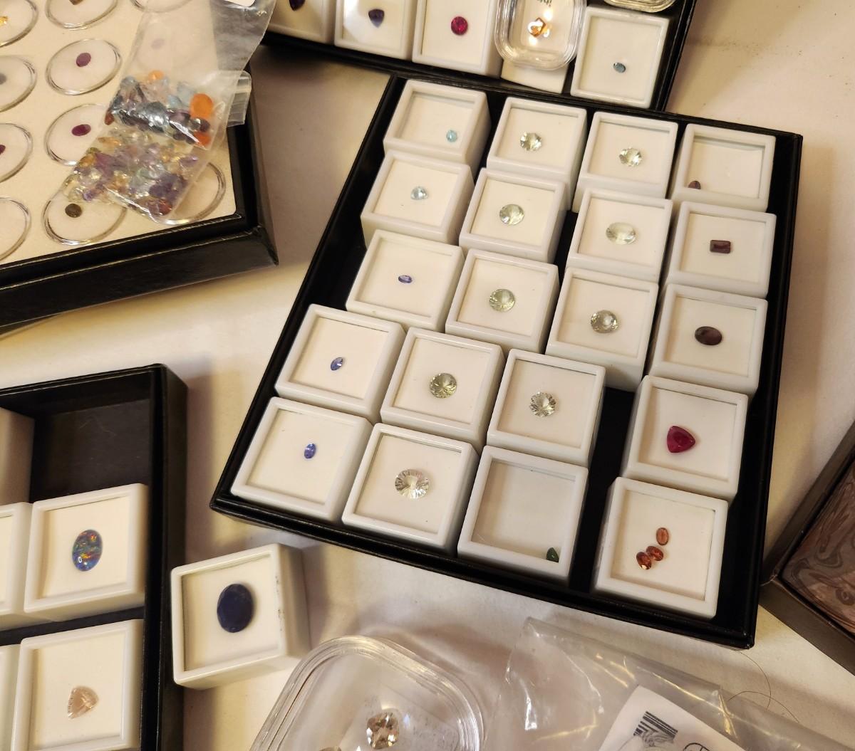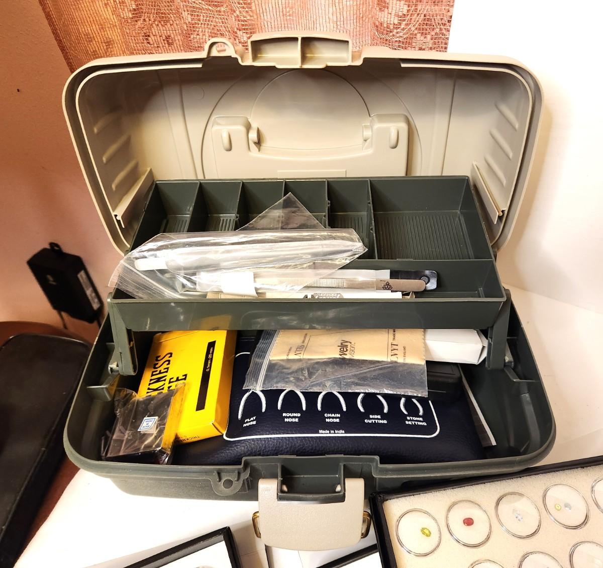 Lot of jewelry making supplies here - many, many semiprecious stones in all cuts/sizes, some tools, some sterling stone pendant mounts, cases, trays, etc. All you see here.