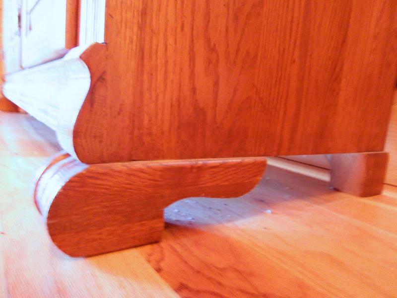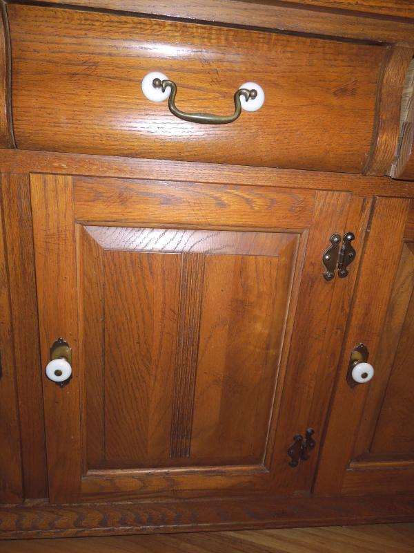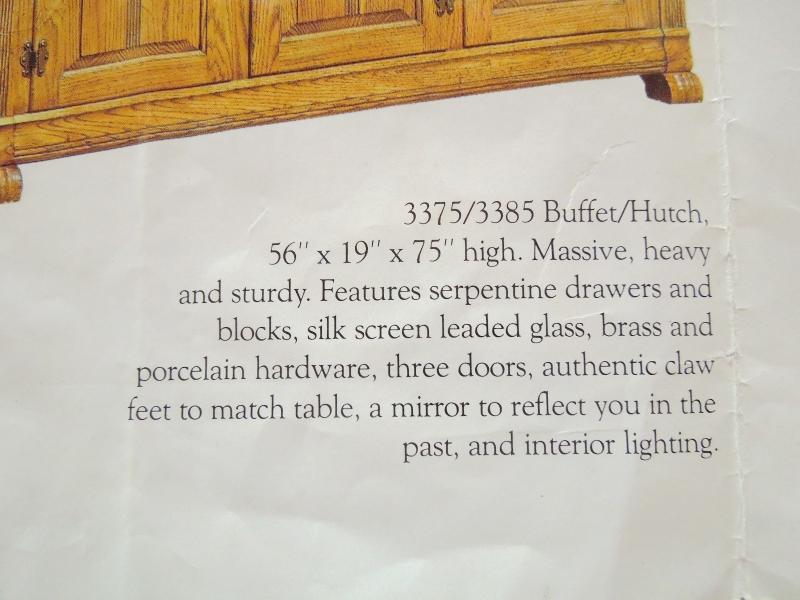 Wowzer! This gorgeous buffet features a deep golden oak finish, leaded glass panel doors porcelain knobs. Heavy serpentine drawers and blocks, claw feet and mirror back splash. In excellent vintage condition with original showroom brochure. A real show stopper. 76" H x 53" w x 19" D. Two pieces attached at back. Super clean with no noted damage. Reproduction from the 1970's.
