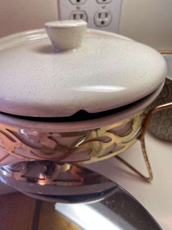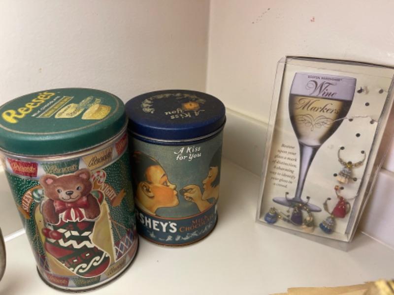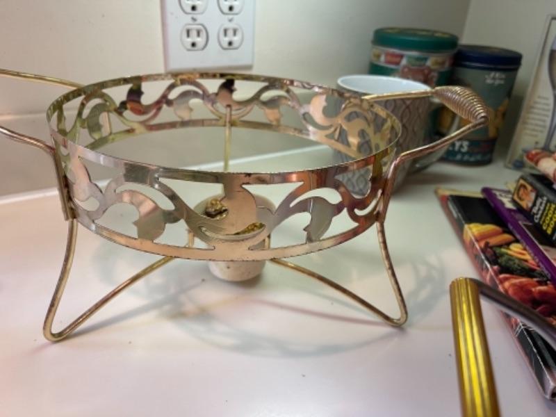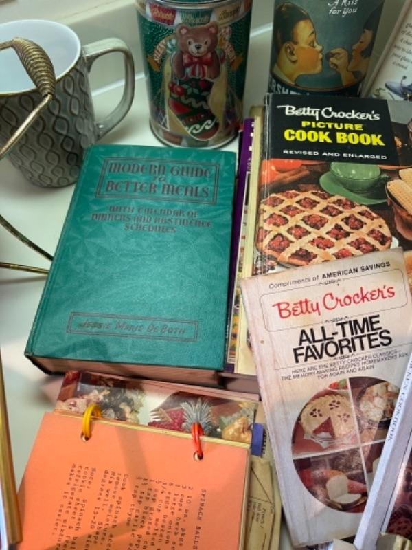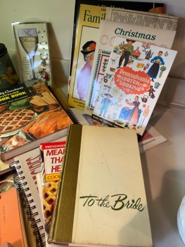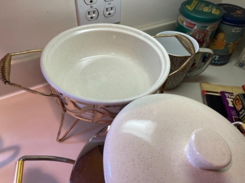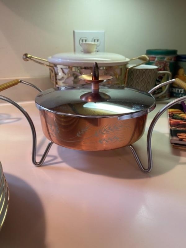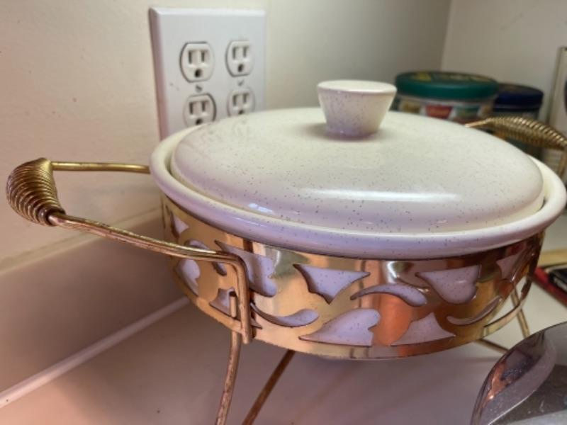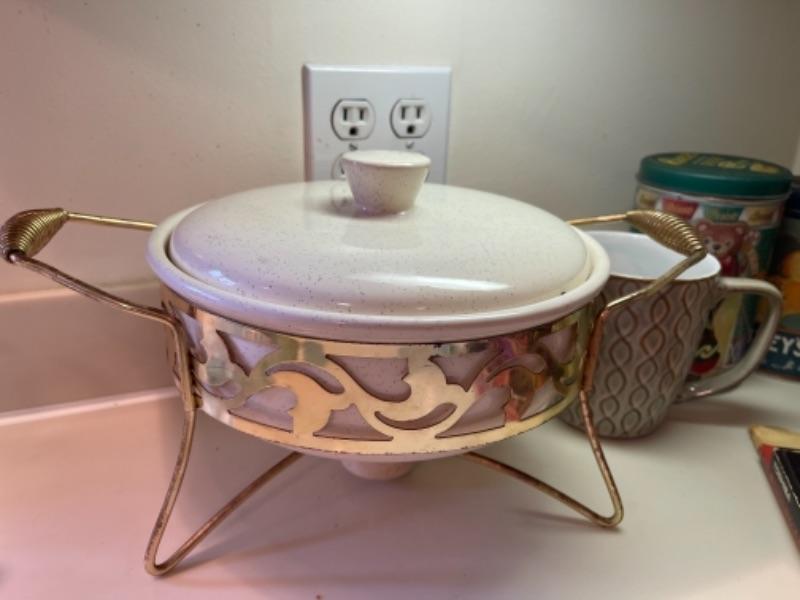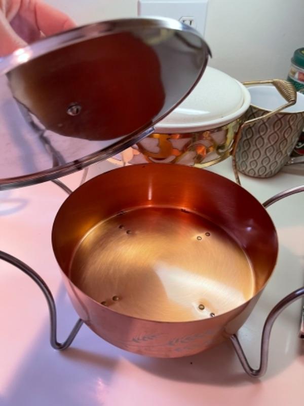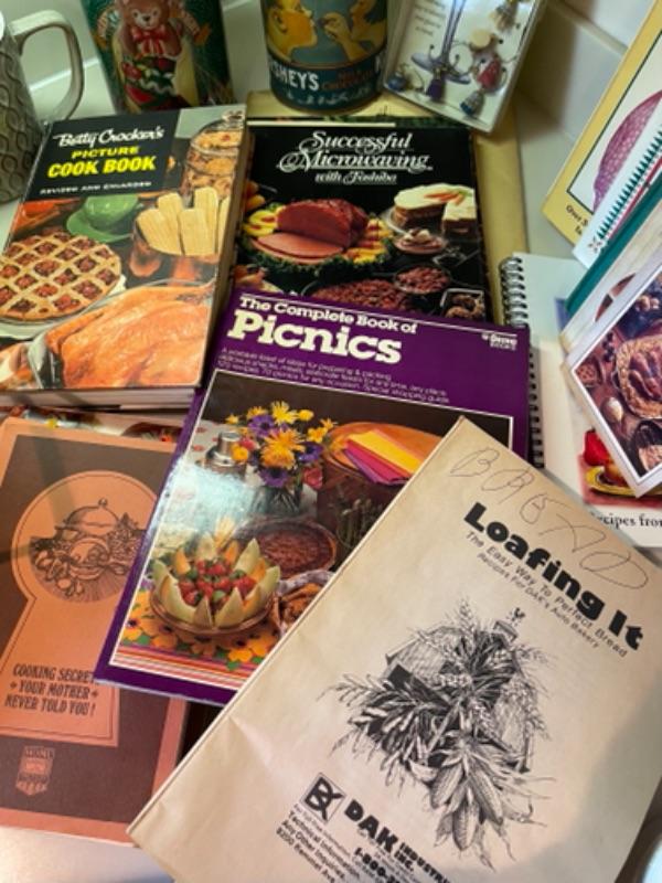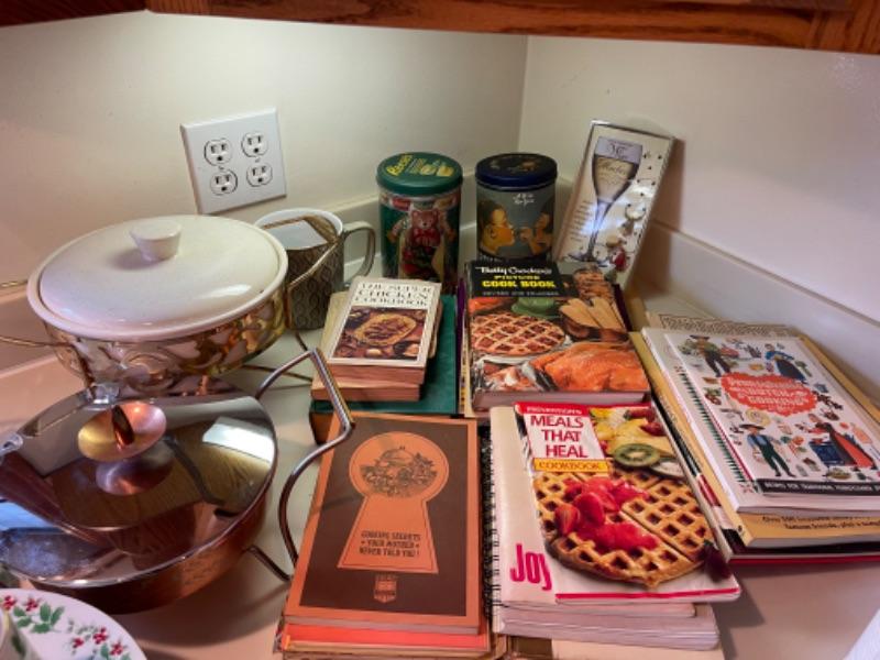 Lot 40. Kitchenware“”cookbooks, chafing dishes (mid-century Bauer), commemorative tins, wine clips, mugs--Was $85 - - Now $40
