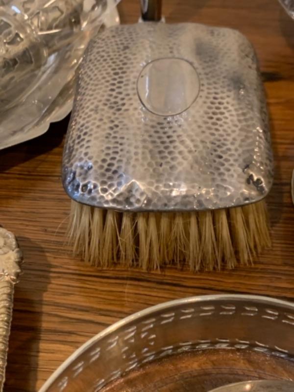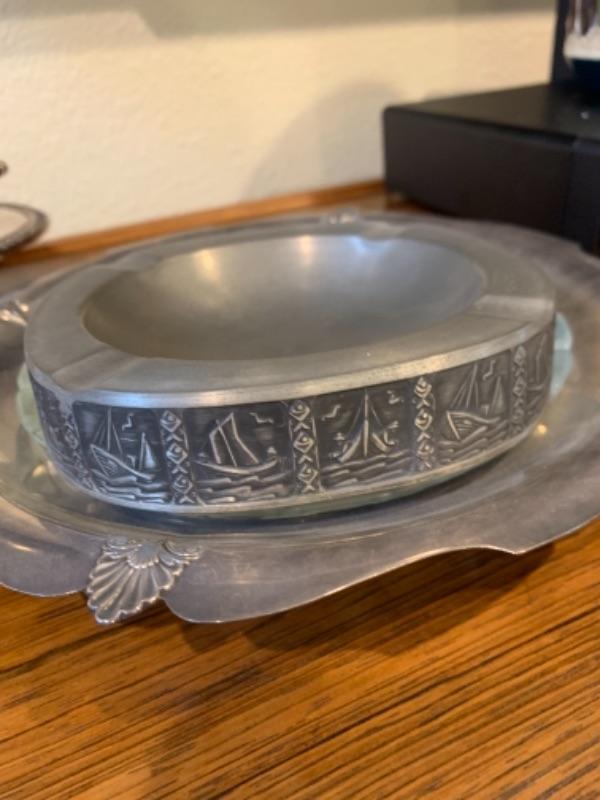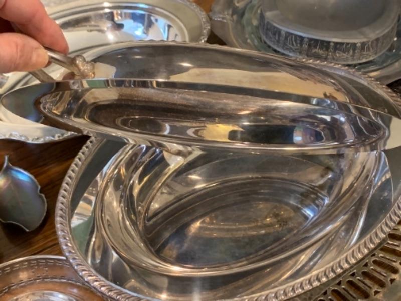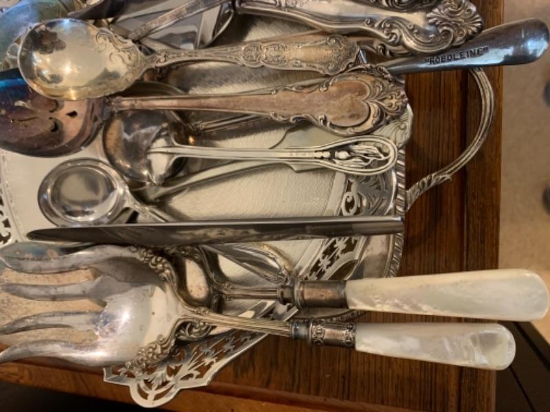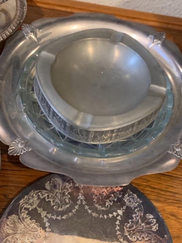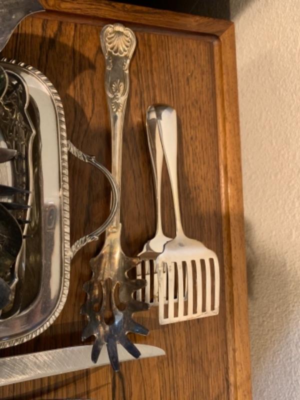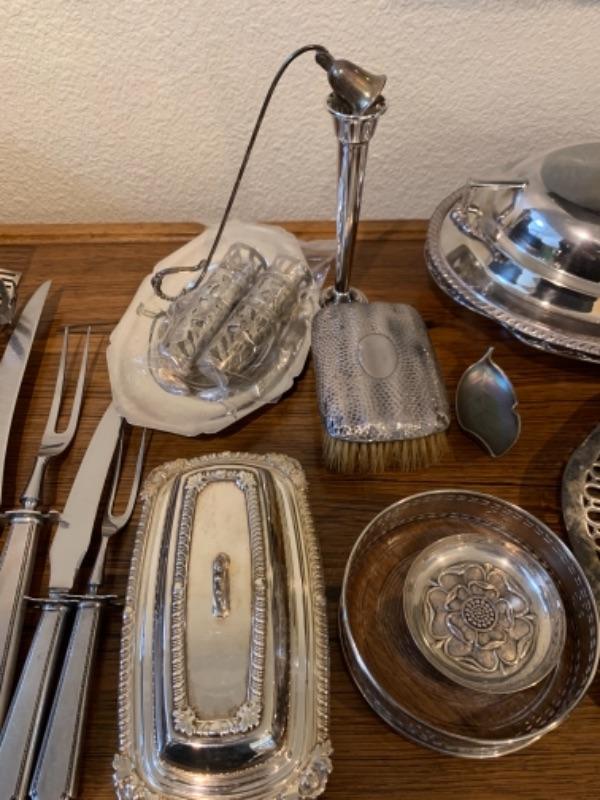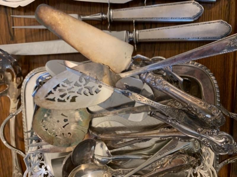 Lot 40. Large assortment of silver plate“”serving flatware, carving sets, serving trays, vase, butter dish, creamer, trivets, Selandia pewter ash tray, trivets, set of shot glasses, etc.--$375