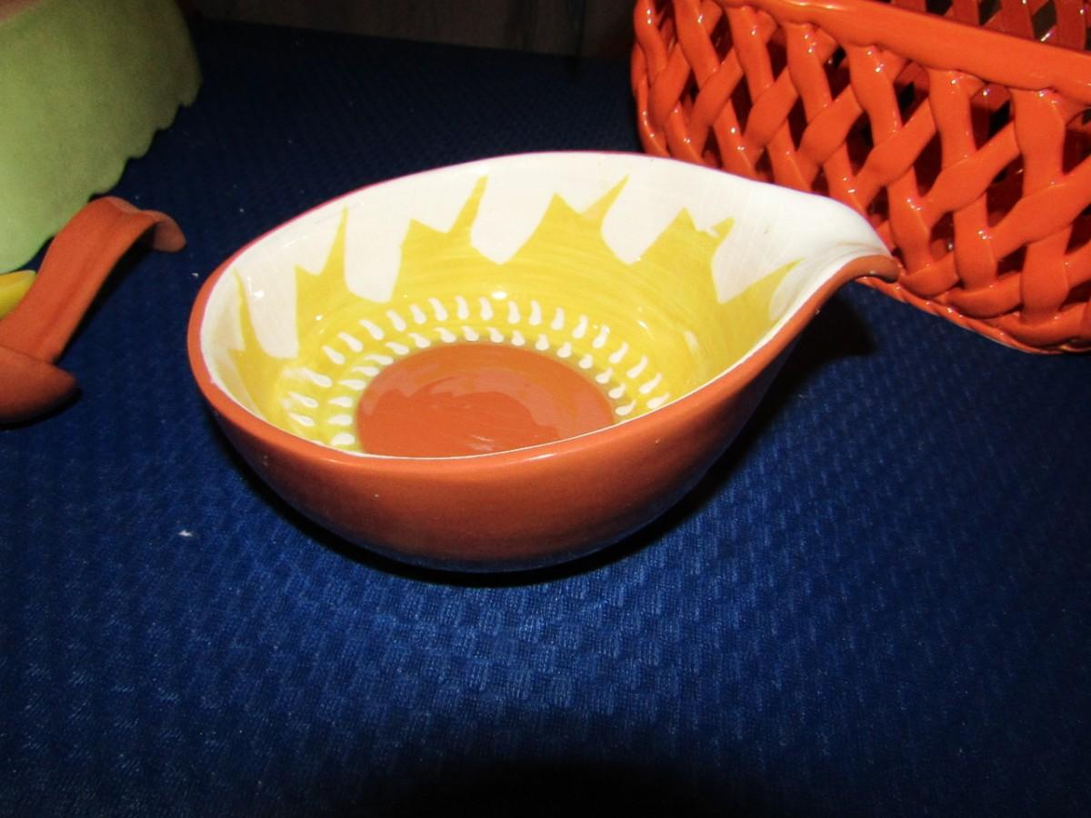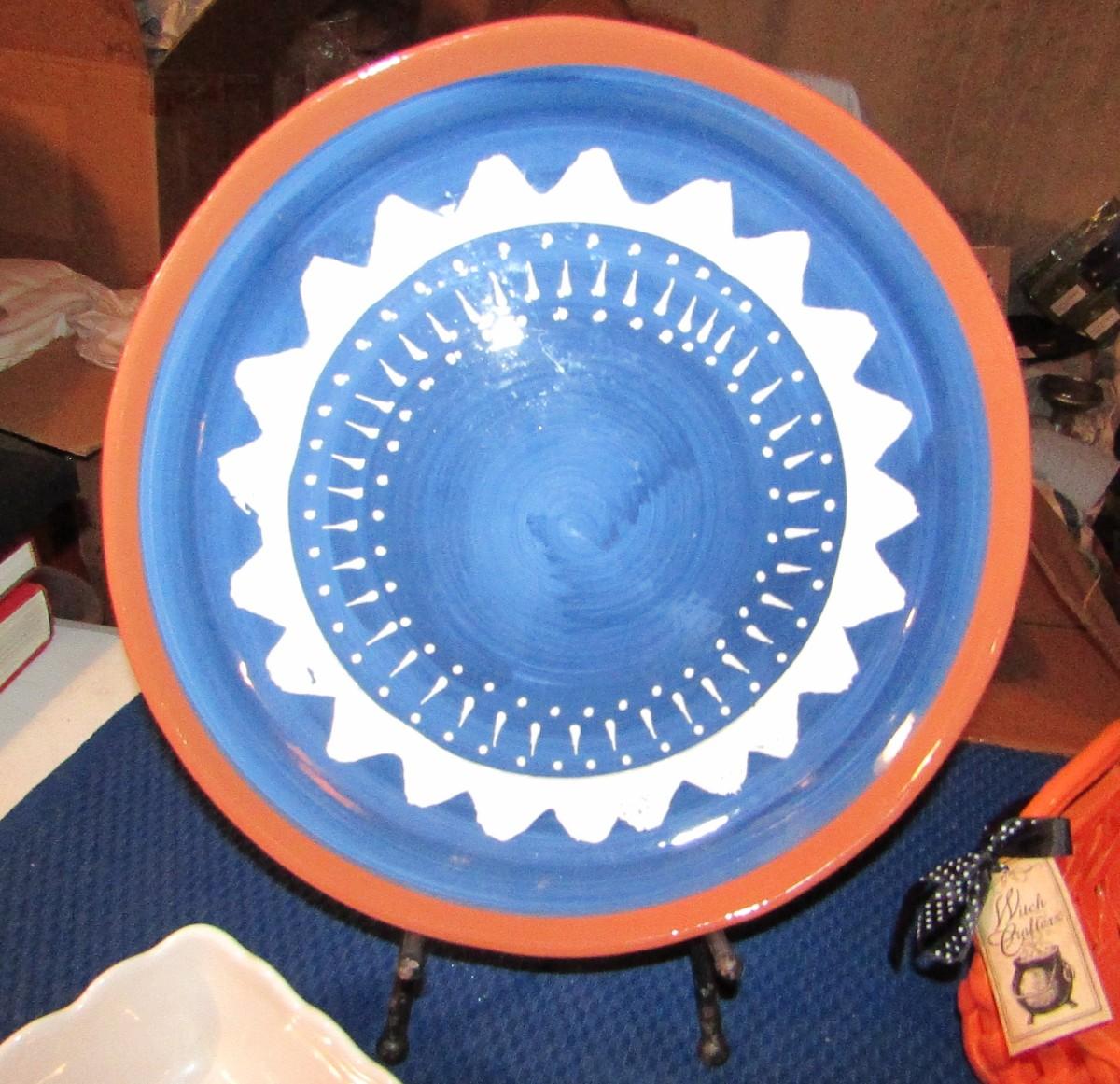 LOT 40 LARGE COLORFUL PLATTER, CASSEROLE DISH, WEAVED CLAY BASKET