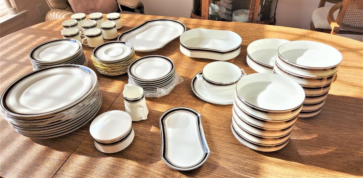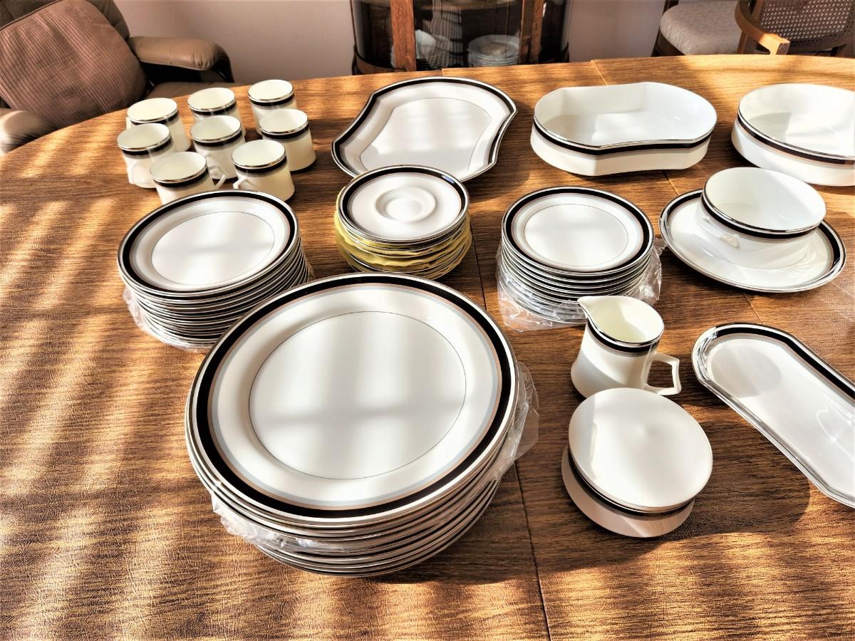 Large set of MIDASA dinnerware in the now retired "Noir" pattern (A4102) - platinum rims. Many of these pieces are still in the sleeves and look as though they have never been used. You get all you see here - 10 plates (10.25" across0, 11 soup bowls, Gravy/underplate, cream/sugar, 2 vegetable bowls, large and small platter, 10 salad plates, 10 bread/butter plates, 8 cups/saucers. This set was made from 1978-1988. Great condition.