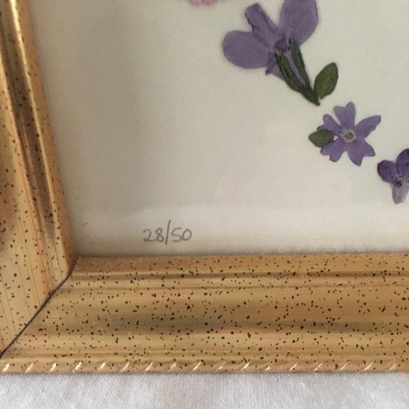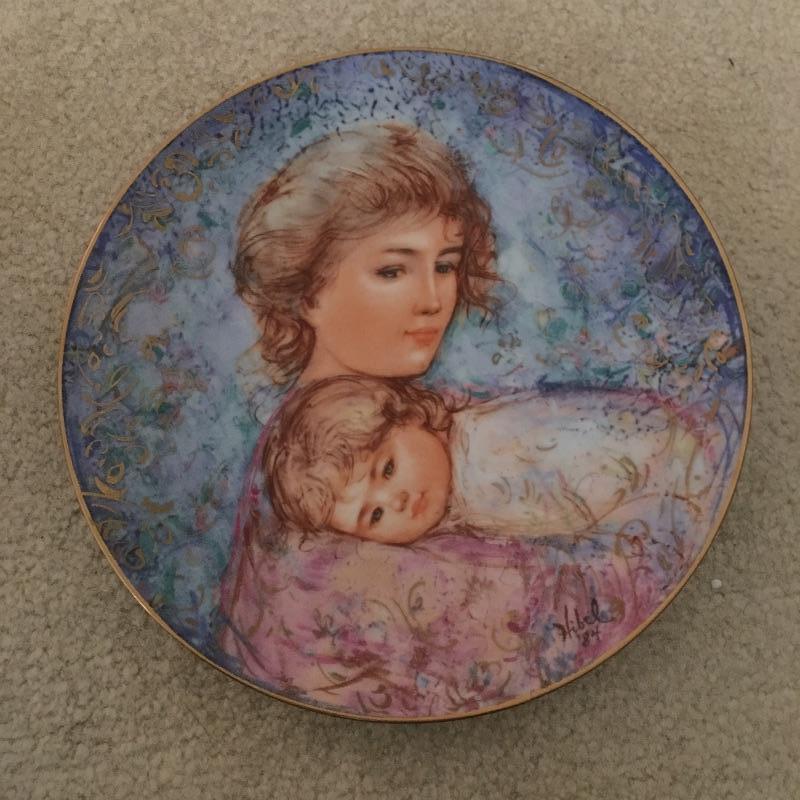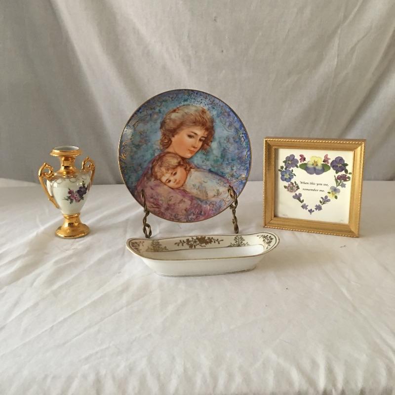 Lot includes Limoges vase with floral design, Knowles Collector Plate by Edna Hibel that is a numbered Mother’s Day plate, framed pressed flower artwork that is pencil signed and numbered and a hand painted dish. Plate measures 8.5”D.