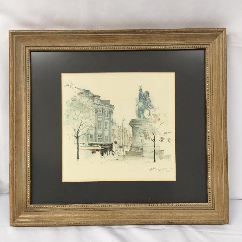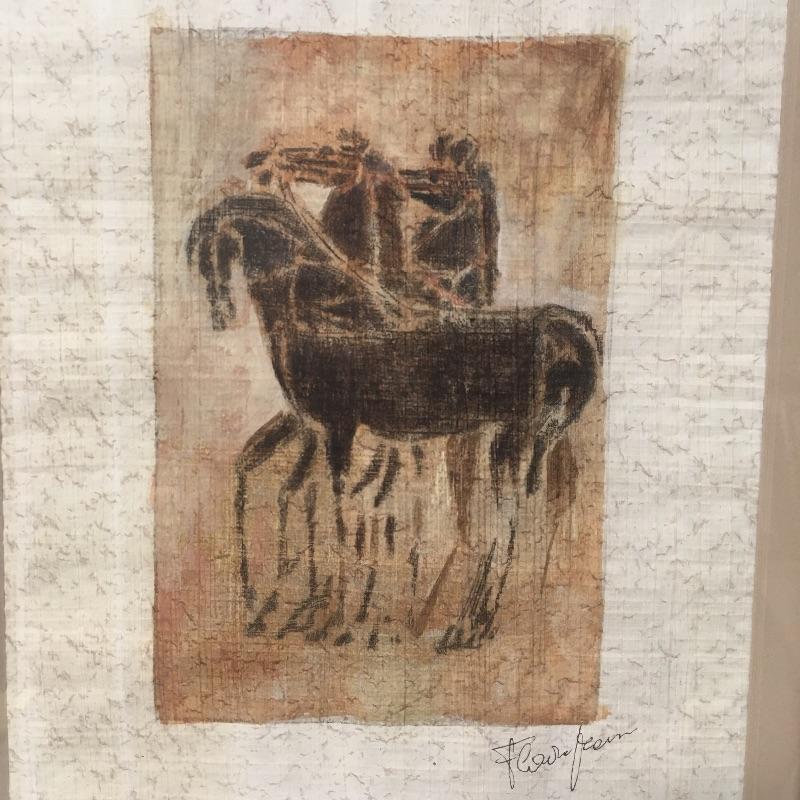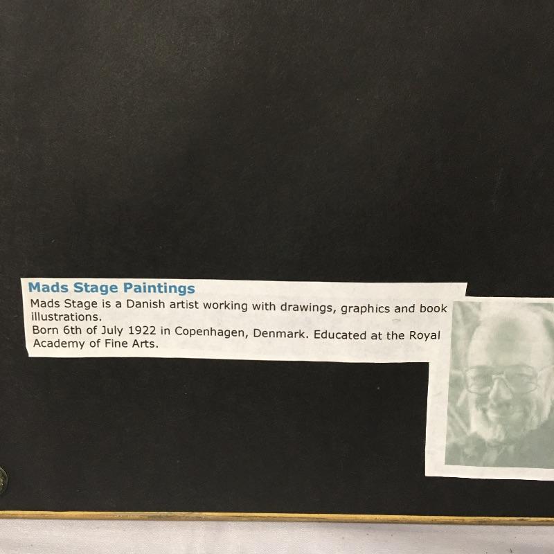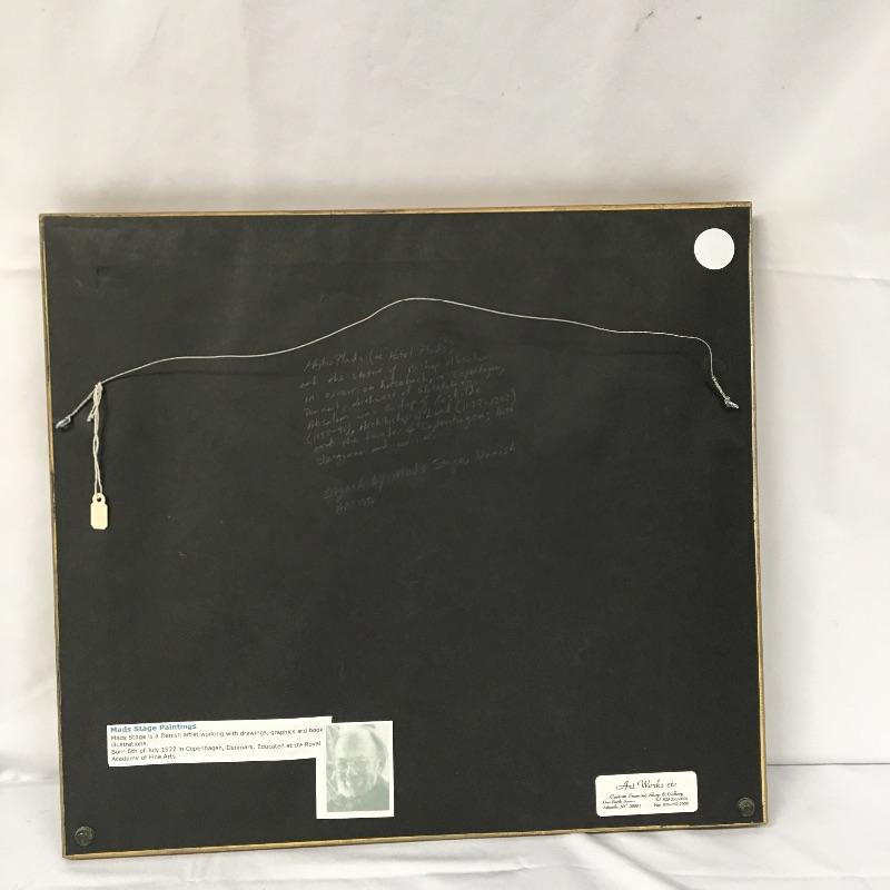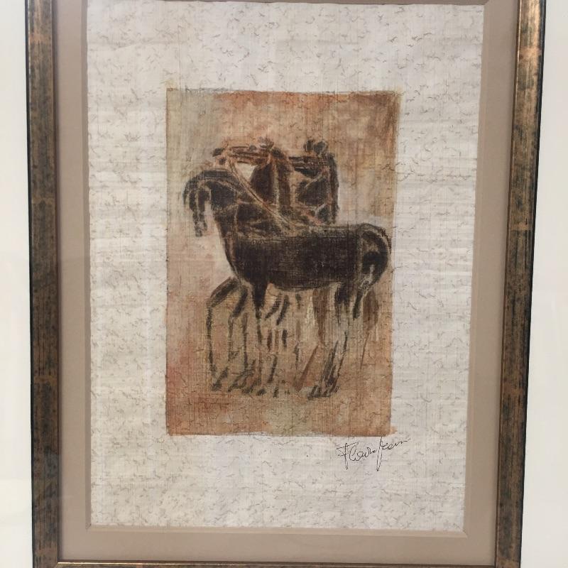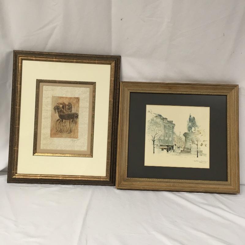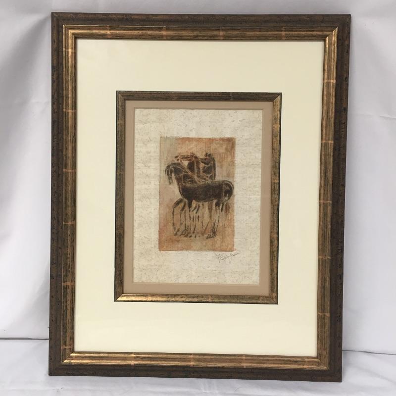A wooden framed and matted print that appears to be pencil signed print by Mad Stages. It has a bio on the back and is writing on the back explaining the art. We've also included a framed, matted and signed Equine artwork. Largest frame measures 15.25” x 19”.