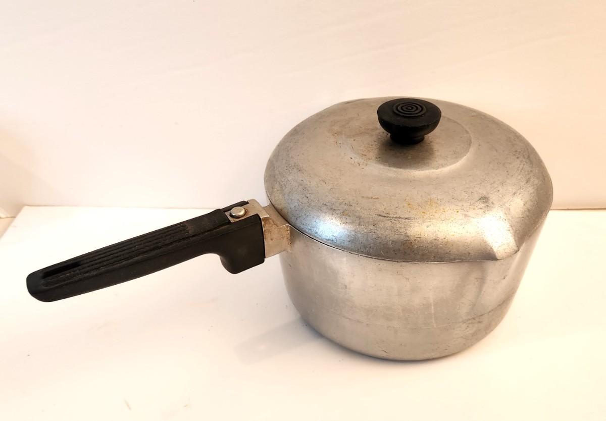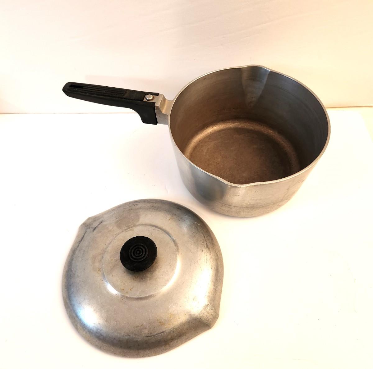 Vintage Magnalite double pour sauce pan with lid - good used condition - 4.5" tall, 15" long countin handle.