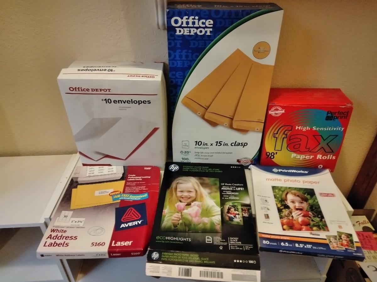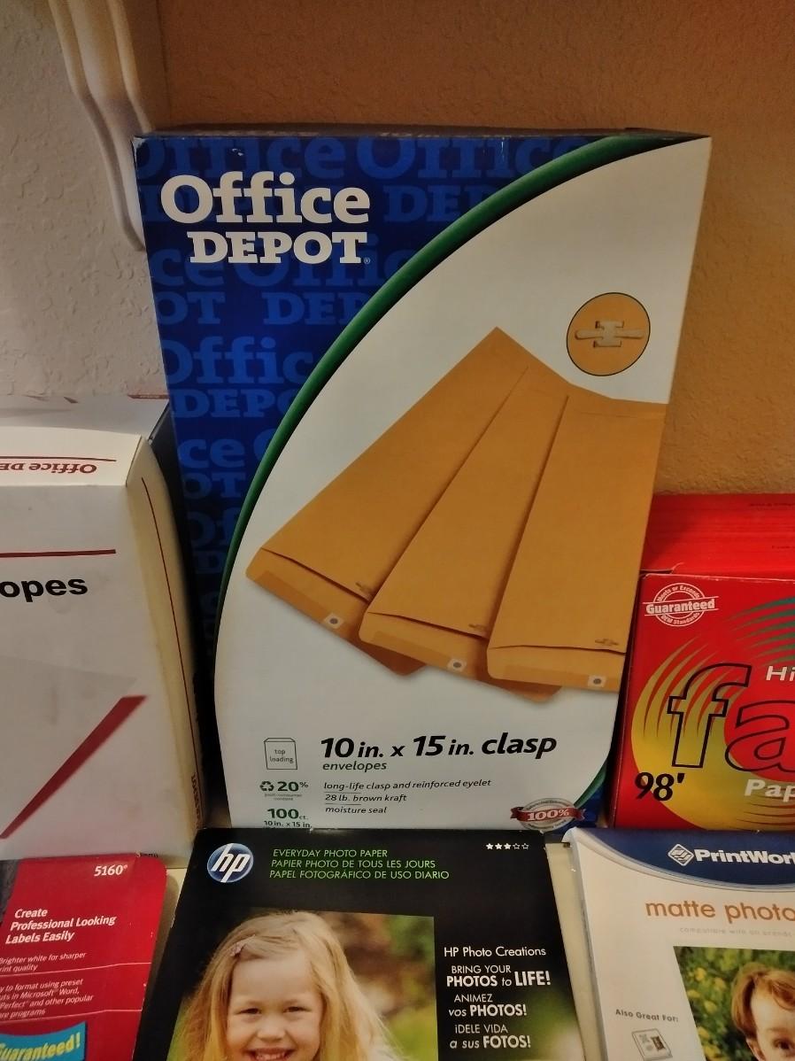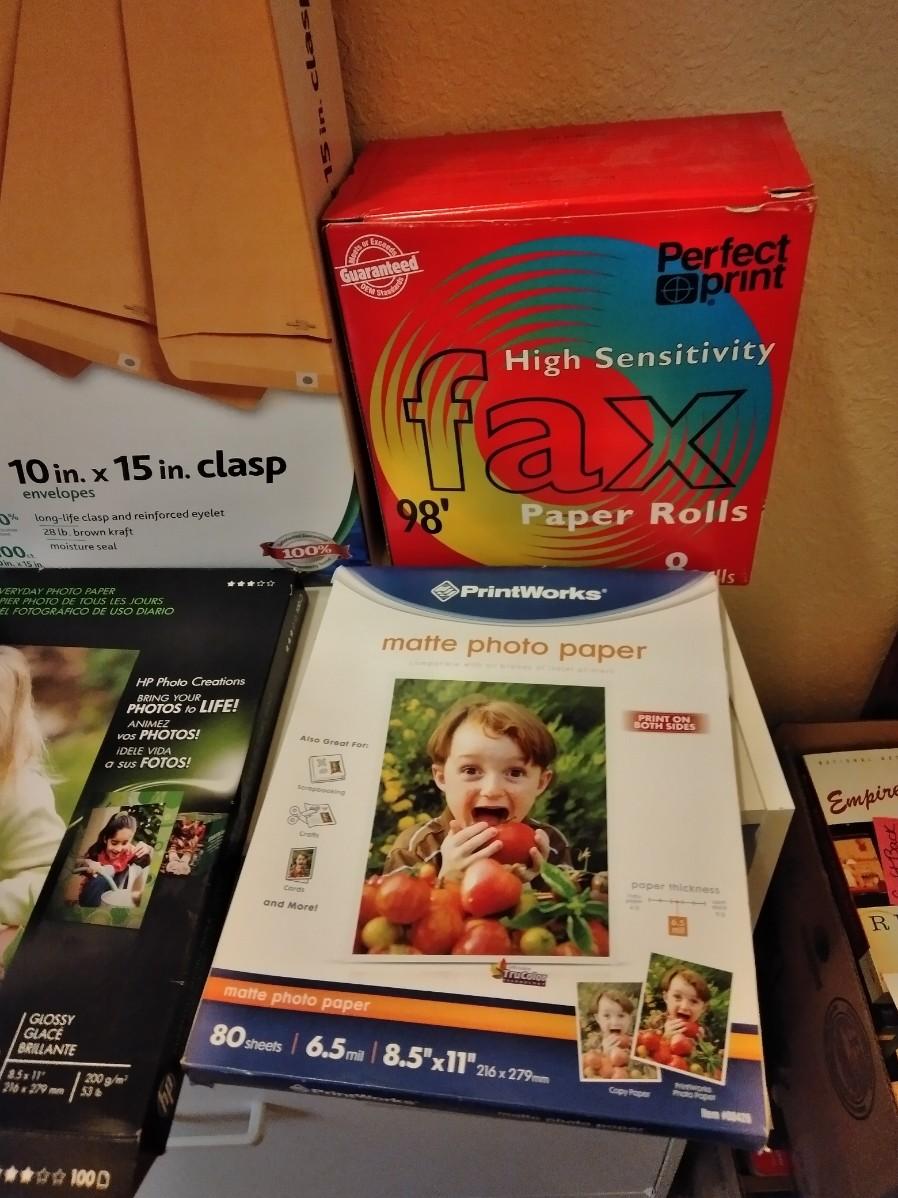MAILING ENVELOPES, 10" AND 10" X 15" CLASP ENVELOPES. PHOTO PAPER, AND FAX PAPER ROLLS.