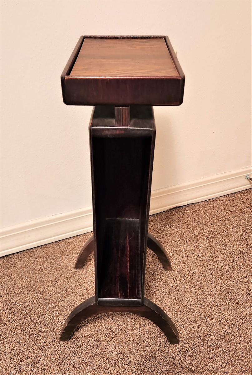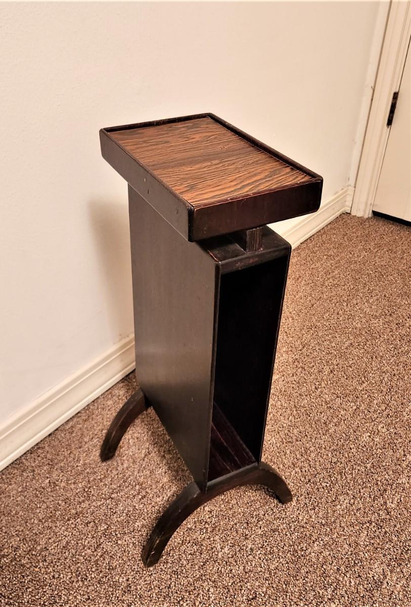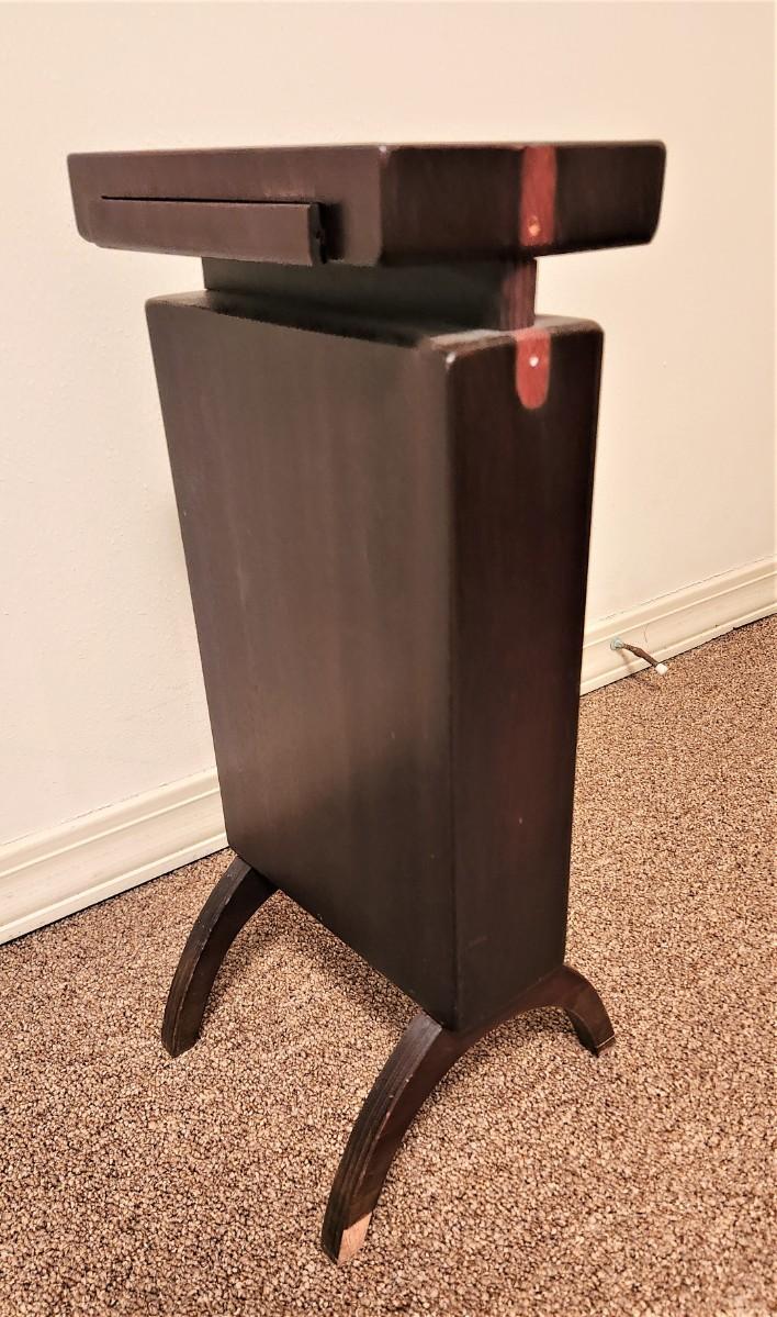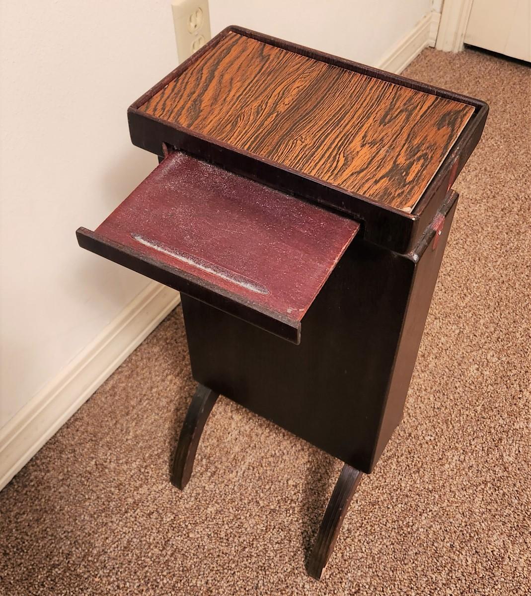 Cook 1960's phone stand, place for the phone book, a pull out section for your notepad or drink, etc. 23" tall, 10" deep. Note some damage at the bottom to leg - easy fix.