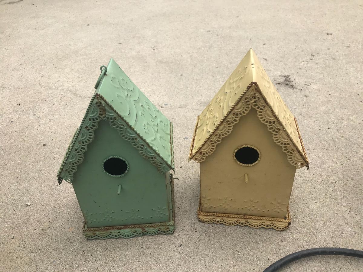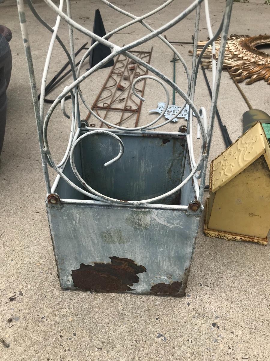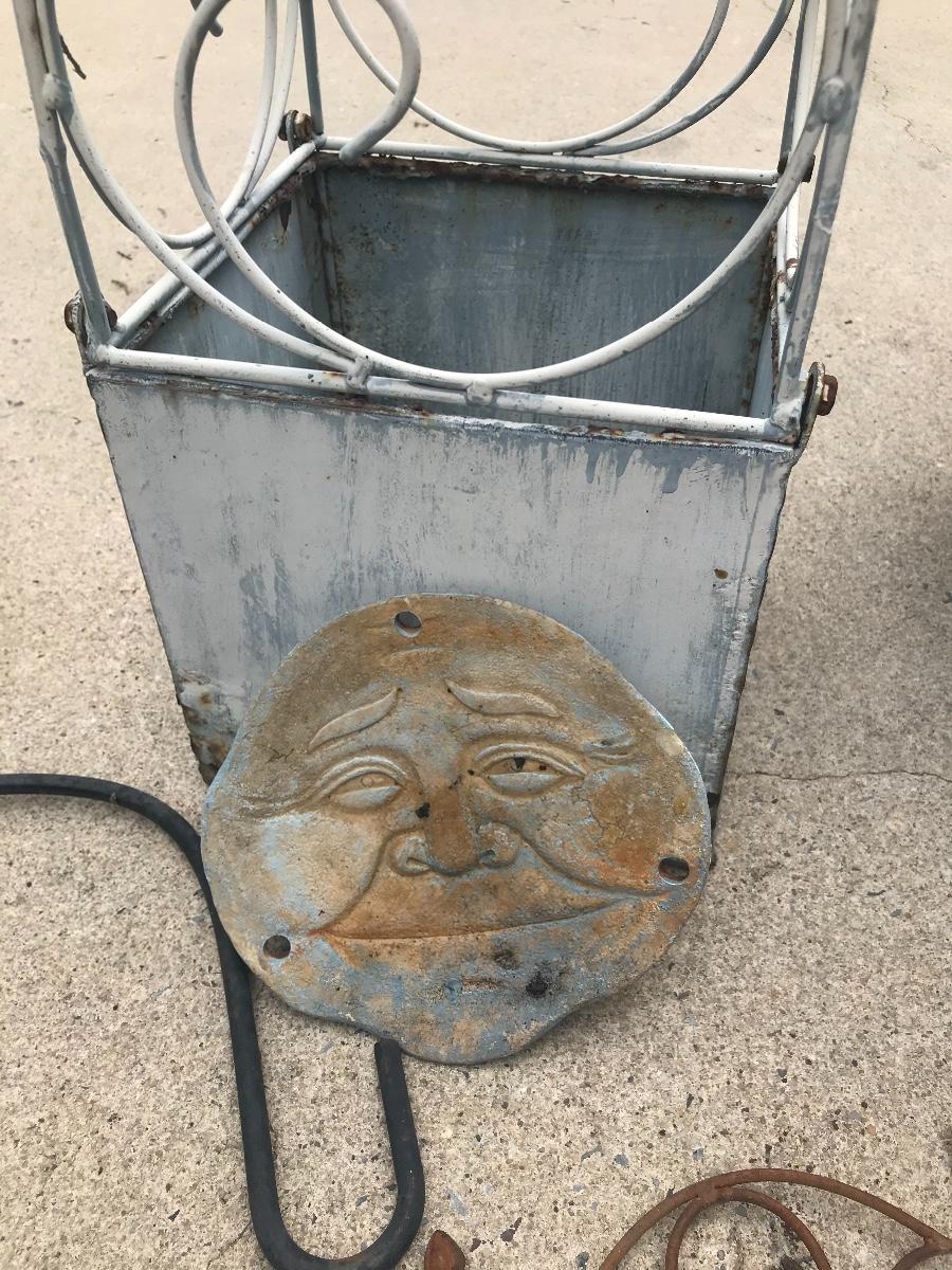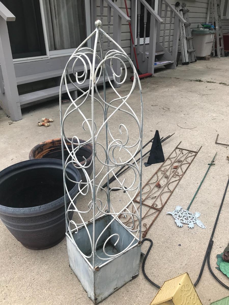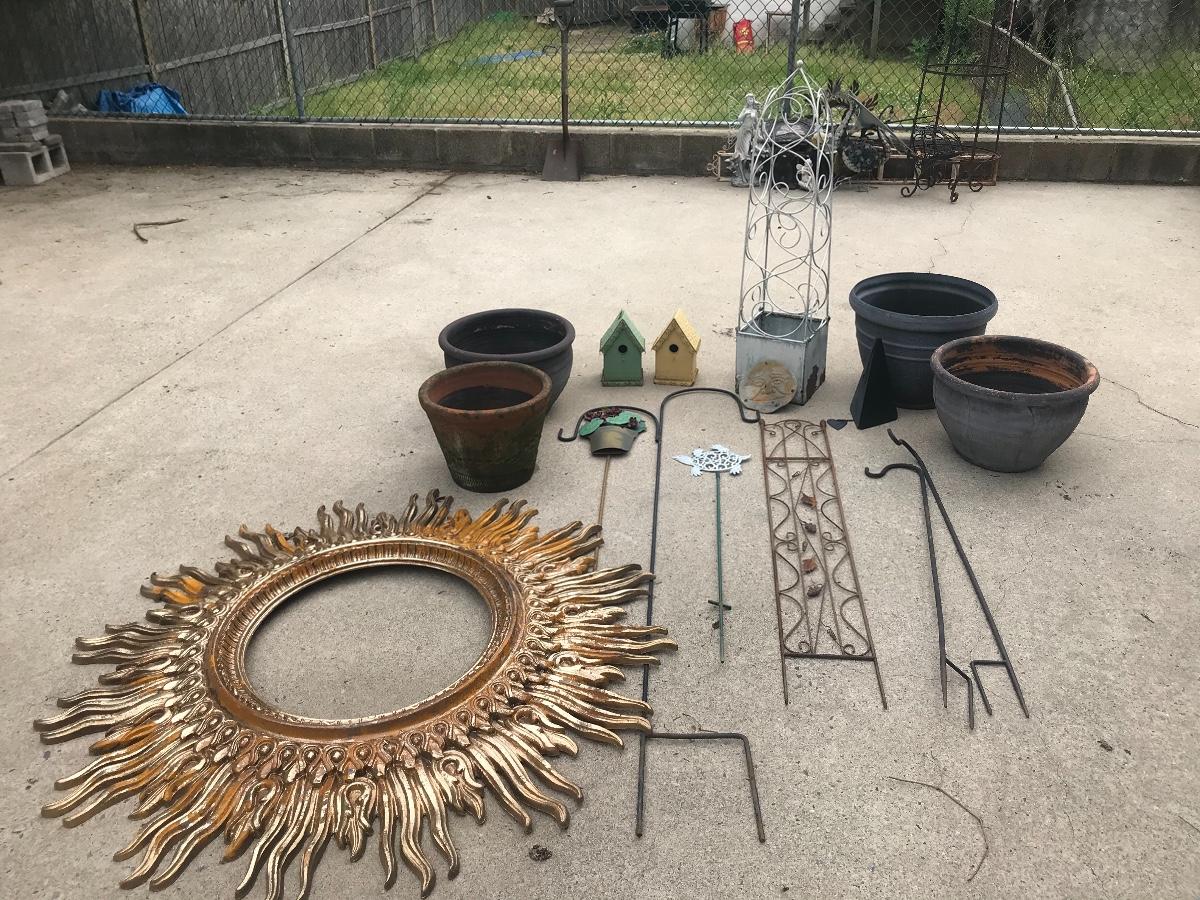 Terra cotta pots, bird houses, obelisk, trellis, shepherds hooks, decorative stakes, cast iron wind chime, and a golden, composite sun, 47 inches. Please see all pictures for content of the lot, condition of the lot, and measurements if taken. Pictures are the best representation of the items listed and items are untested unless indicated in description. Thank you for looking and have fun bidding!