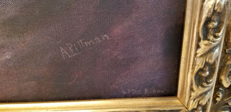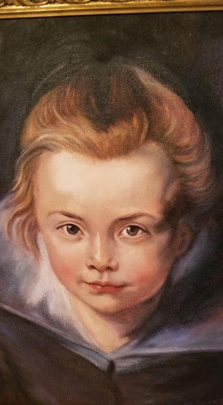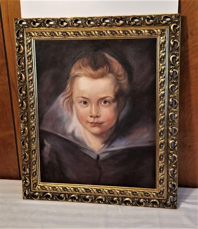 This oil on canvas is signed by A. Pittman and noted "after Rubens." Portrait of a young boy - a contemporary copy of the one done by noted artist Peter Paul Rubens. Framed. Good condition. Tag on back notes the local gallery it was purchased from. Measures 25" tall, 21.5" wide.