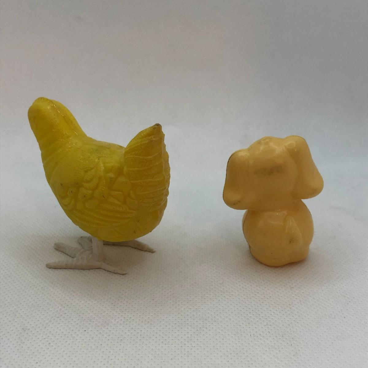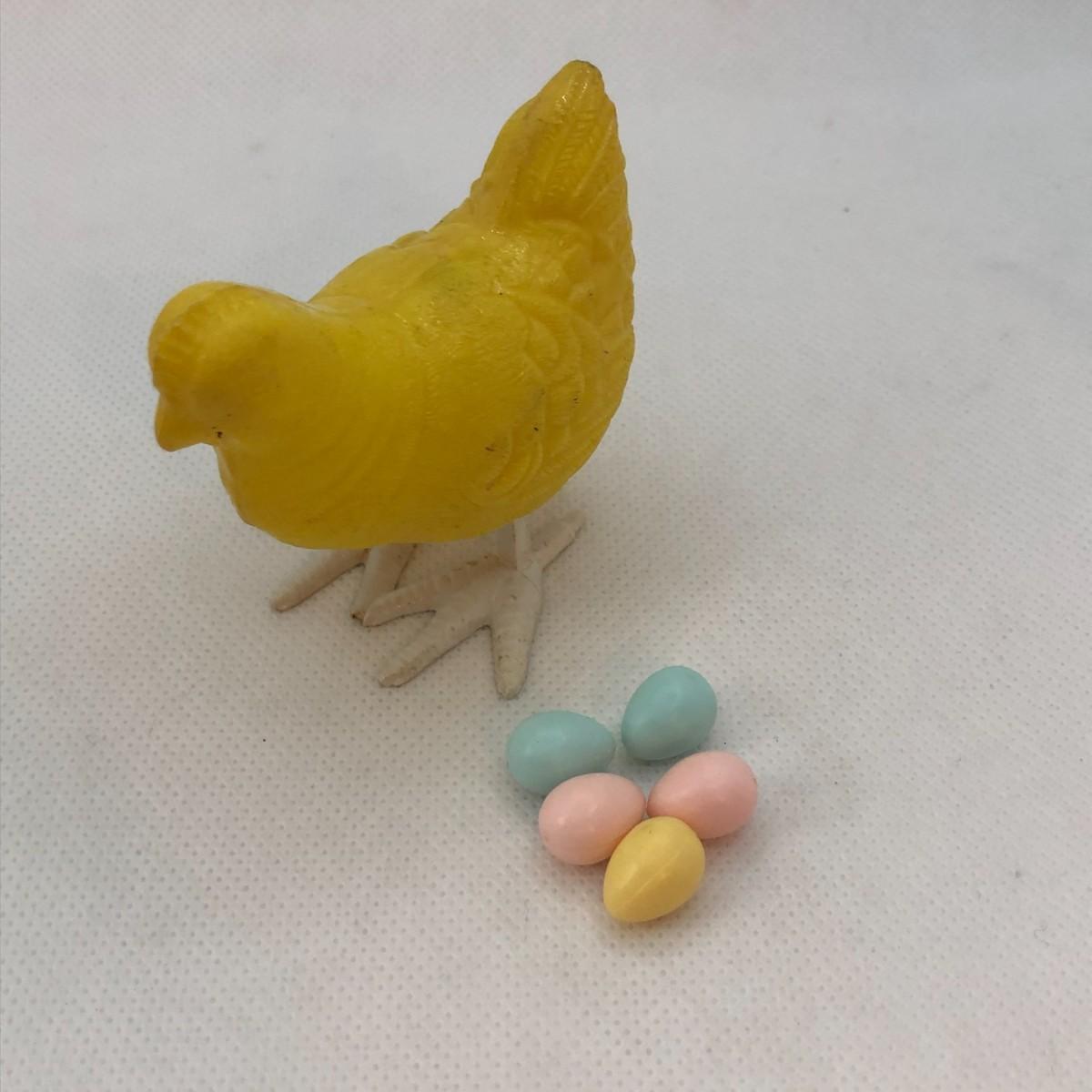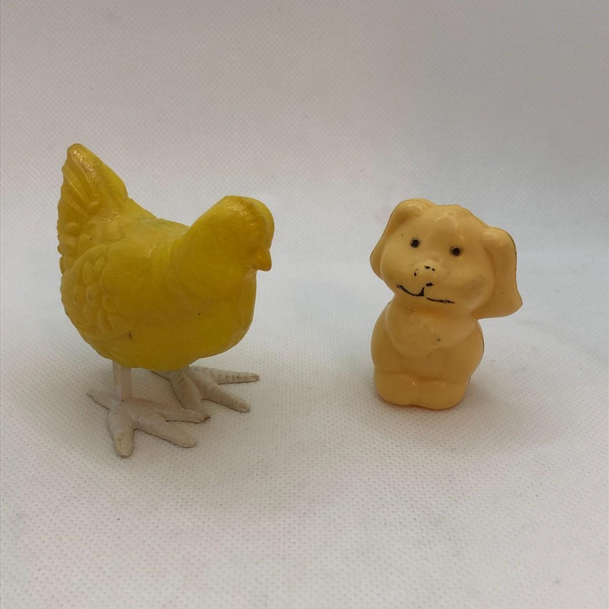 This vintage chicken is in great condition and still has five of her eggs. When you press down, she lays an egg. She is about 2.25" tall. There are no identifying marks on the plastic dog.