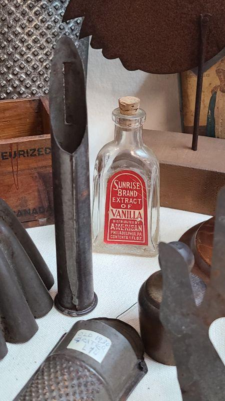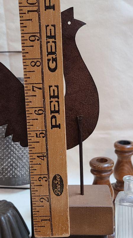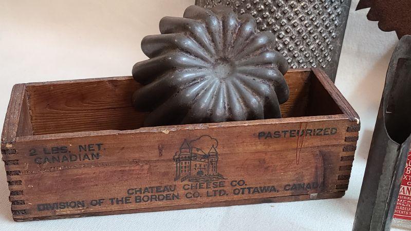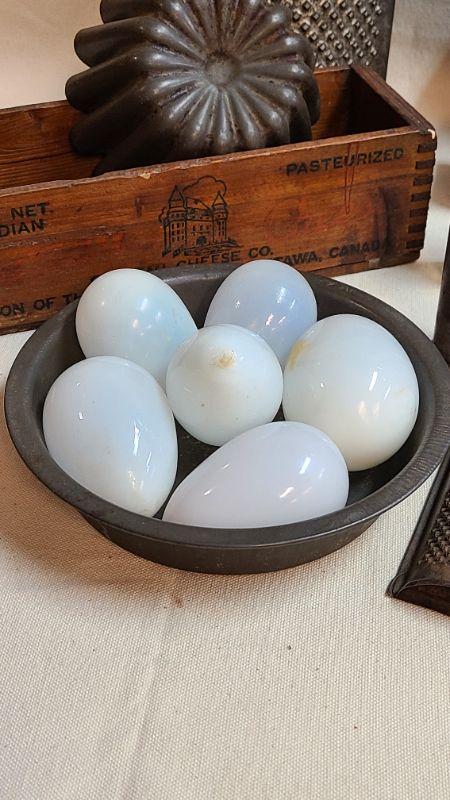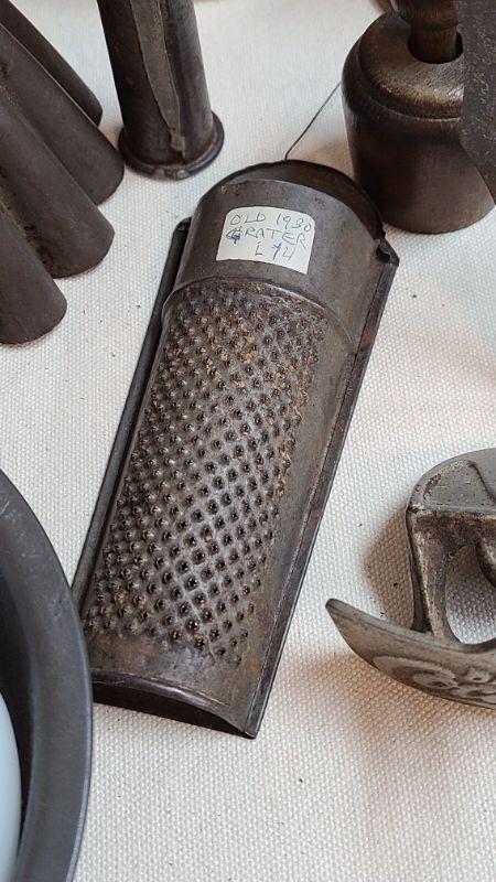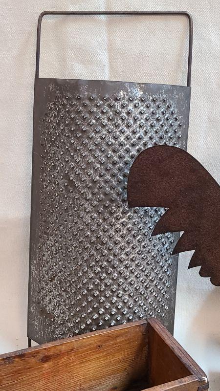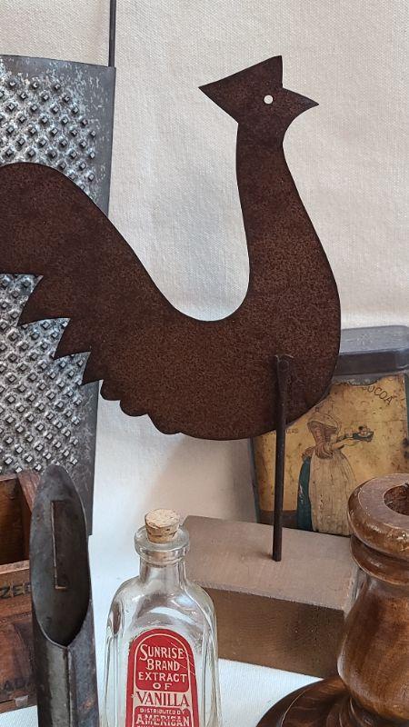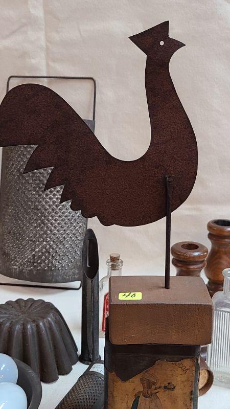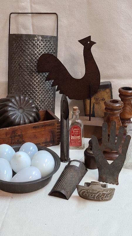 Handblown glass eggs, galvanized mini pie plate, cheese box, tin rusted rooster, mini grater, glass bottles and more. Please see all pictures for condition of the items listed and what is included in the lot. Pictures will also show any measurements if taken and is the best representation of the items. Thank you for looking and have fun bidding! We appreciate Treasure Hunters!