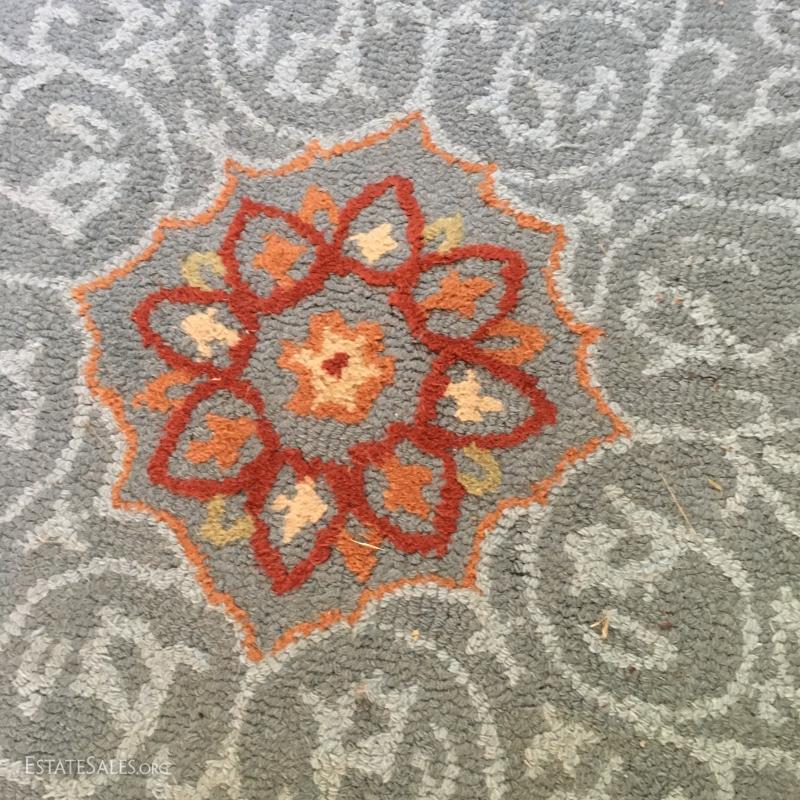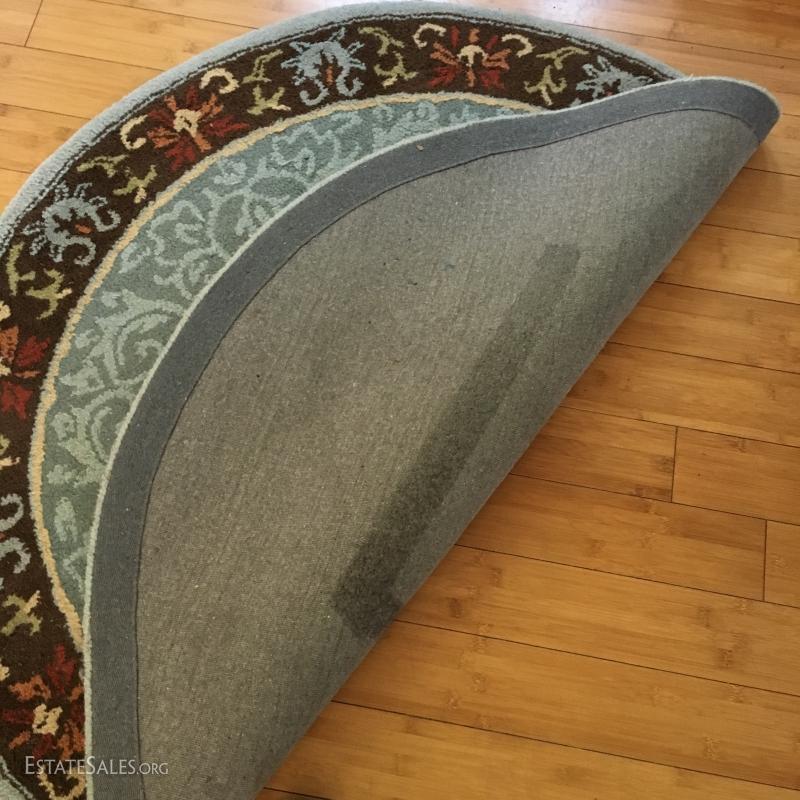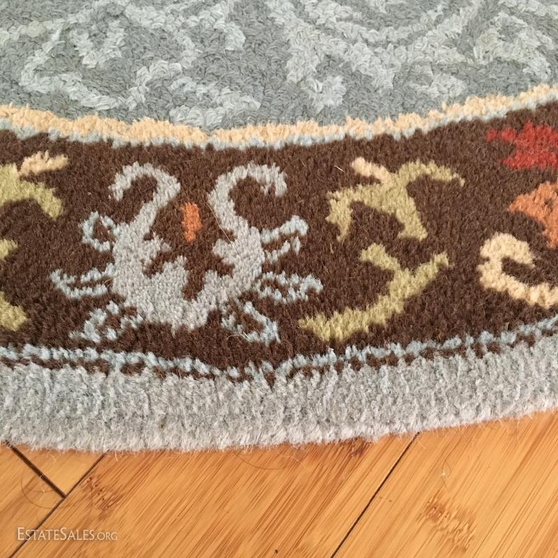 Thick piled country blue colored rug with browns and oranges. Measures 48" diameter. This lot is available for local pick up in Mills River, NC only.