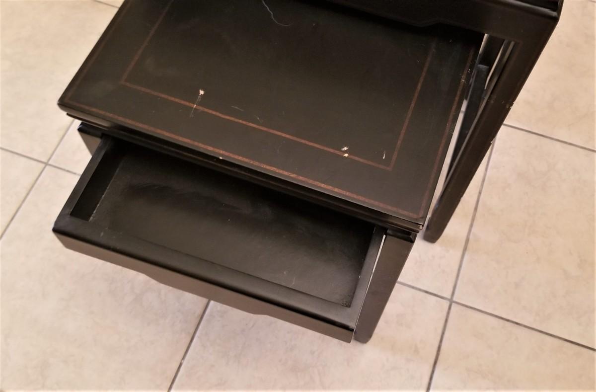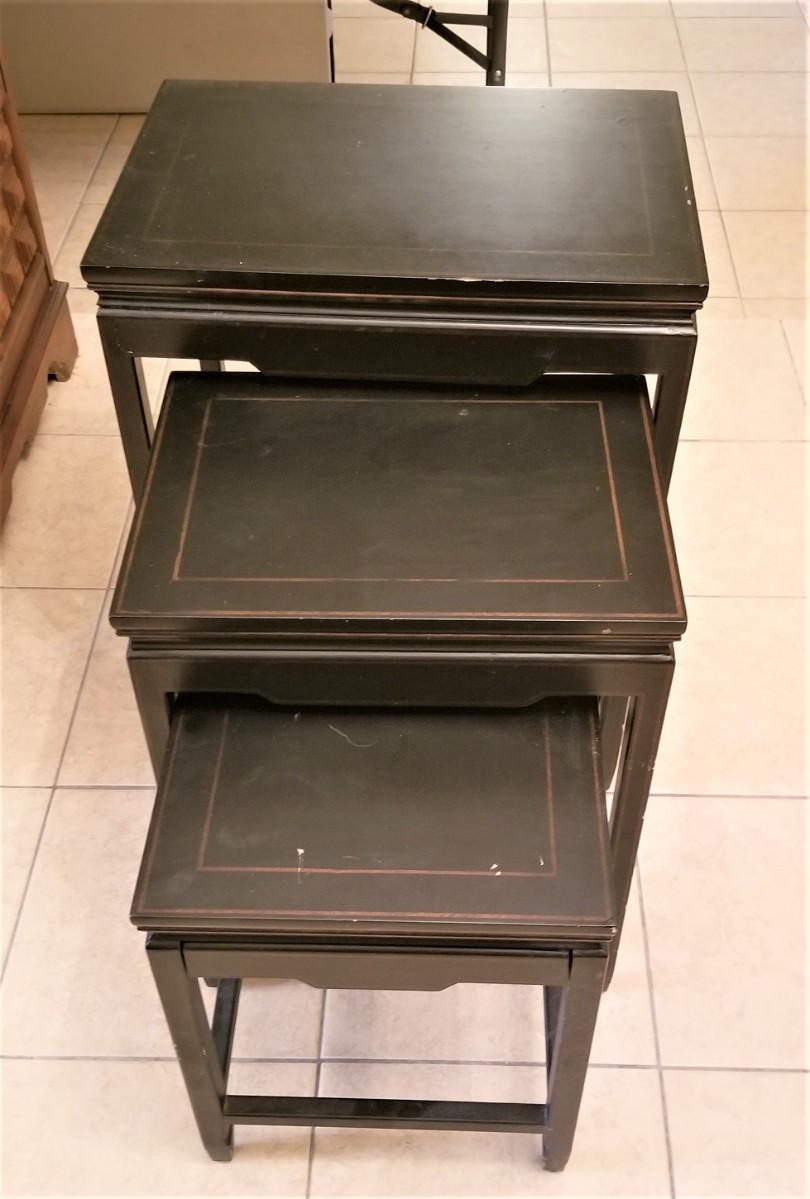 Gently used condition - smallest has a drawer. Largest is 20" across, 14" deep, and 26.5" tall. The others tuck in comfortably beneath.