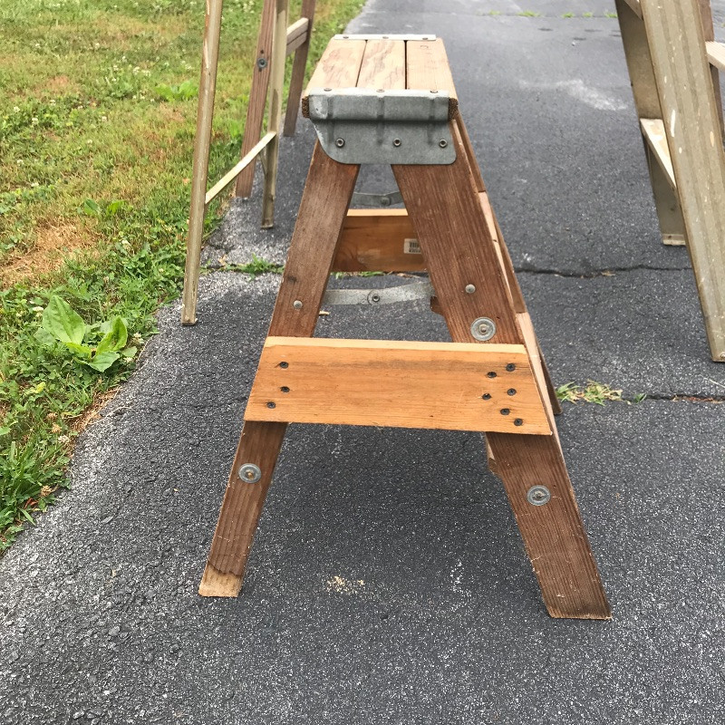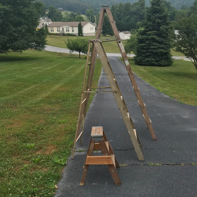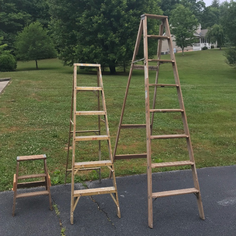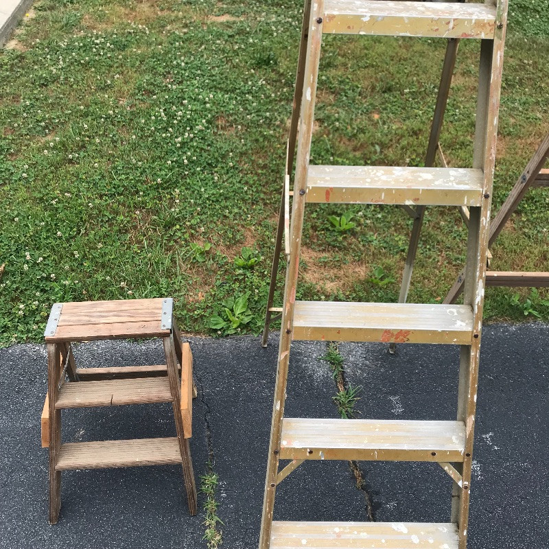 A ladder for any height job you have with this trio. Two are wooden and one is aluminum. The tallest is a wooden 8’ ladder with some mildew present, see images. Next is an aluminum