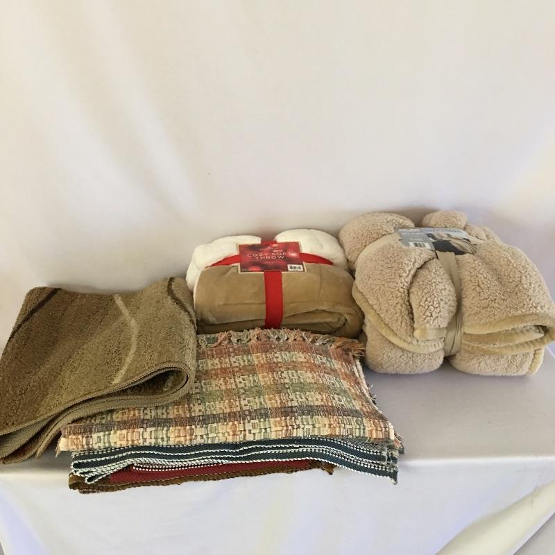 Stay cost indoors with this collection of throws and rugs. Our lot includes two throws that appear to be new, and six door mats and two throw rugs. Get all warm and snuggly with these lovely throws and blankets.