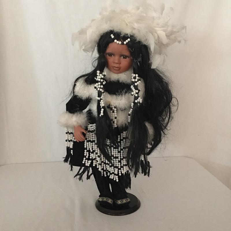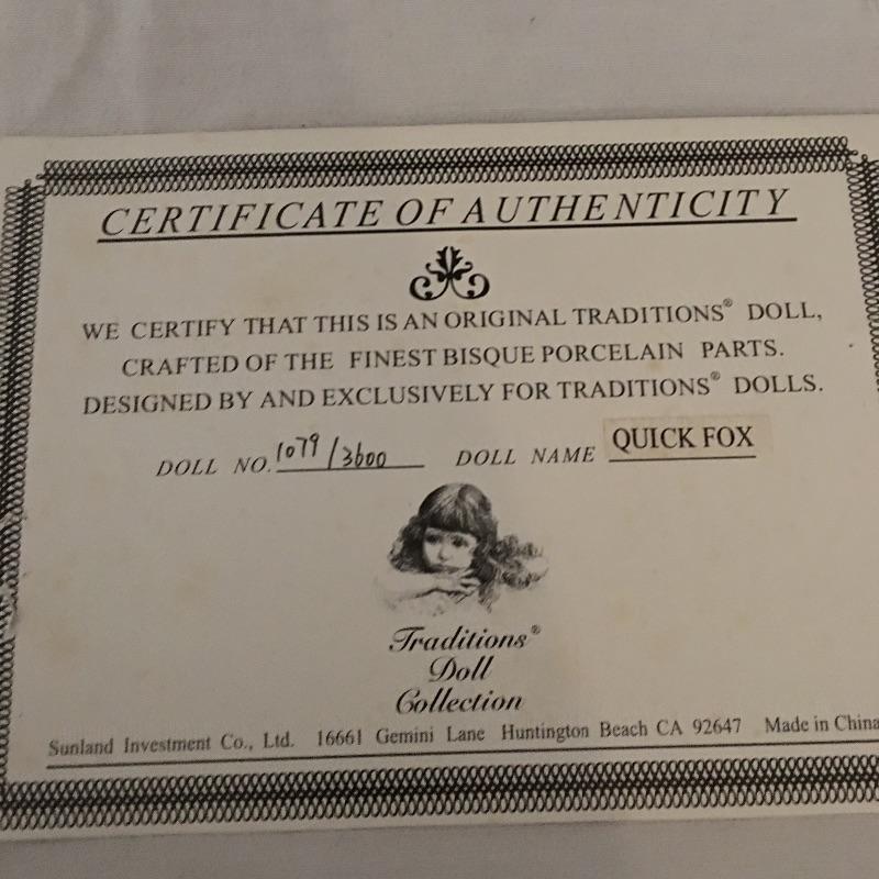 This Traditions doll is titled Quick Fox and is crafted of the finest bisque porcelain parts. Doll measures 20” tall. This attractive girl comes with COA, see images.