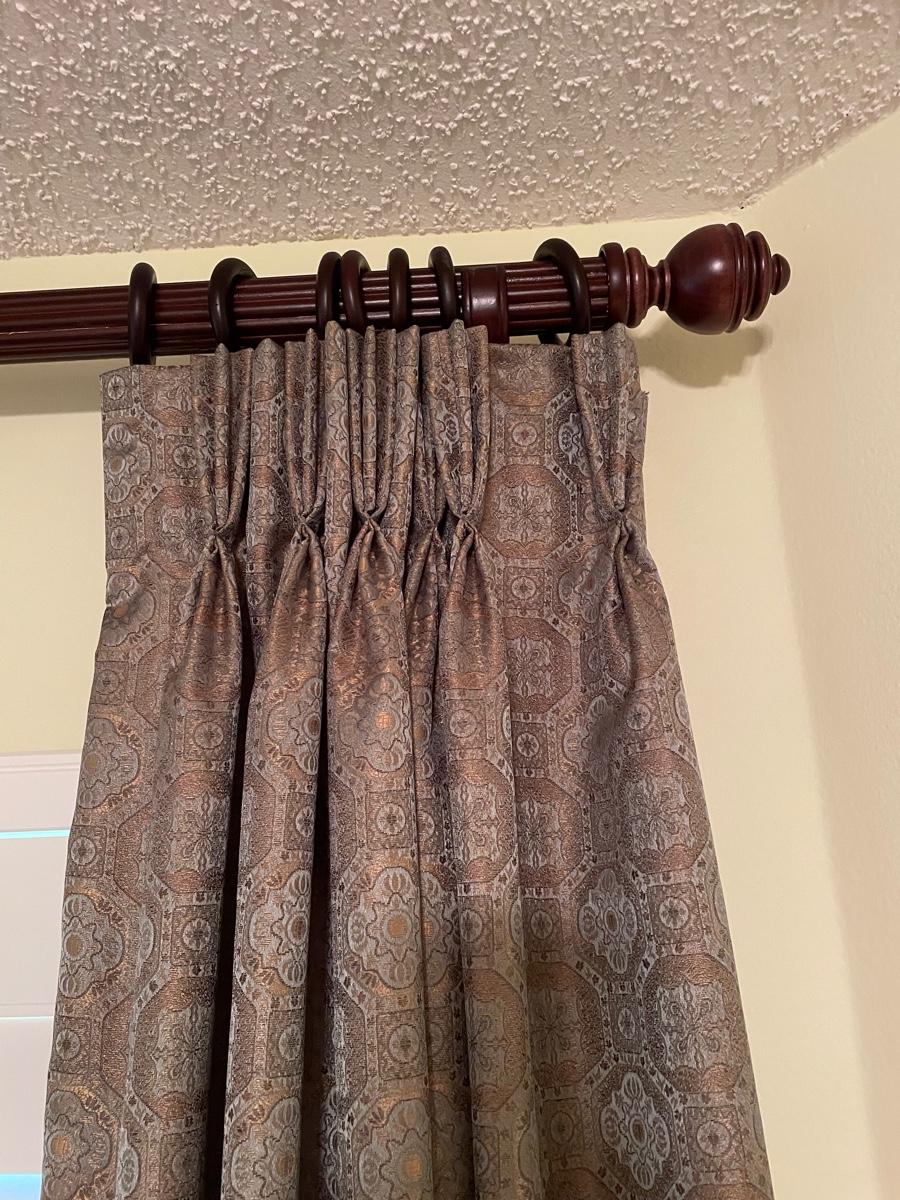 Two pair of single-width lined and pleated drapery panels measuring 52' wide X 87" long in taupe and aqua brocade fabric