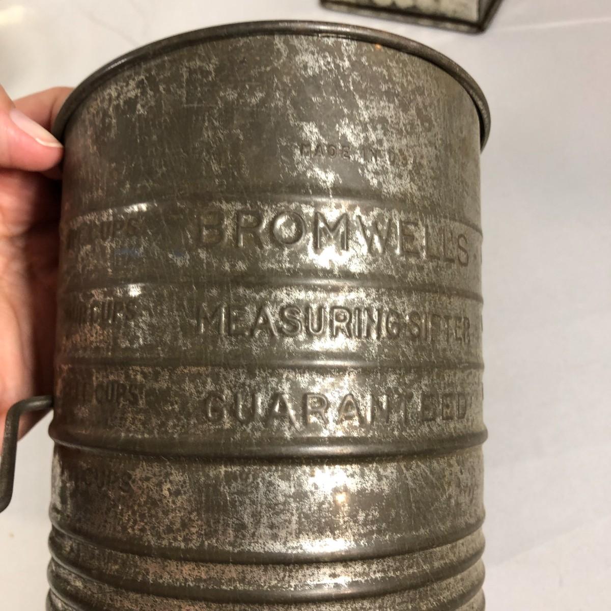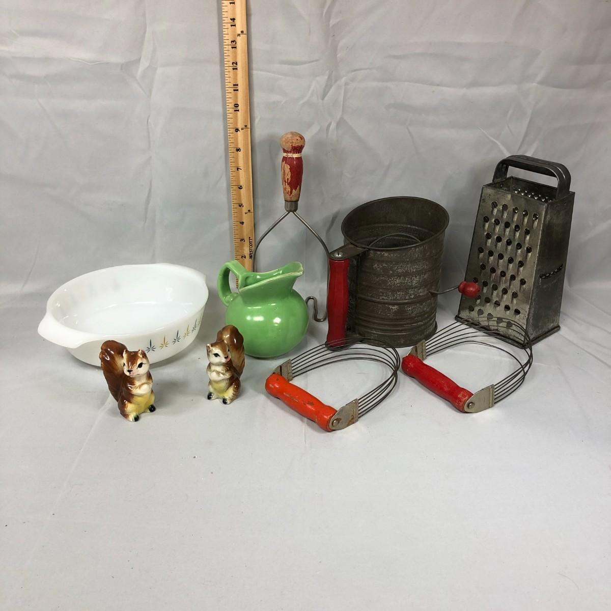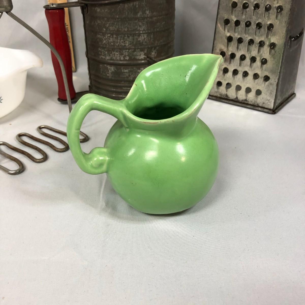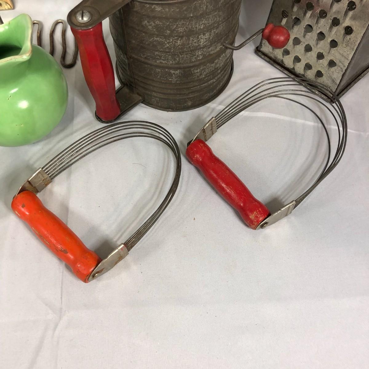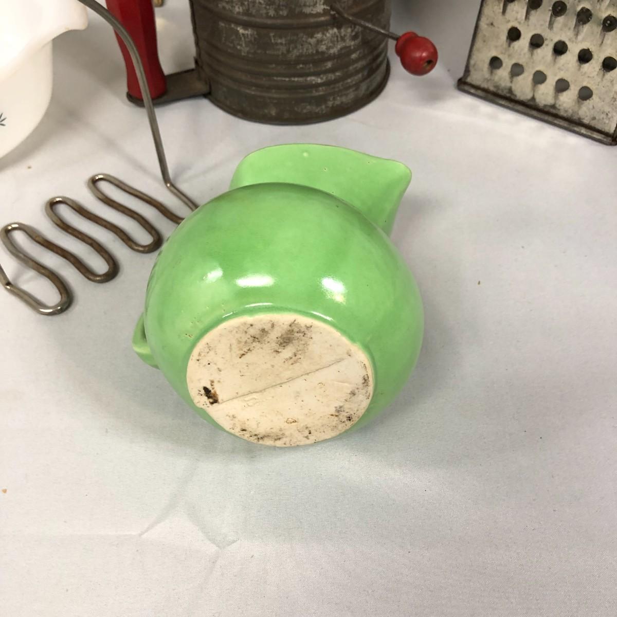 All of these pieces are in great condition. You can take care of cooking from the mixing to the seasoning to the baking! The red handle on the Bromwell's 5 cup sifter is in beautiful condition! I don't know the maker of the green ceramic pitcher, but it is a heavy ceramic.