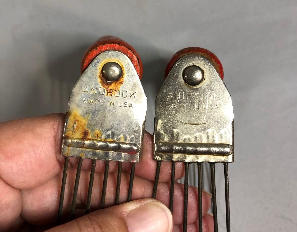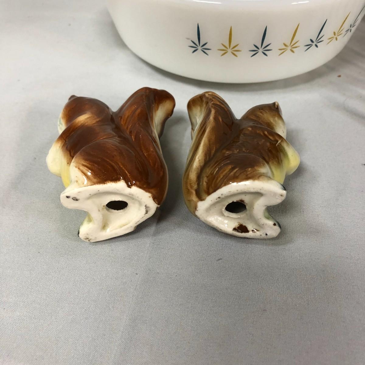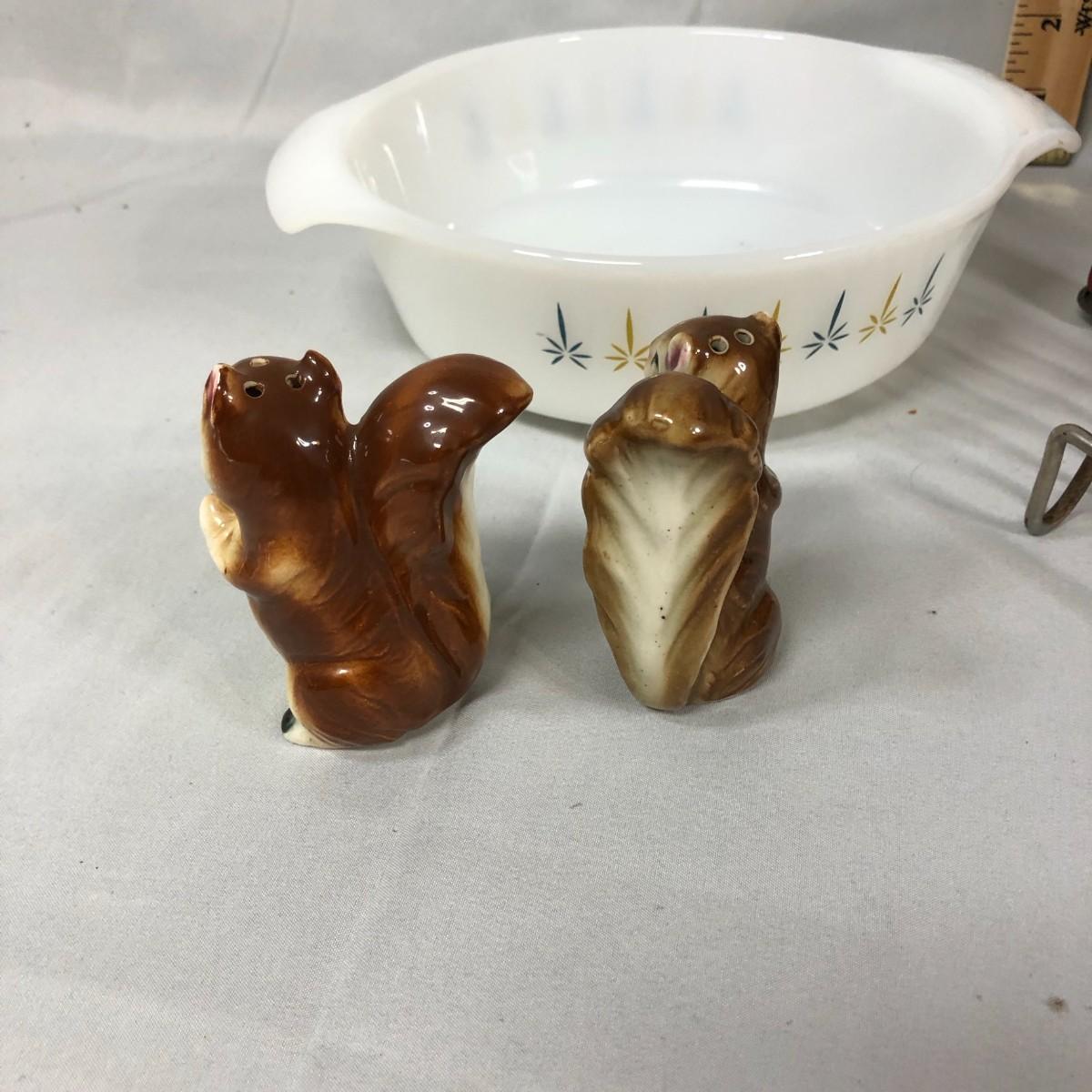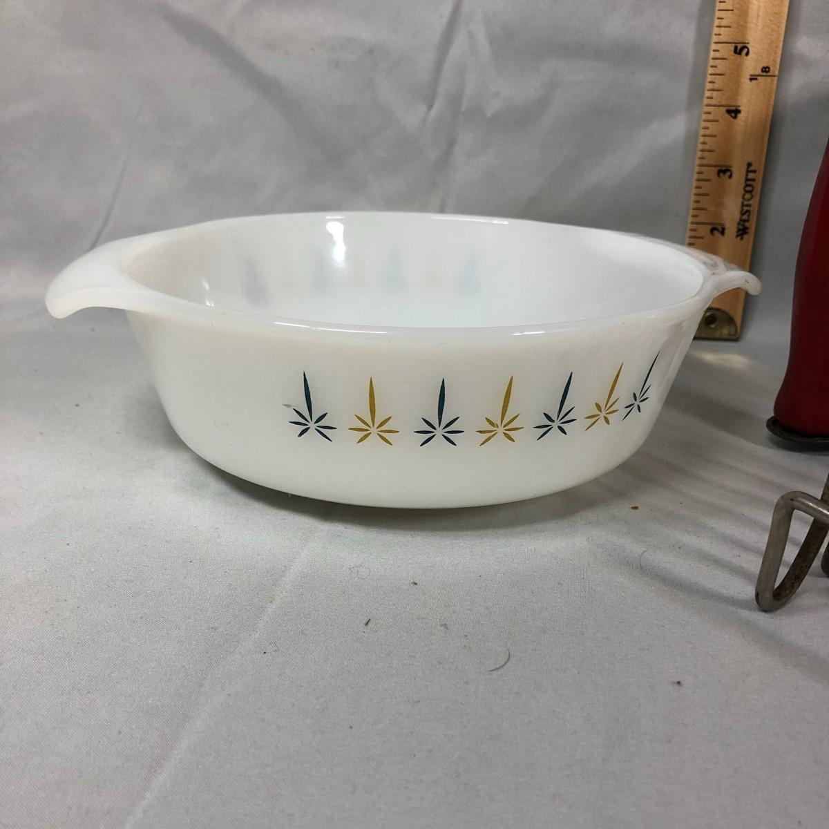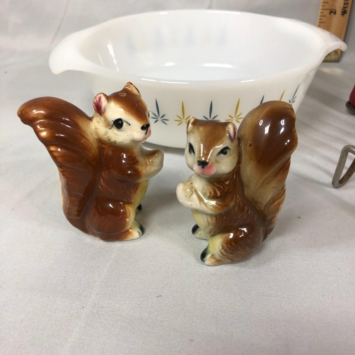 All of these pieces are in great condition. You can take care of cooking from the mixing to the seasoning to the baking! The red handle on the Bromwell's 5 cup sifter is in beautiful condition! I don't know the maker of the green ceramic pitcher, but it is a heavy ceramic.